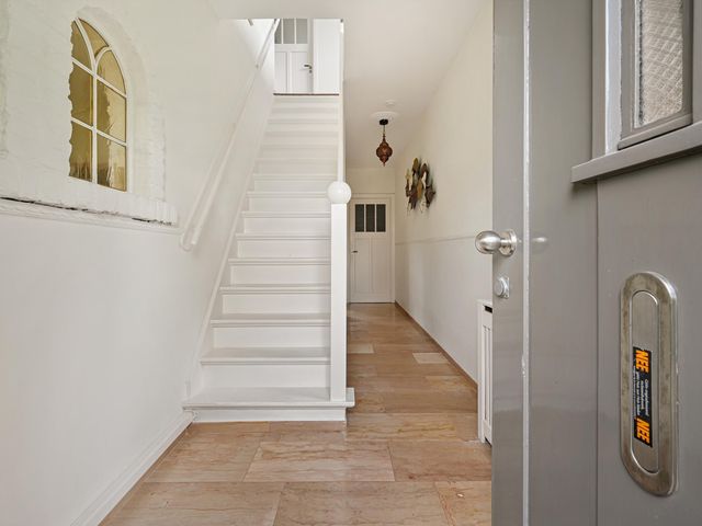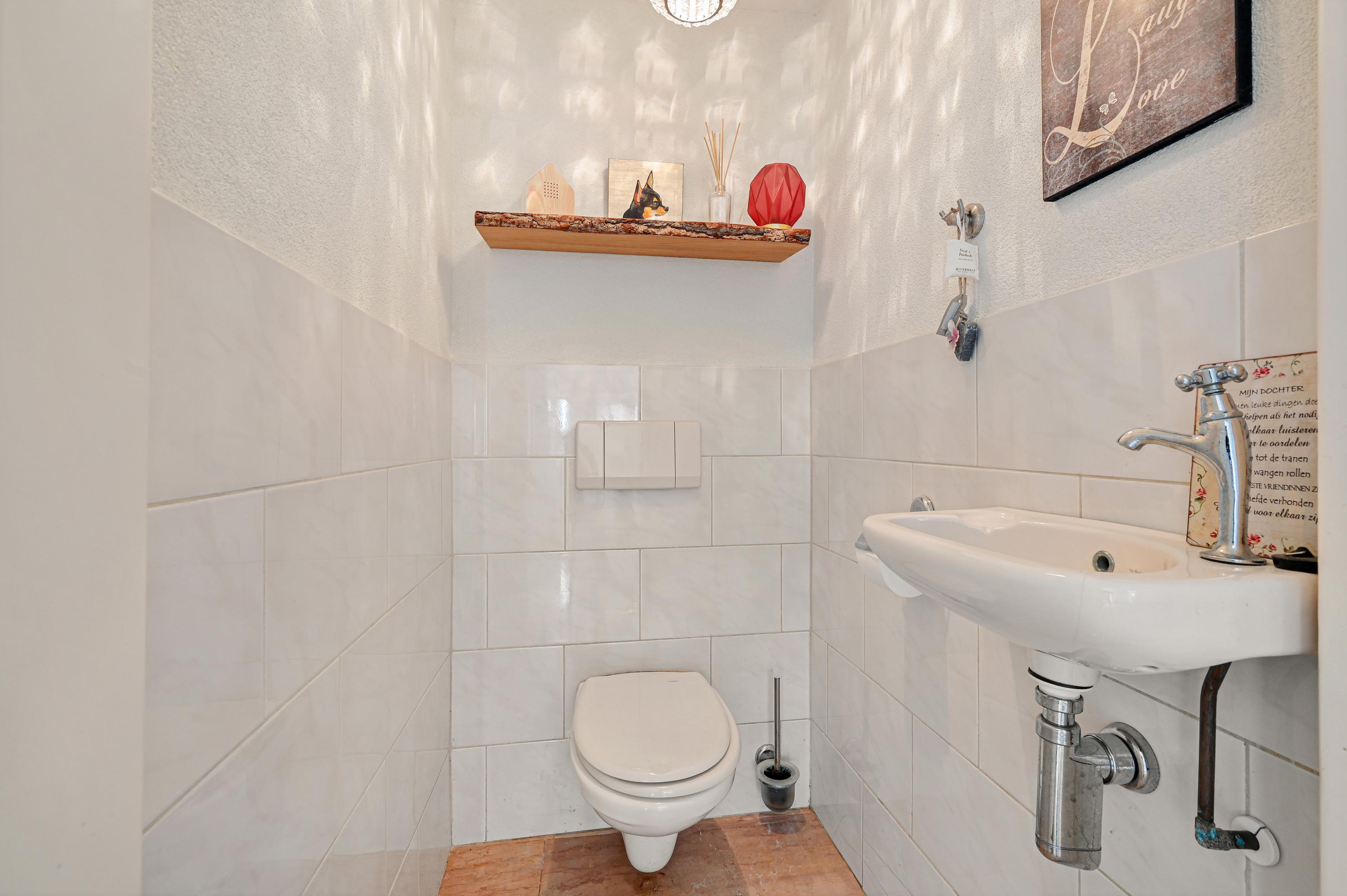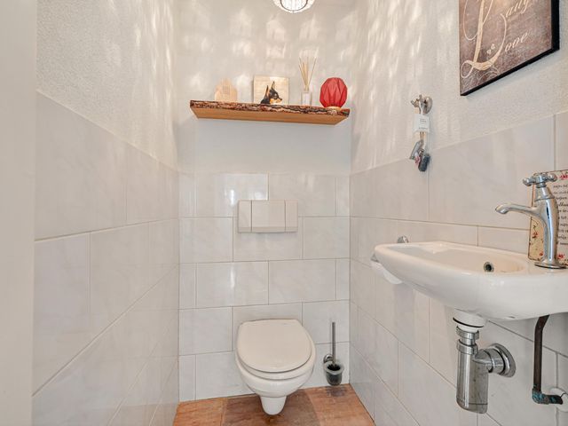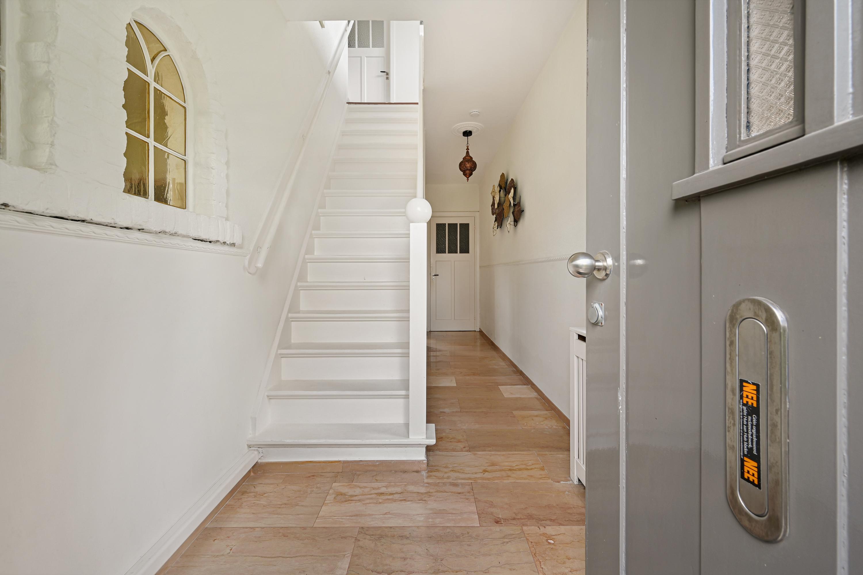 Entree met trapopgang, meterkast en toiletruimte met fonteintje.