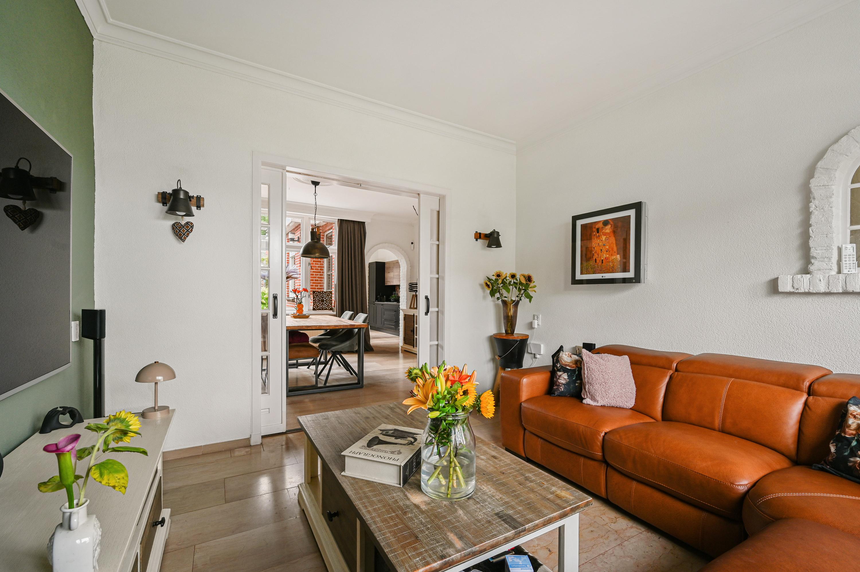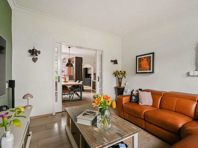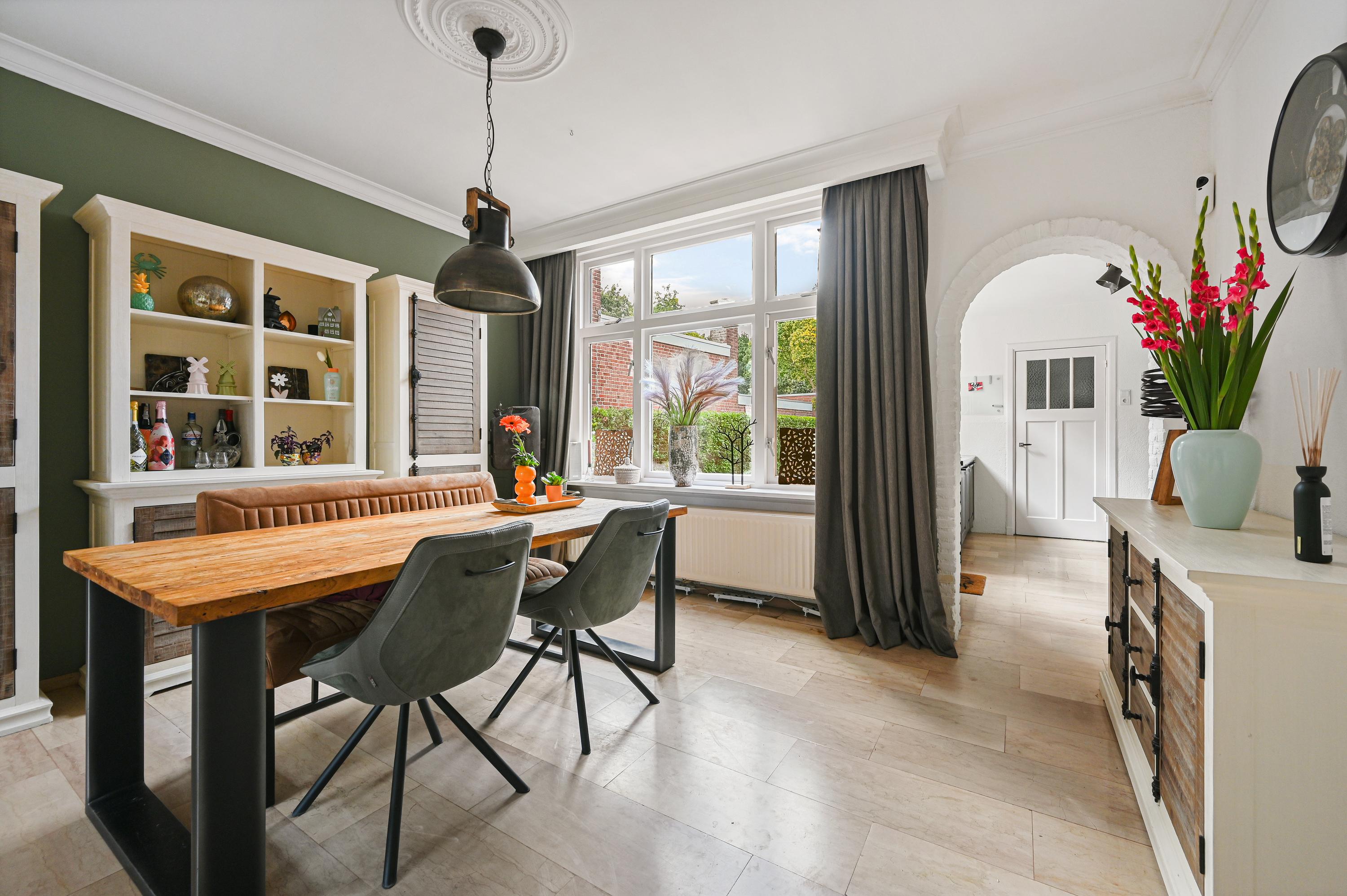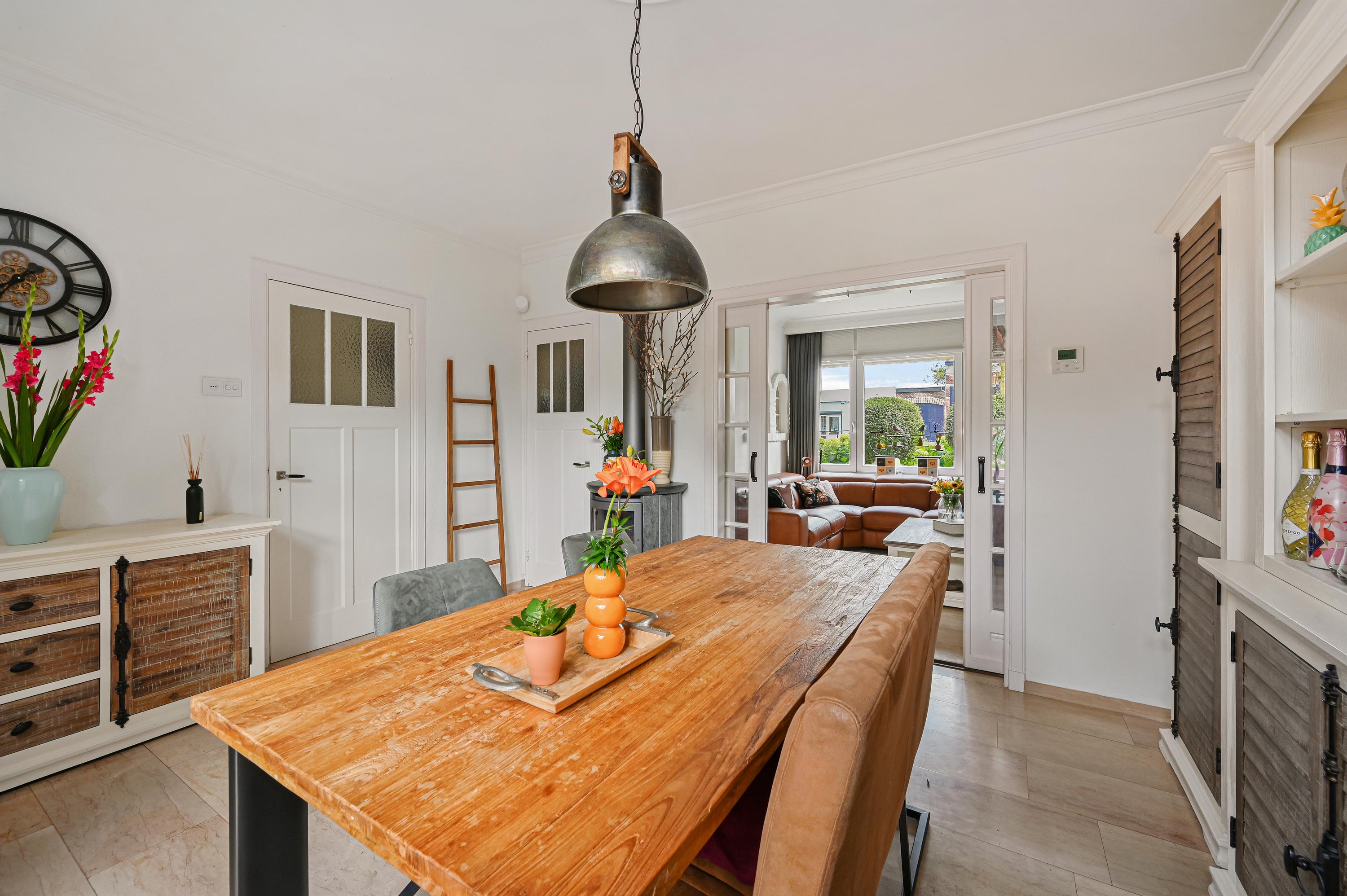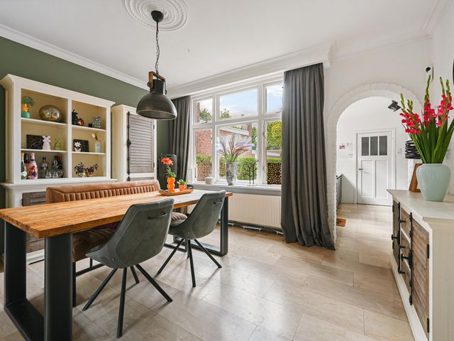 Vanuit de entree bereiken we de sfeervolle woonkamer en suite. Deze is opgedeeld in een voor-/ en achterkamer. Het zitgedeelte bevindt zich op dit moment aan de voorzijde en de eetkamer aan de achterzijde en staat in directe verbinding met de keuken.