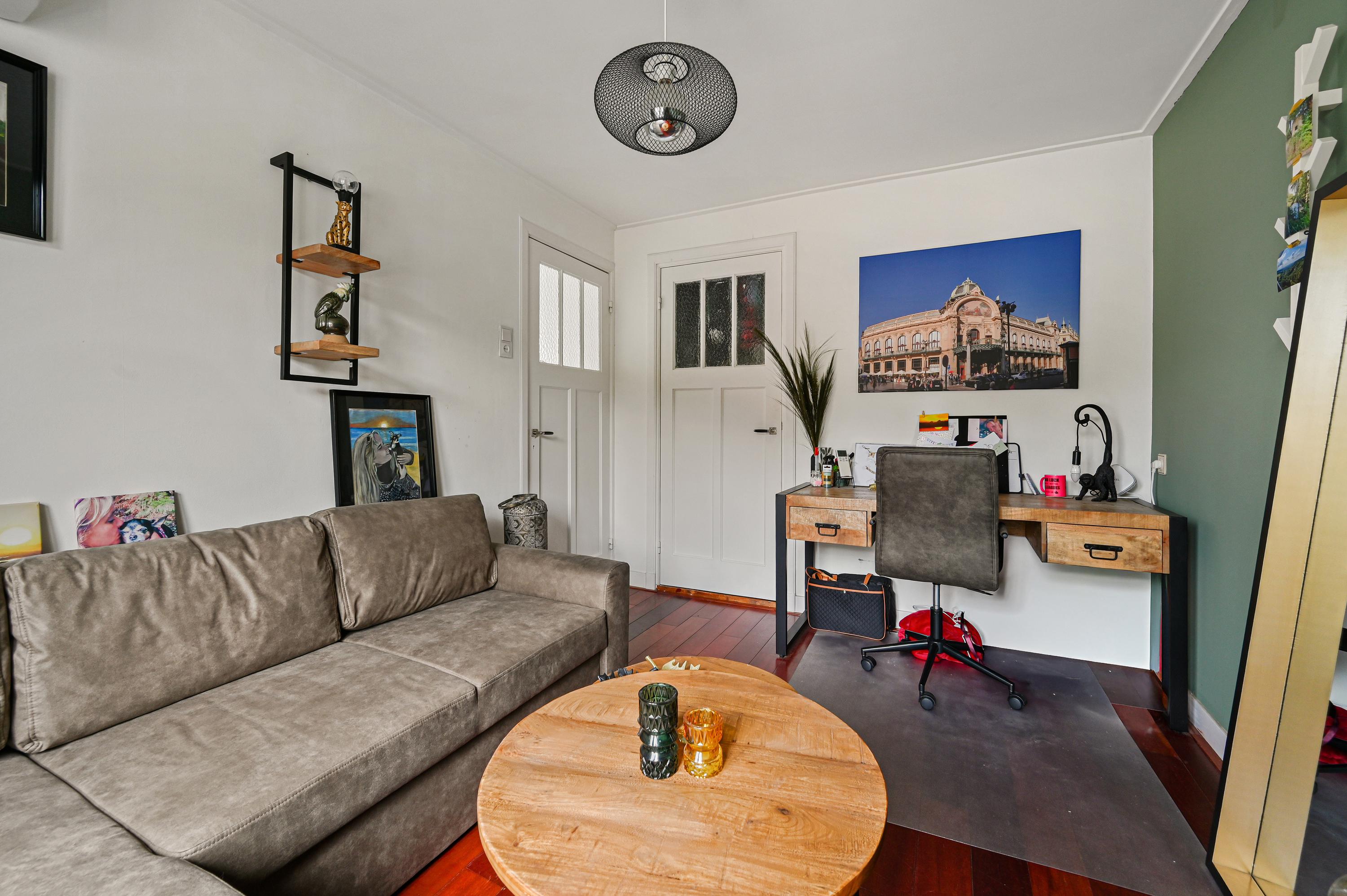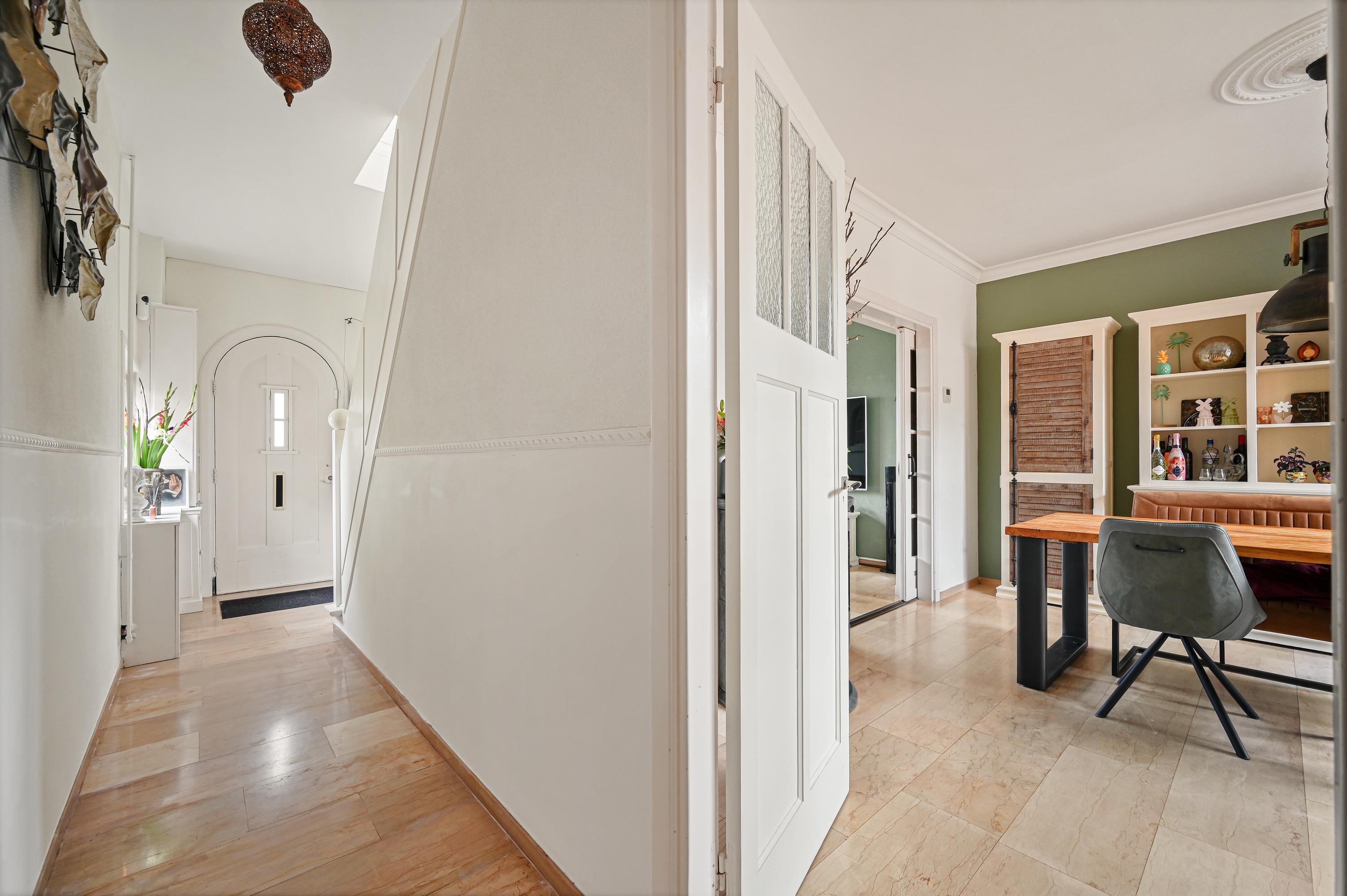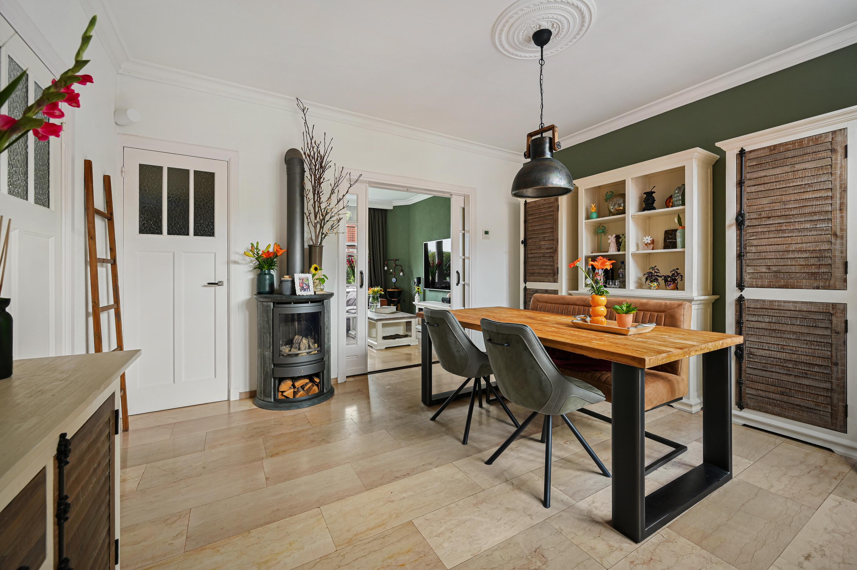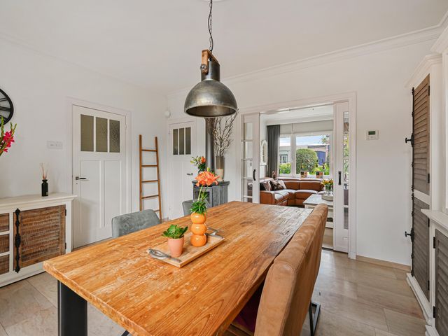 Vanuit de entree bereiken we de sfeervolle woonkamer en suite. Deze is opgedeeld in een voor-/ en achterkamer. Het zitgedeelte bevindt zich op dit moment aan de voorzijde en de eetkamer aan de achterzijde en staat in directe verbinding met de keuken.