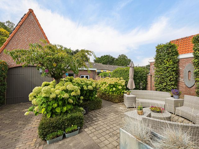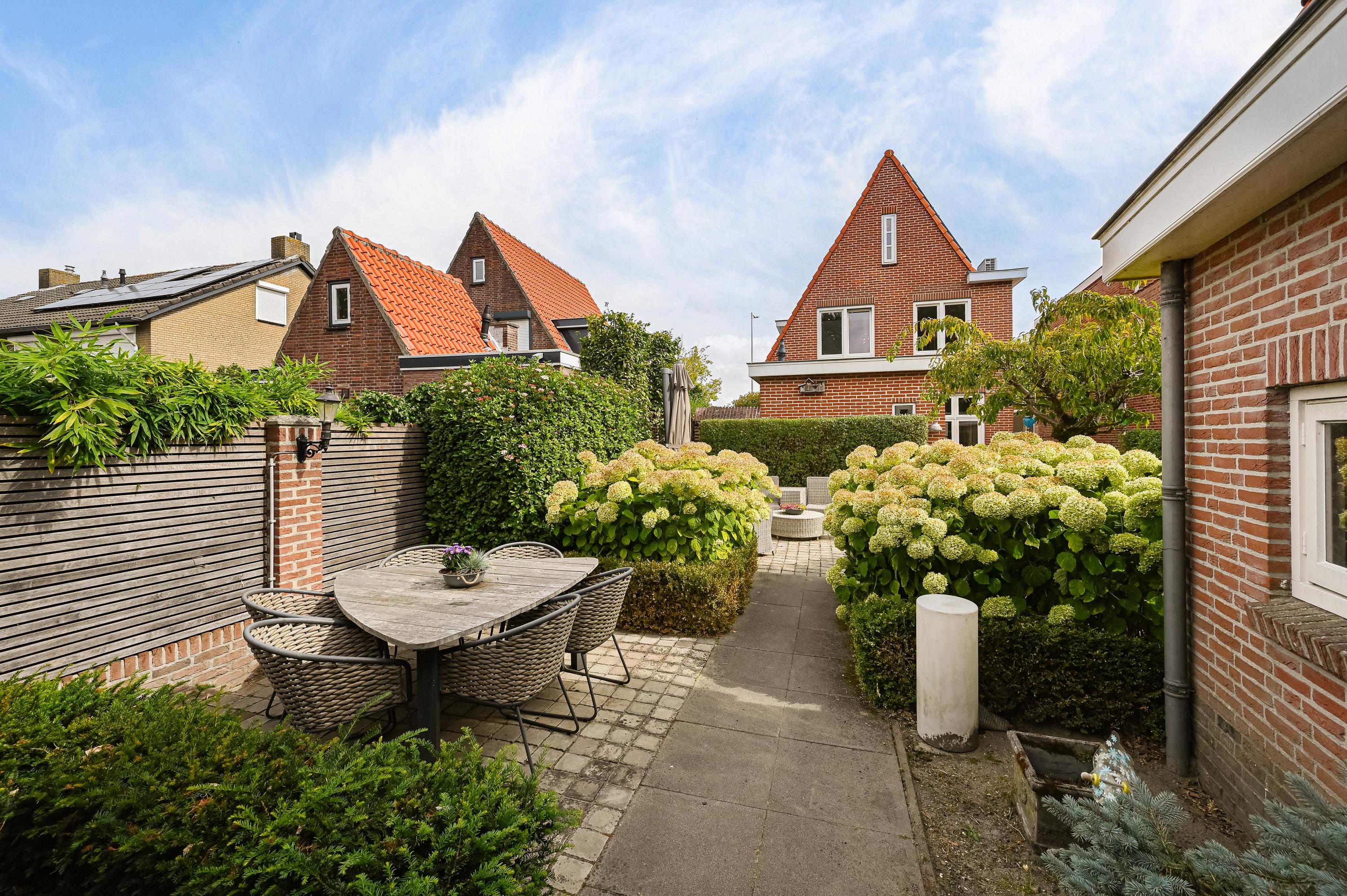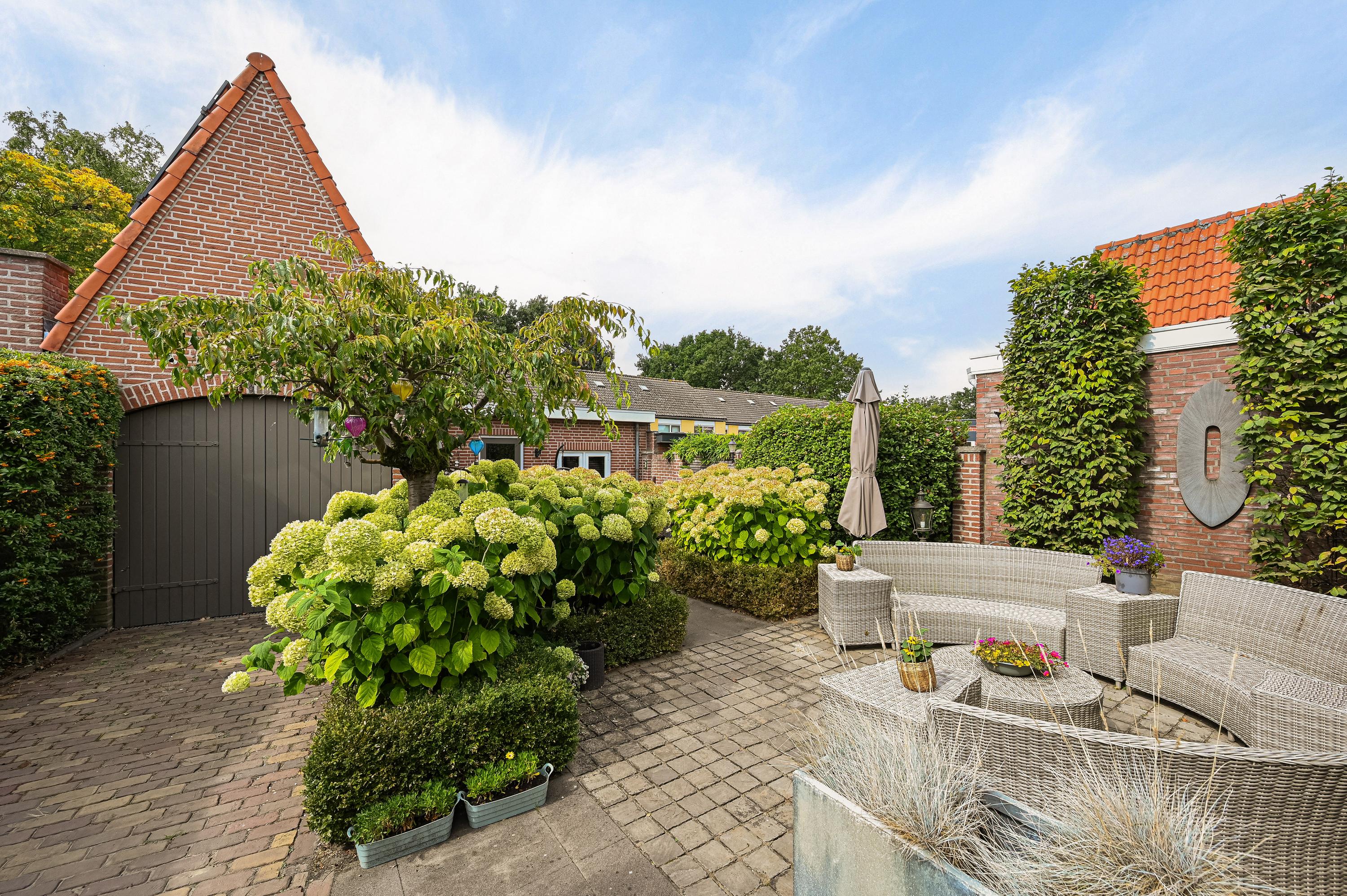 De keurig aangelegde achtertuin ligt op het zonnige zuidwesten en biedt volop ruimte om te genieten. Met twee fijne terrassen en directe toegang tot de garage is dit een heerlijke plek voor lange zomeravonden.