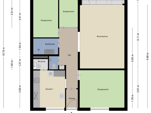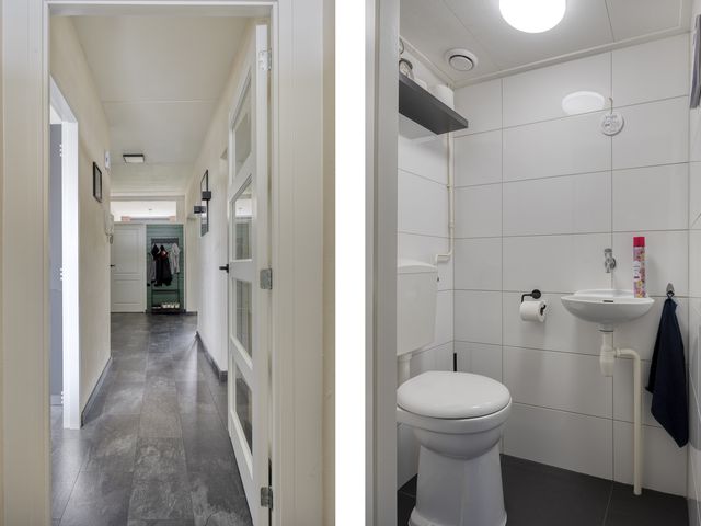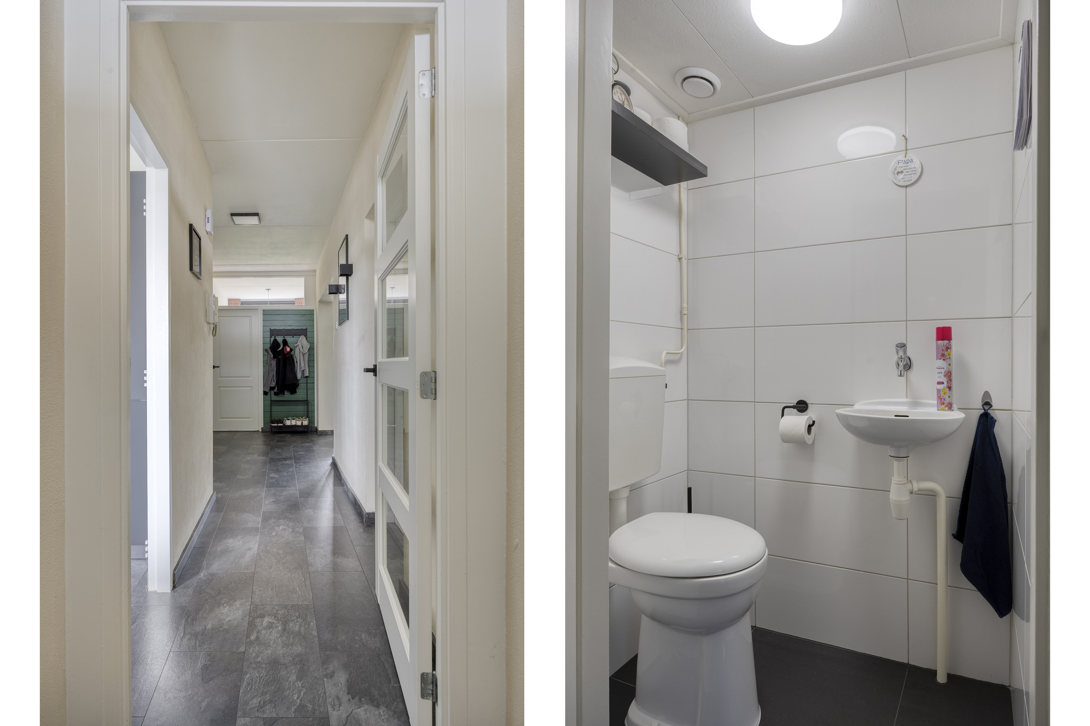 Bij binnenkomst treft u een hal met een laminaatvloer in tegel-look, die toegang biedt tot de keuken, drie slaapkamers, de toiletruimte, de badkamer en de woonkamer.