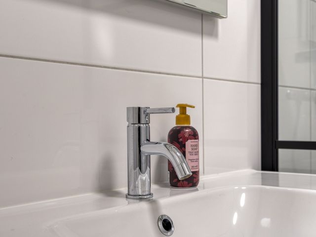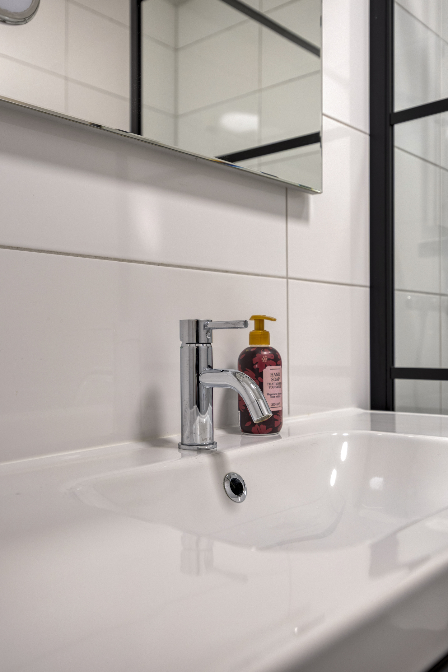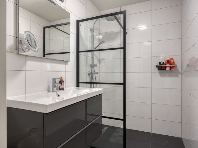 De moderne, volledig betegelde badkamer beschikt over een wastafel en een inloopdouche.
