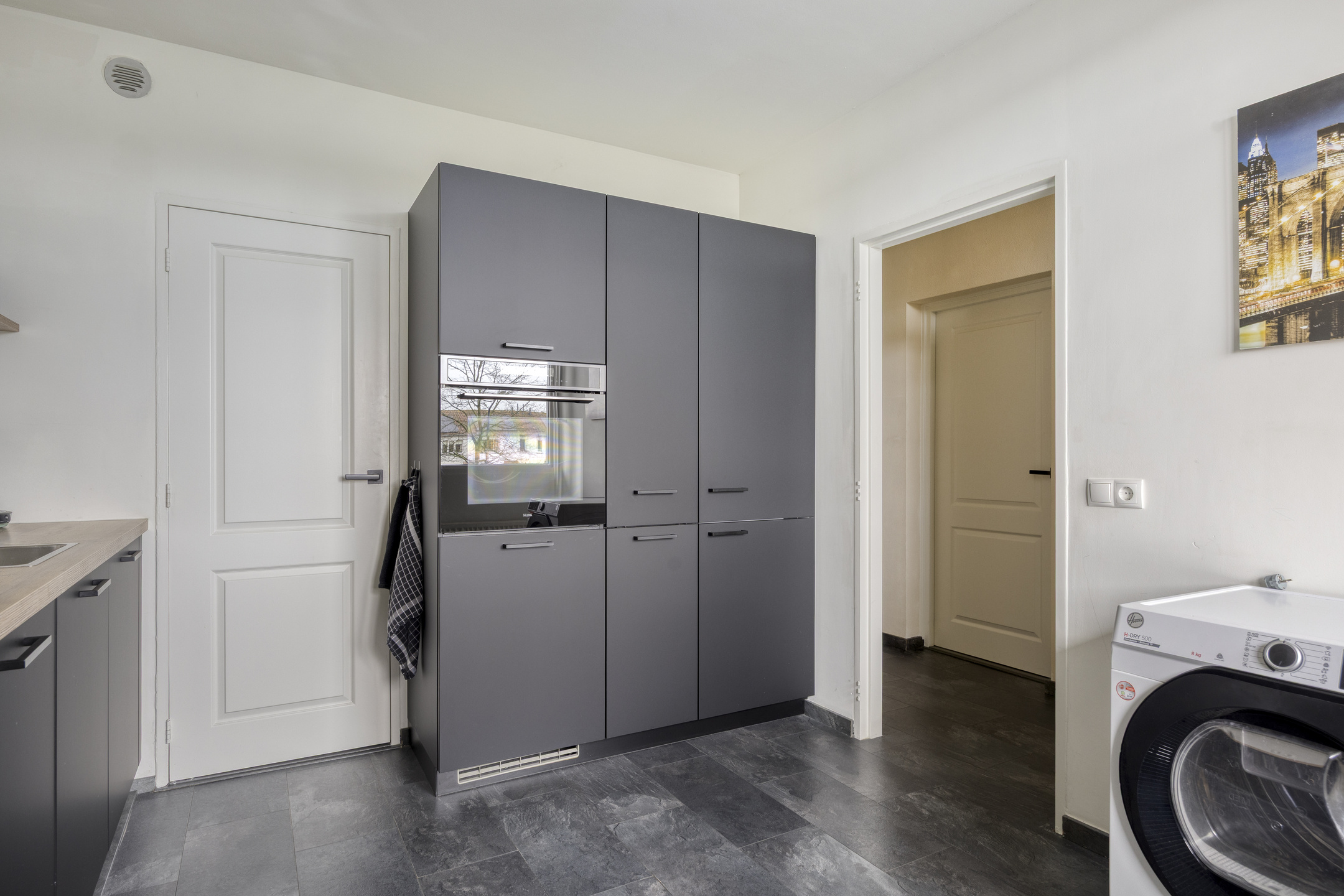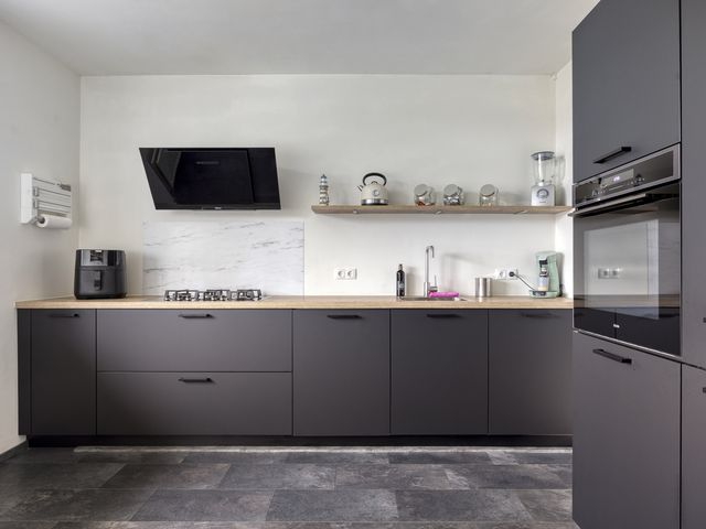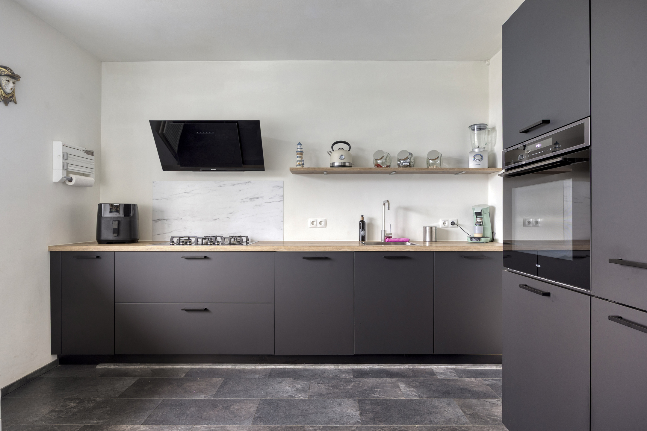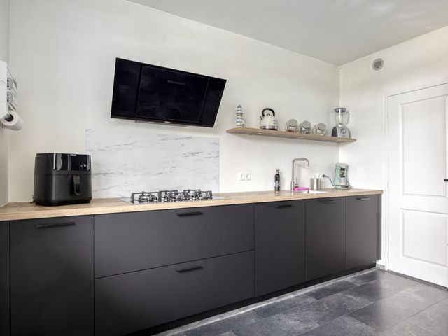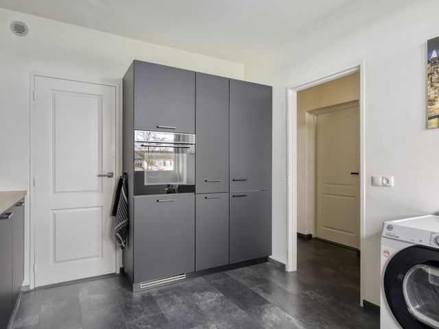 De riante, moderne keuken is voorzien van diverse inbouwapparatuur, waaronder een vijfpits gaskookstel (AEG), een RVS spoelbak (Lanesto), een combi-oven (Etna), een koel-/vriescombinatie (Etna) en een afzuigkap (Airforce). De wanden en het plafond zijn glad gestuct. De houten kozijnen zijn deels voorzien van dubbelglas en deels van enkelglas. Vanuit de keuken is de provisieruimte bereikbaar, waar zich de wasmachineaansluiting, de boiler en de mechanische ventilatie bevinden.