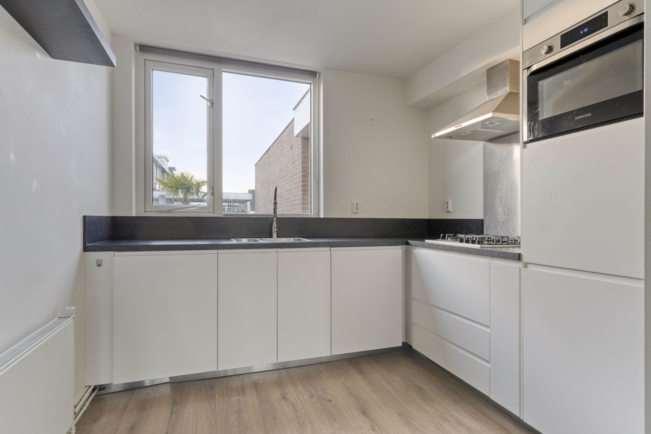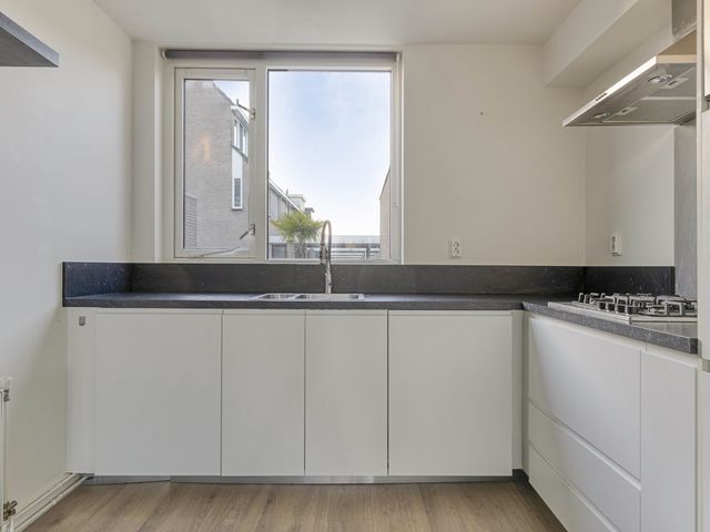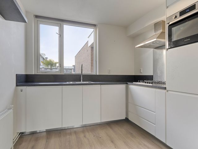 De open keuken is voorzien van diverse inbouwapparatuur, waaronder een gasfornuis, oven, koelkast, vaatwasmachine en afzuigkap.