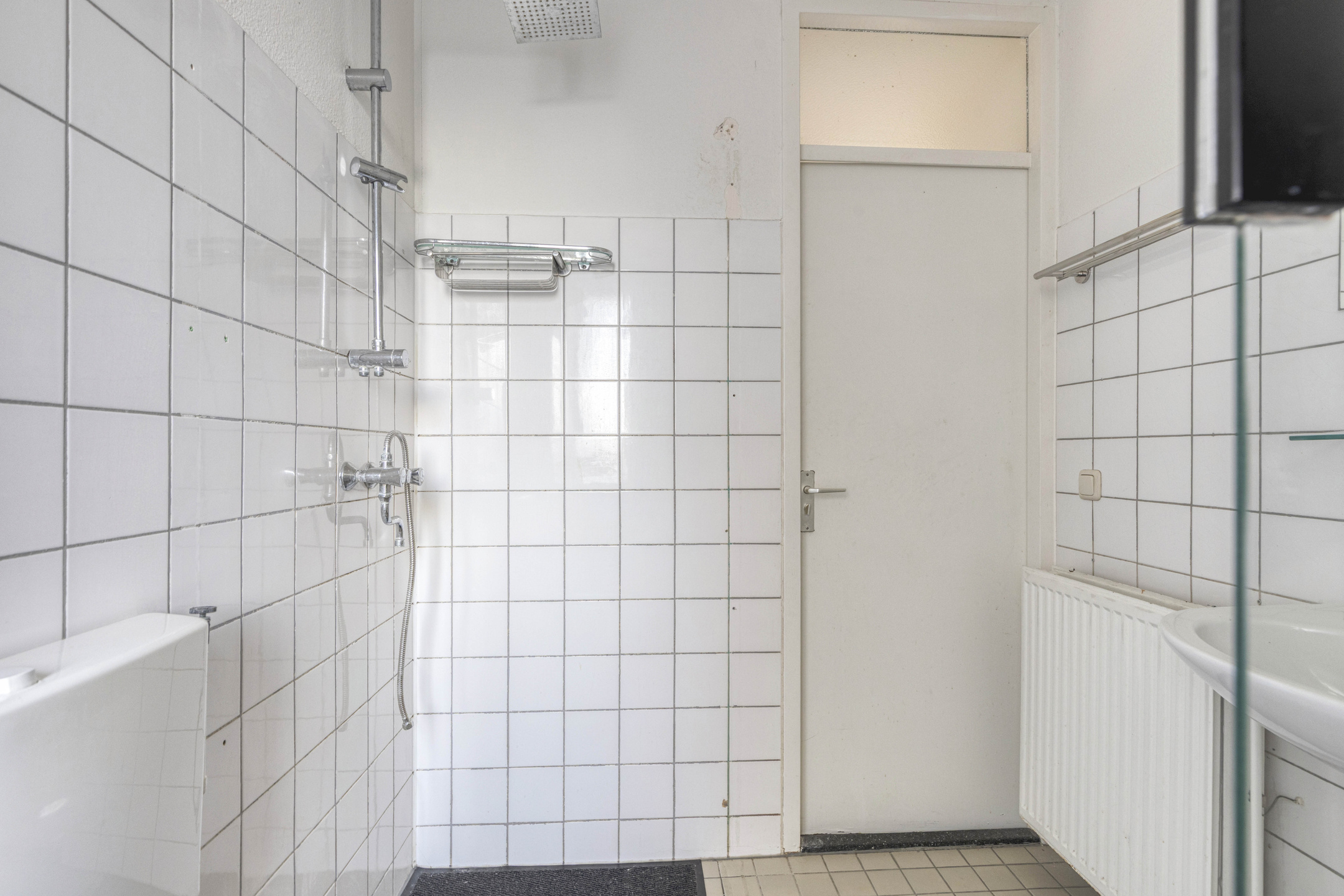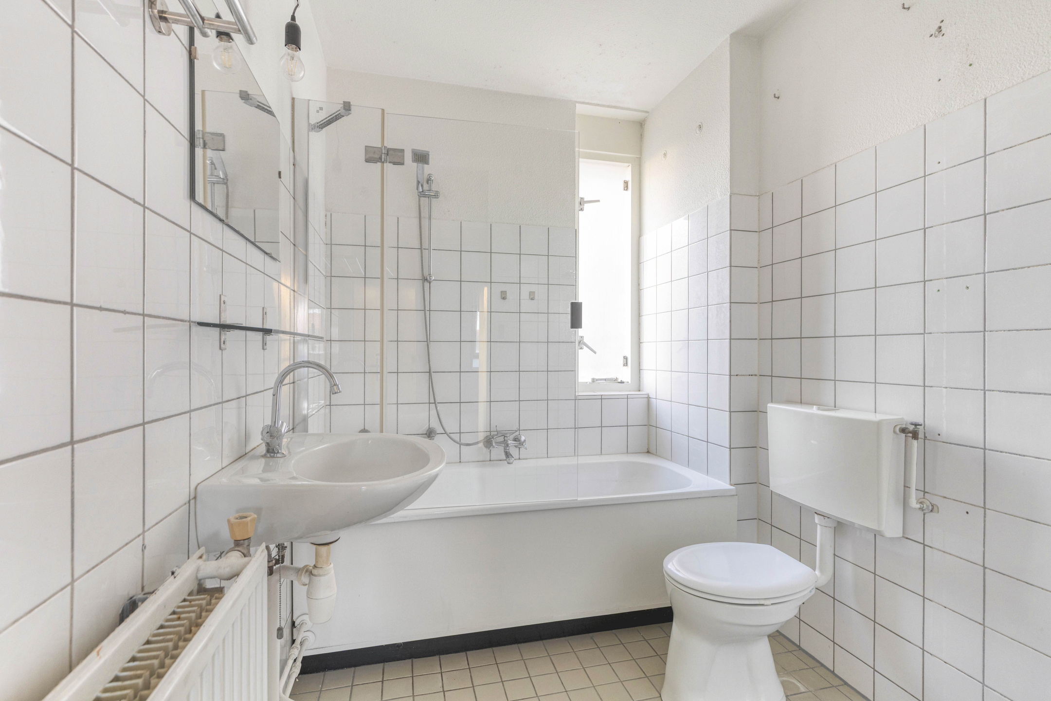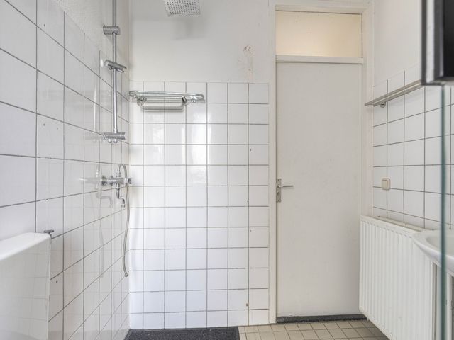 De badkamer beschikt over een ligbad/douchecombinatie (douche is defect), wastafel, toilet en radiator.