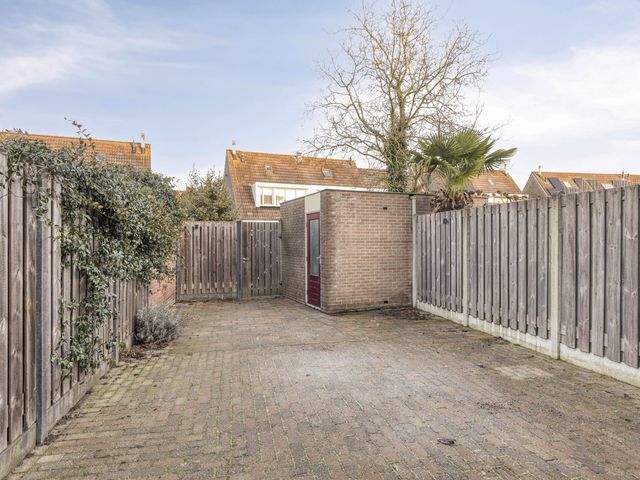 Ruime en zeer zonnige en onderhoudsvriendelijke achtertuin met stenen berging en achterom.