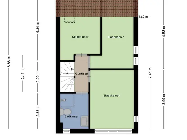 Eerste verdieping: Overloop met toegang tot3 slaapkamers en de badkamer met een bad, toilet en wastafel. Alle slaapkamers zijn voorzien van laminaatvloer.