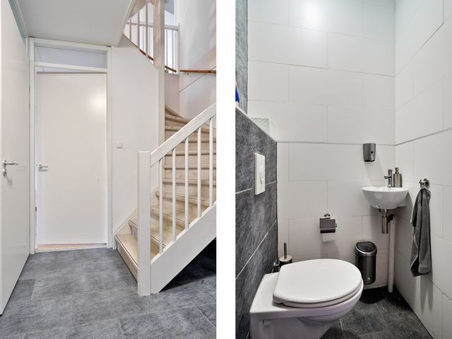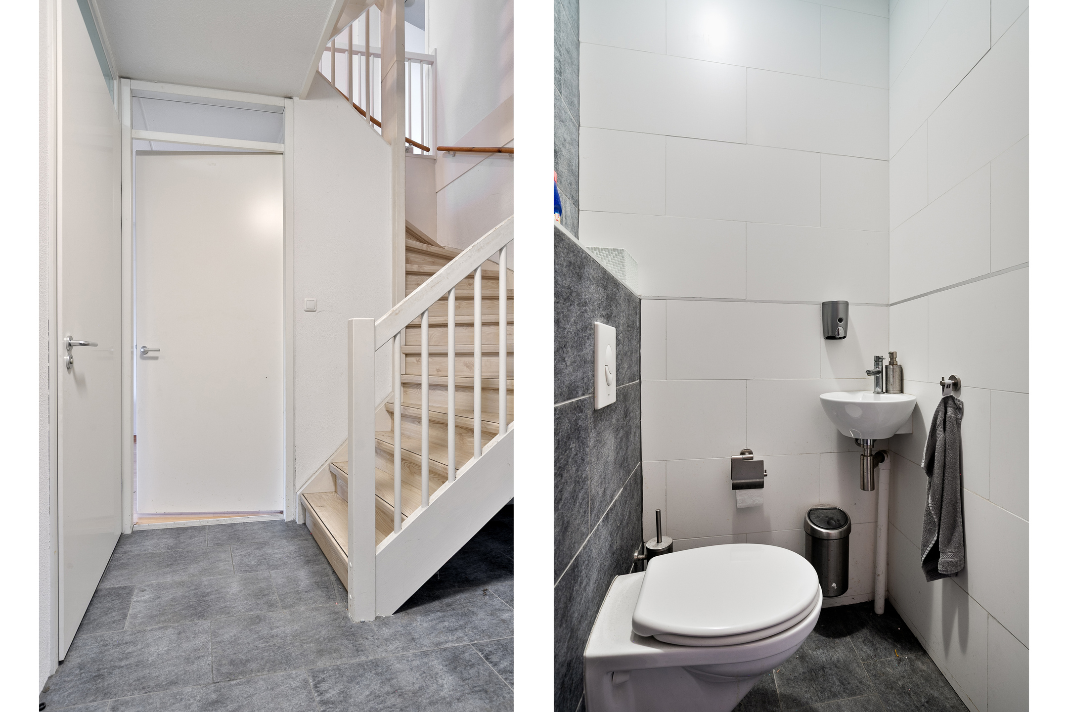 De ruime hal met tegelvloer biedt toegang tot de garage, woonkamer, trapopgang naar de eerste verdieping en de volledig betegelde toiletruimte, voorzien van een zwevend toilet en een fonteintje.