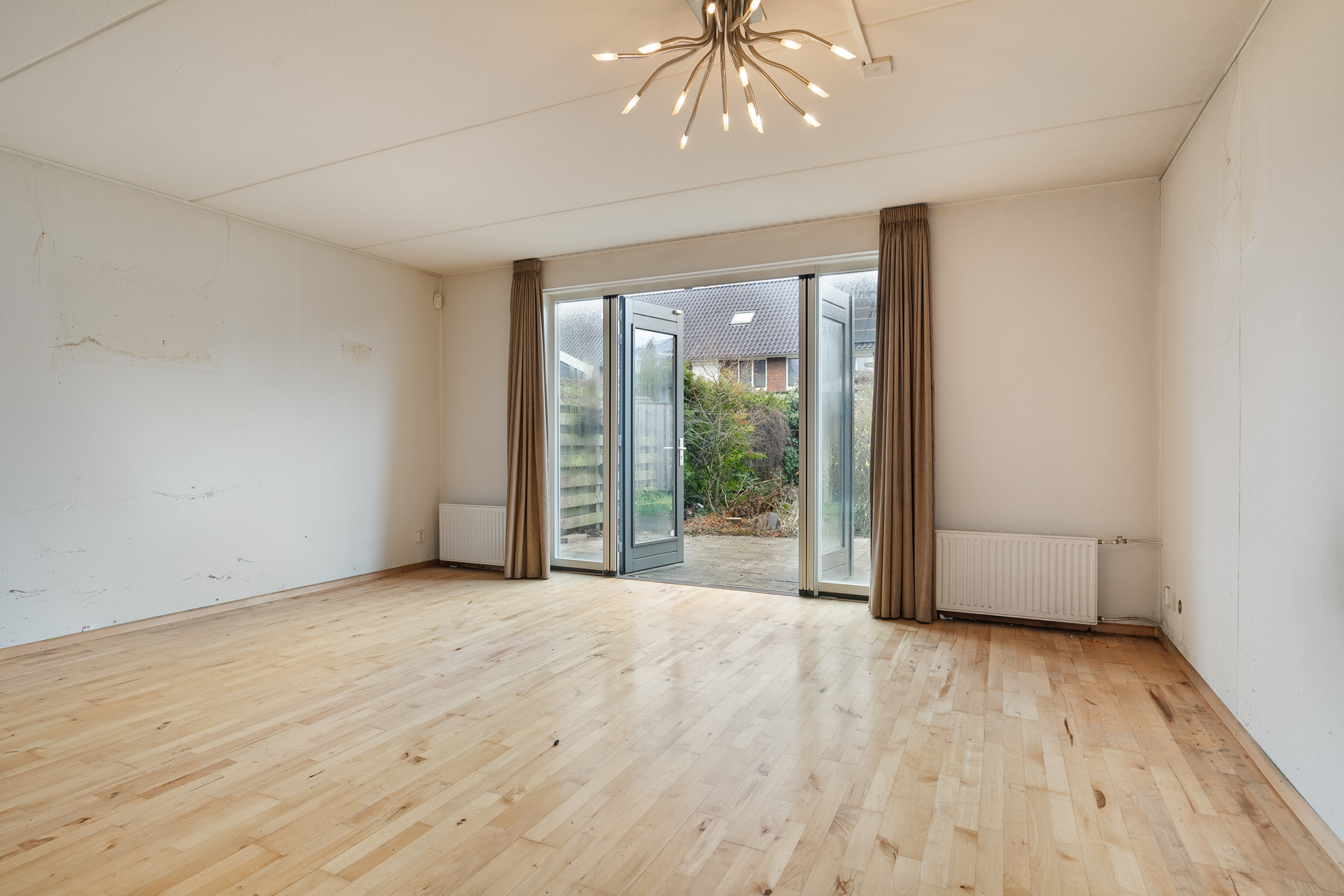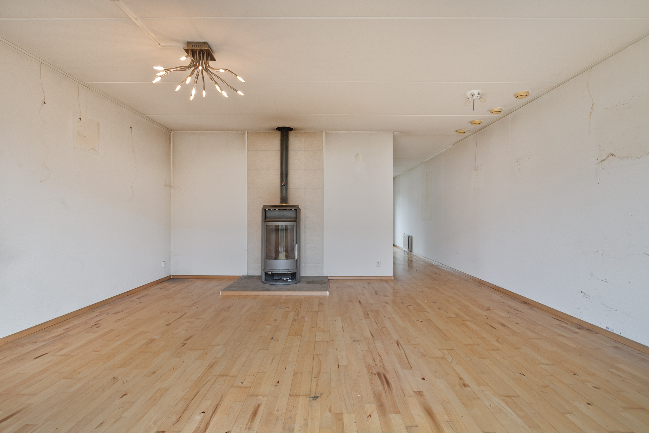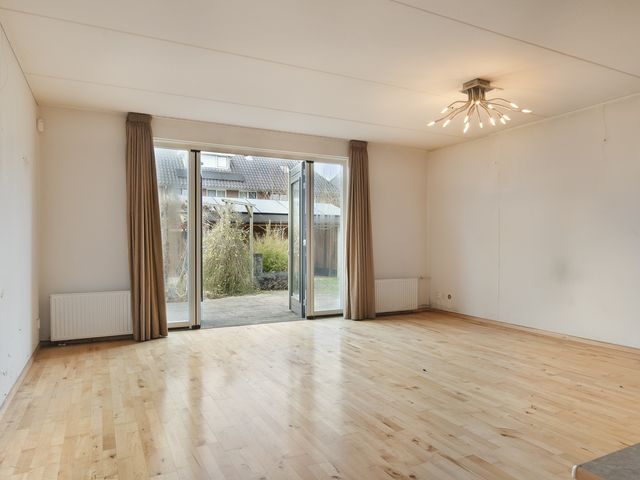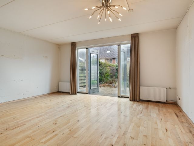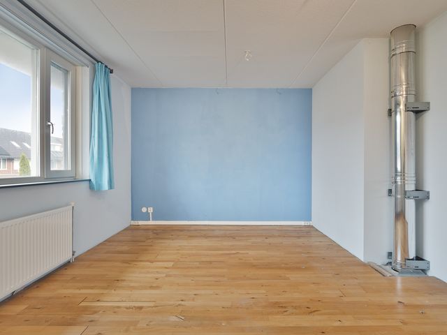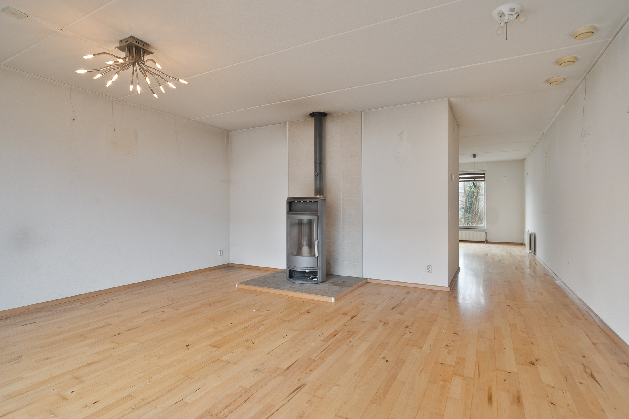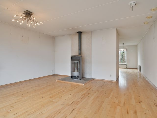 De lichte woonkamer is afgewerkt met een houten vloer, gespoten stucwanden en een strak plafond. Verder beschikt de ruimte over een praktische trapkast, een sfeervolle houtkachel en houten kozijnen met HR++ glas. Aan de voorzijde zijn rolgordijnen geplaatst; aan de achterzijde geven en-suite deuren toegang tot de riante achtertuin.