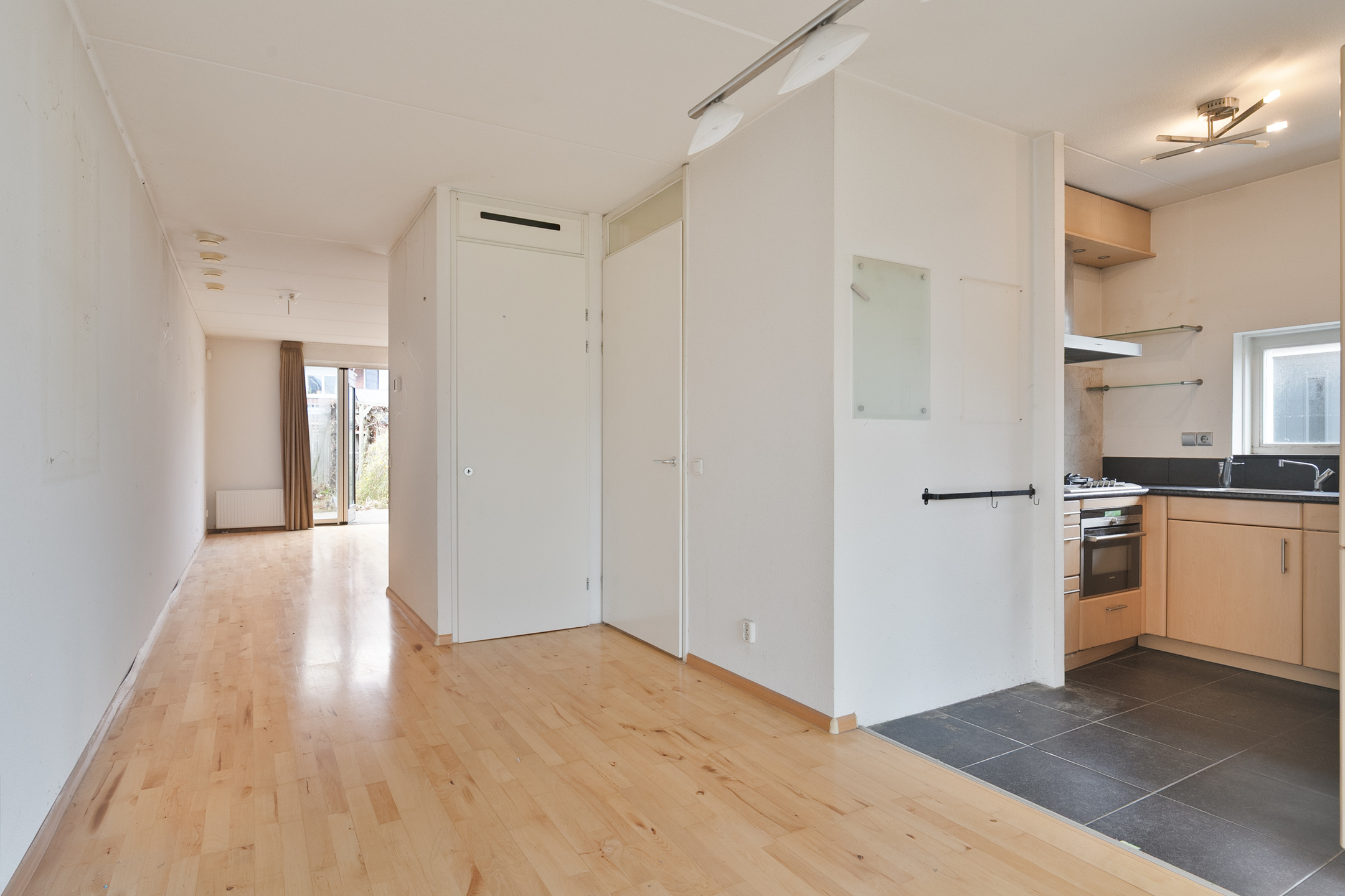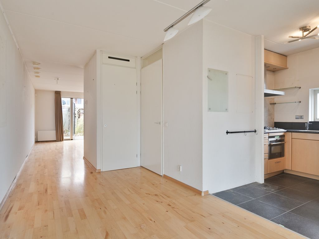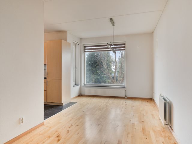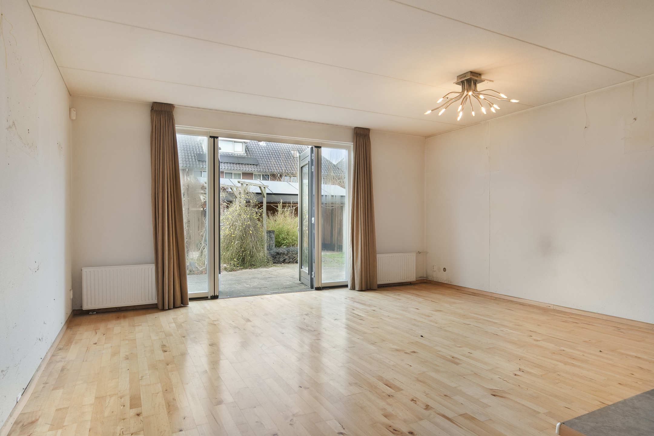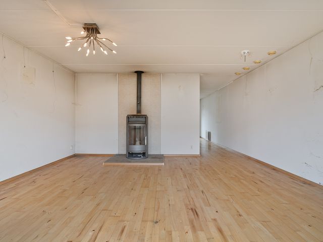 De lichte woonkamer is afgewerkt met een houten vloer, gespoten stucwanden en een strak plafond. Verder beschikt de ruimte over een praktische trapkast, een sfeervolle houtkachel en houten kozijnen met HR++ glas. Aan de voorzijde zijn rolgordijnen geplaatst; aan de achterzijde geven en-suite deuren toegang tot de riante achtertuin.