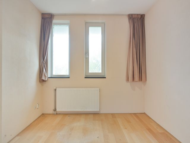 Slaapkamer III (achterzijde): uitgerust met een houten vloer, gestucte wanden en plafond, houten kozijnen met HR++ glas en draaikiepfunctie en op maat gemaakte horren.