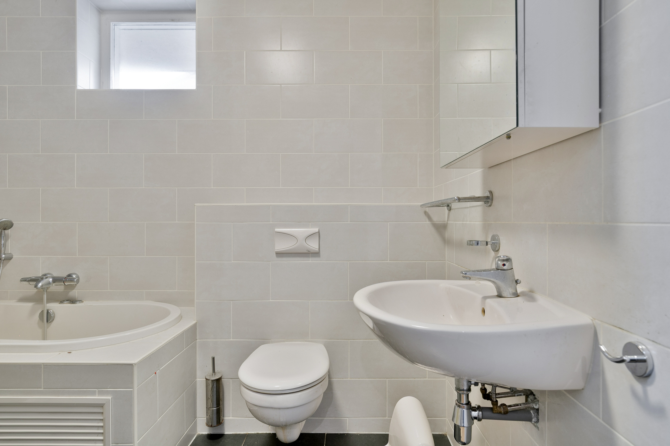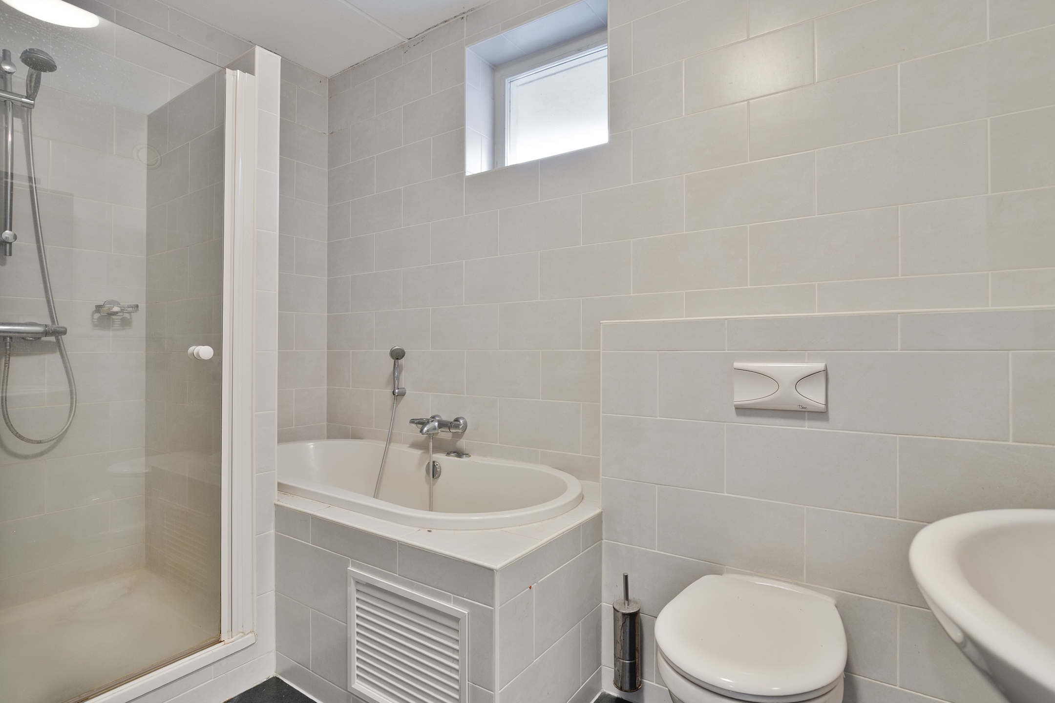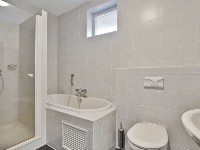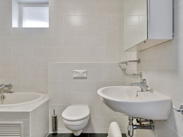 De volledig betegelde badkamer is uitgerust met een zwevend toilet, wastafel, ligbad en douchebak. Het houten kozijn is voorzien van HR++ glas.