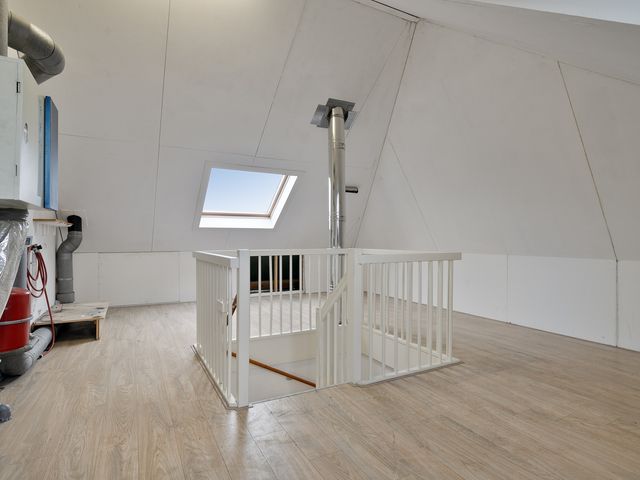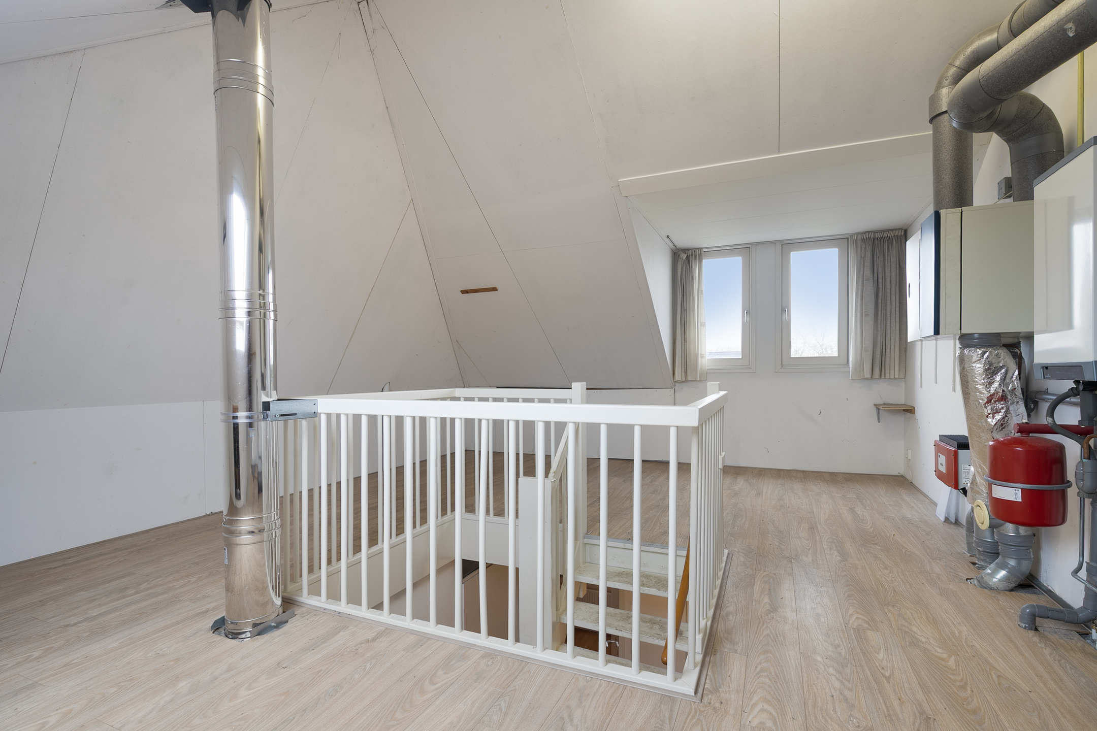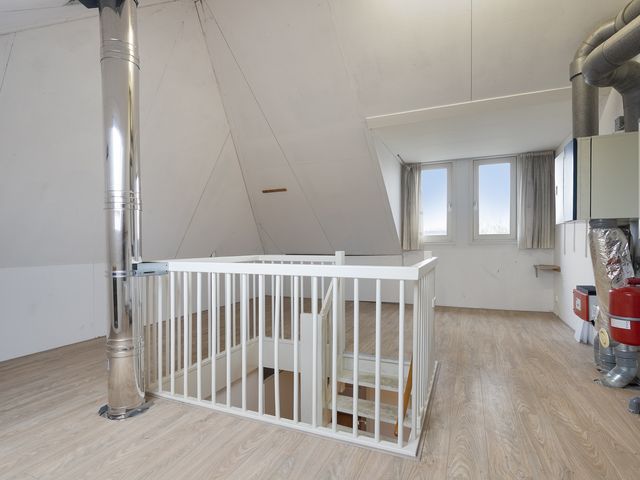 De overloop geeft toegang tot een royale ruimte waar, indien gewenst, twee slaapkamers gerealiseerd kunnen worden. De verdieping beschikt over een laminaatvloer, bergruimte achter de knieschotten en houten kozijnen met HR++ glas en draaikiepfunctie. Daarnaast is er een houten dakraam met HR++ glas aanwezig. Op deze verdieping bevinden zich tevens de cv-installatie (Intergas, 2008) en de WTW-installatie.