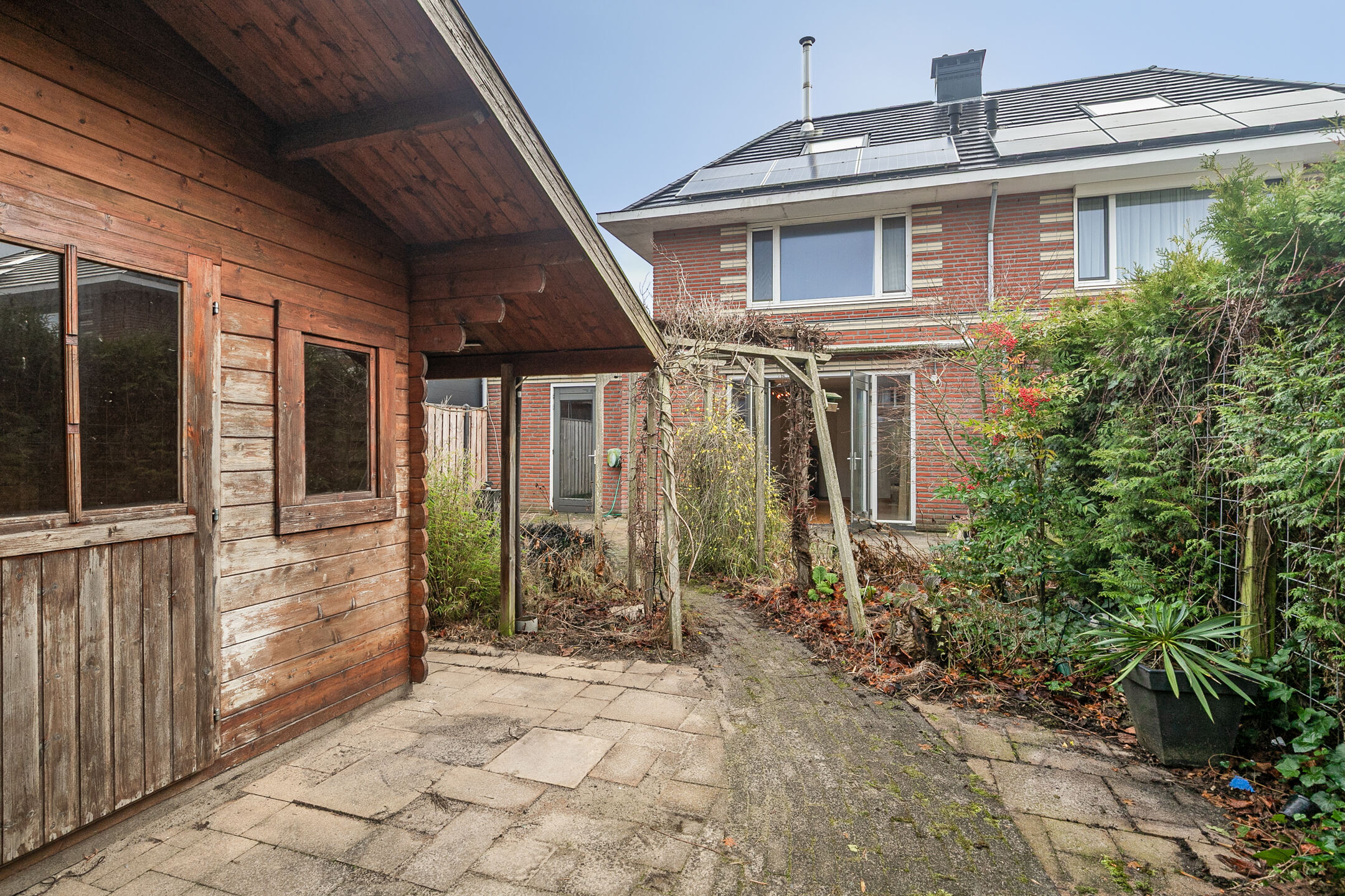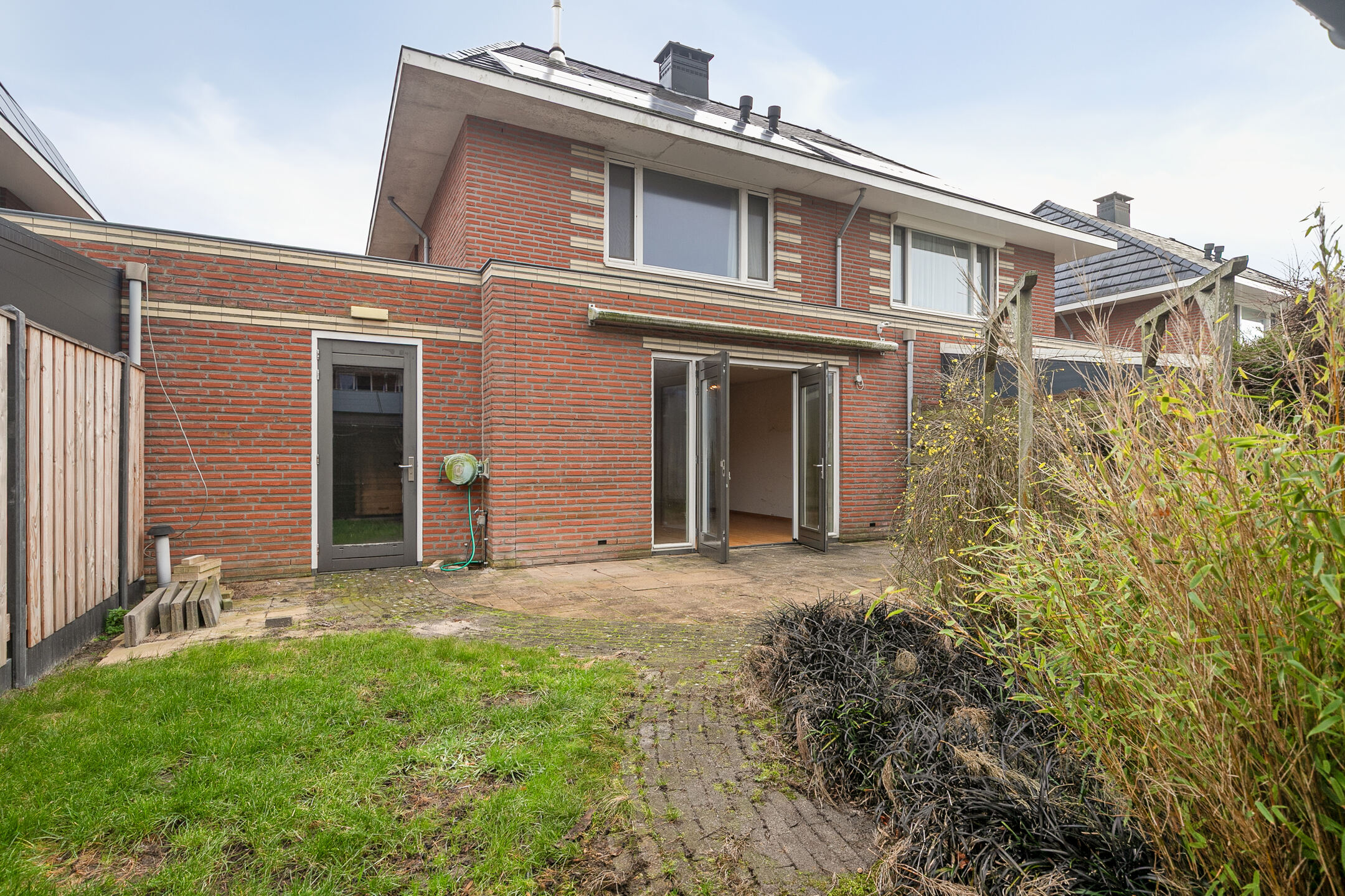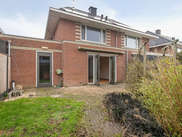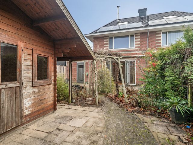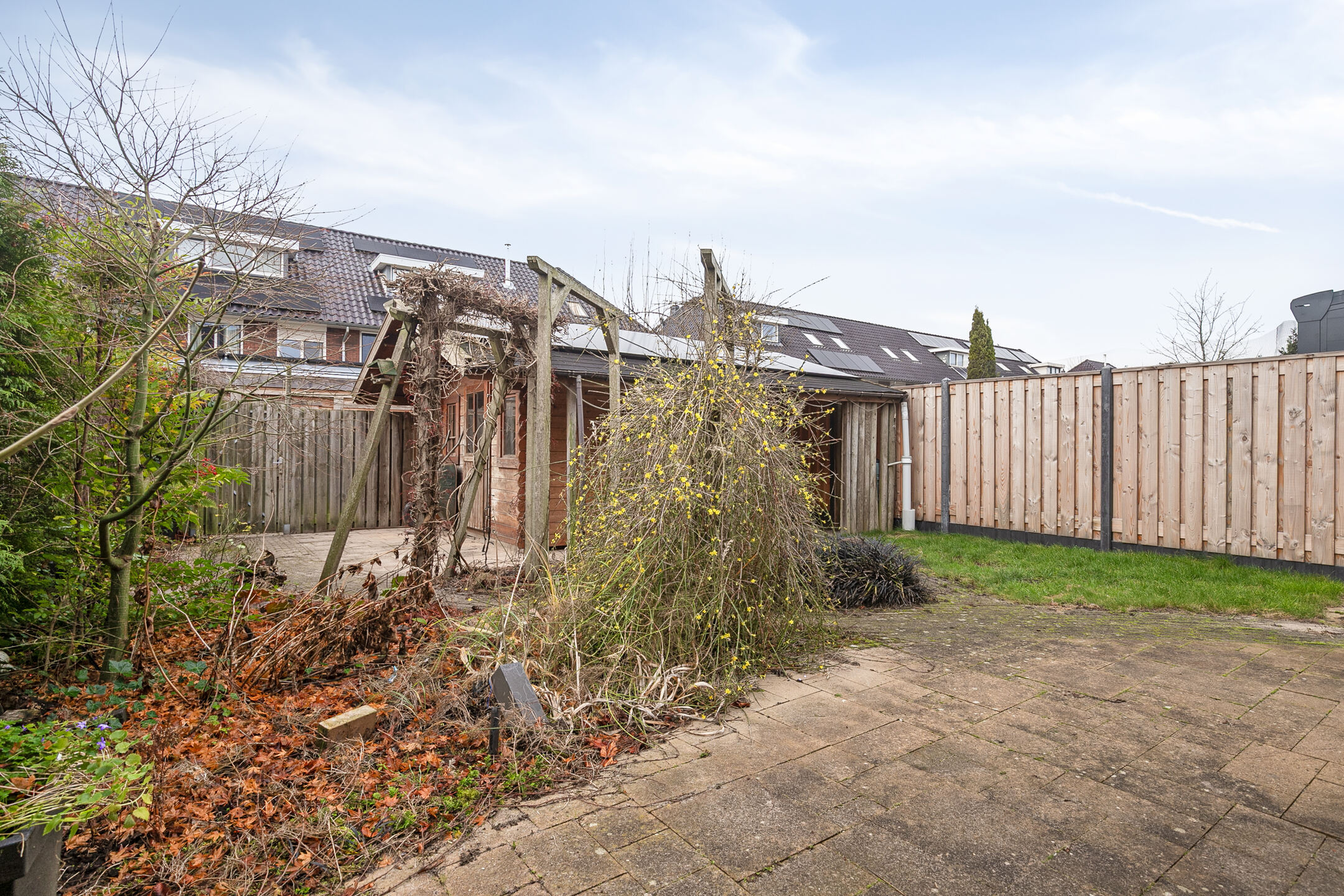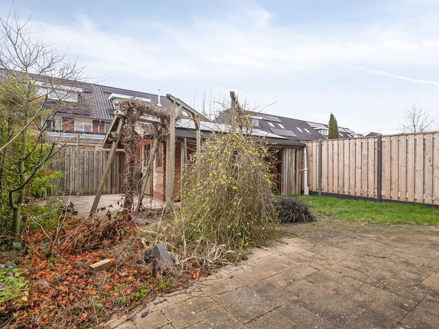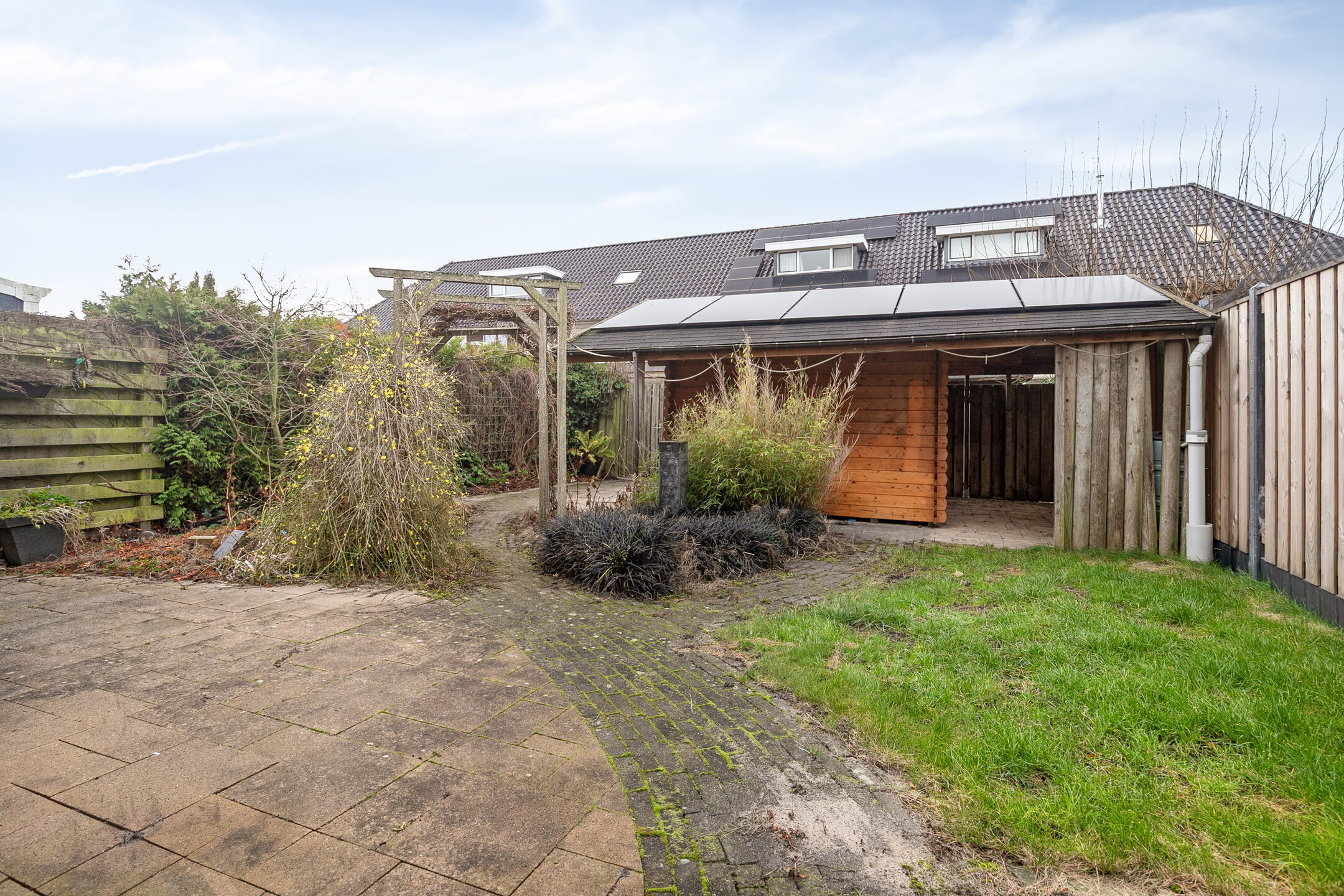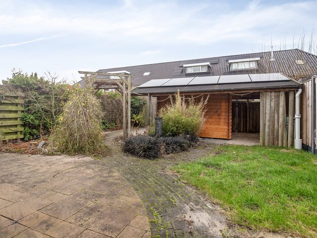 De achtertuin, gelegen op het westen, is royaal van opzet en beschikt over een vrijstaande berging, waar tevens de aansluiting van de 10 zonnepanelen is ondergebracht. Ook is er een handige achterom aanwezig.