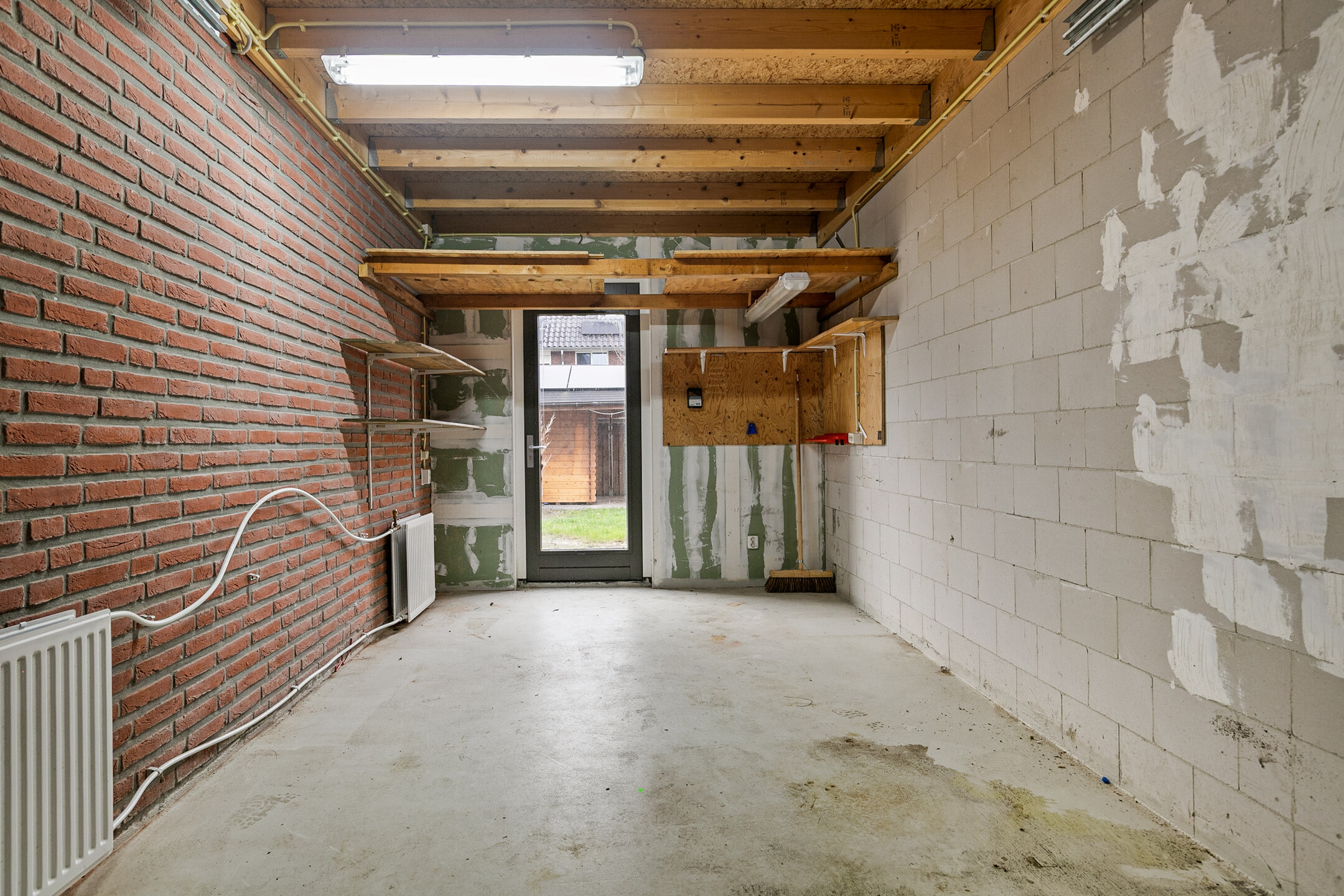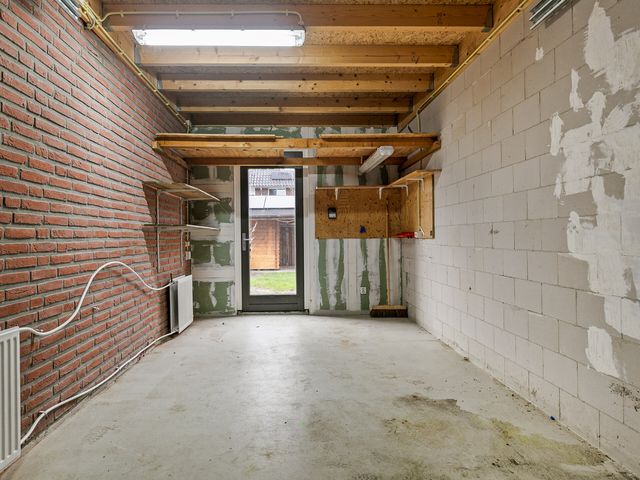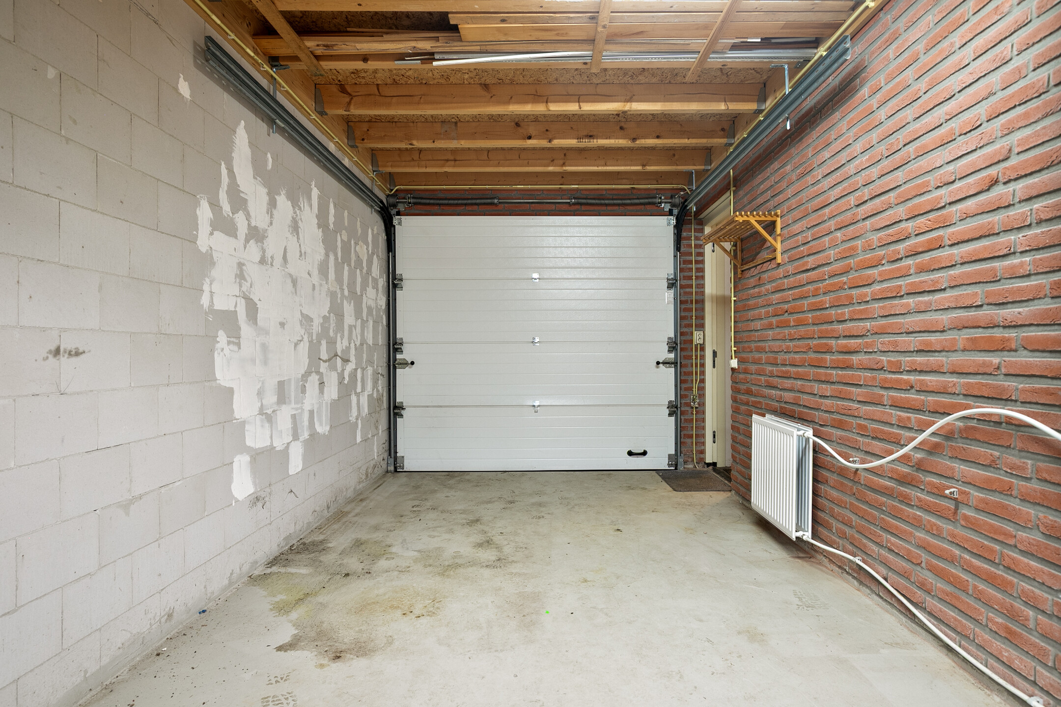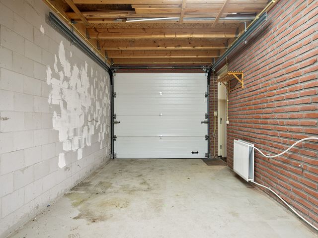 De aangebouwde stenen garage is voorzien van een garagedeur, elektra en een achterdeur met HR++ glas richting de achtertuin.