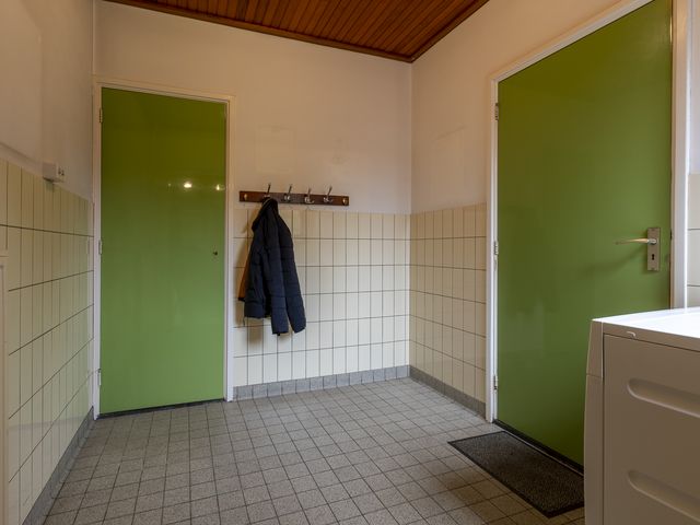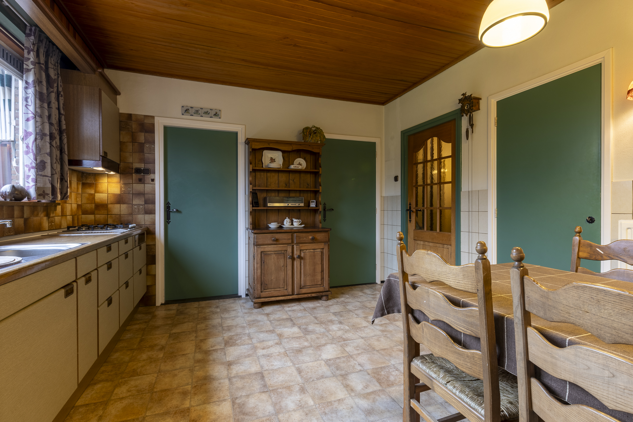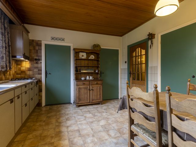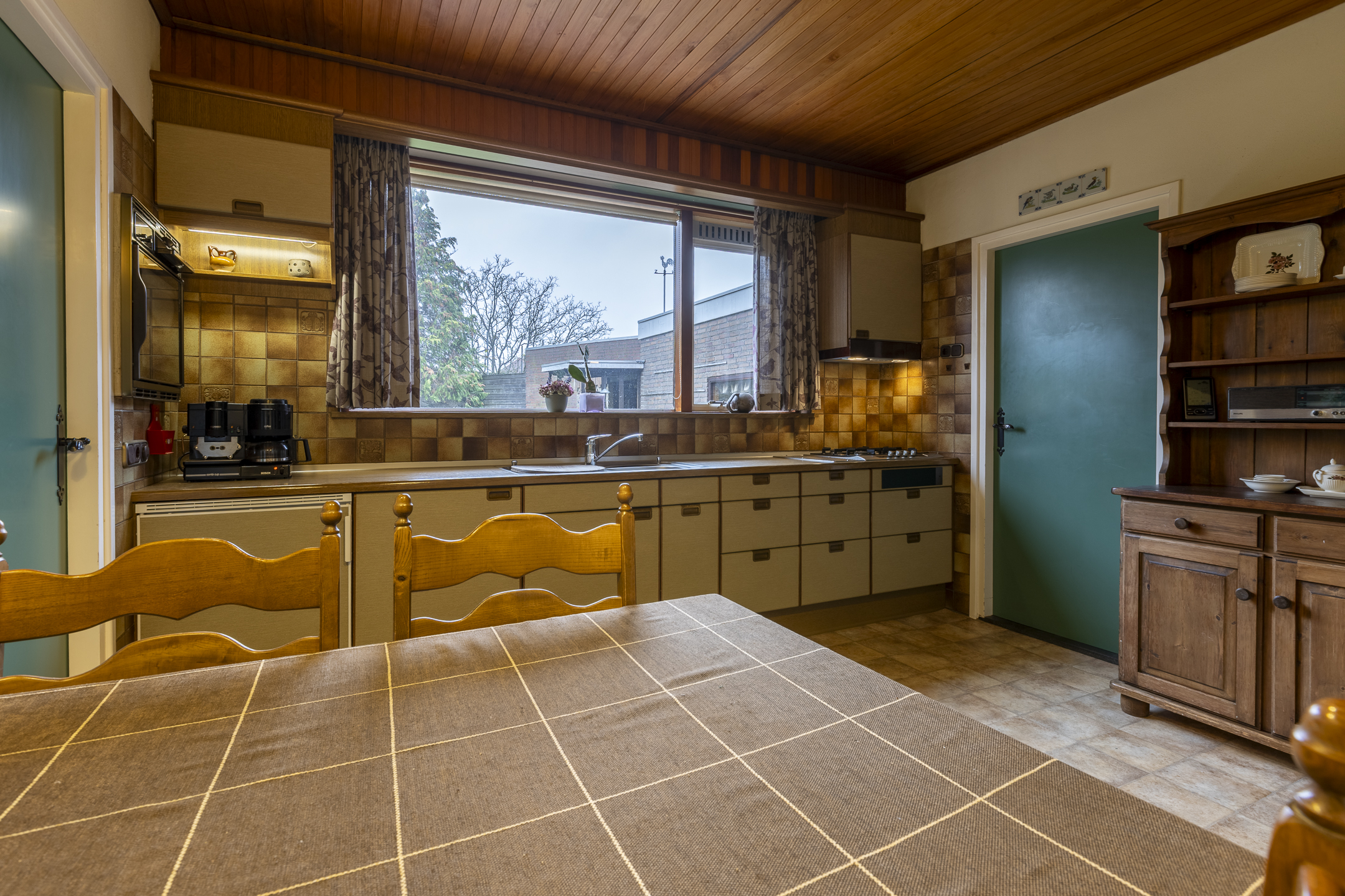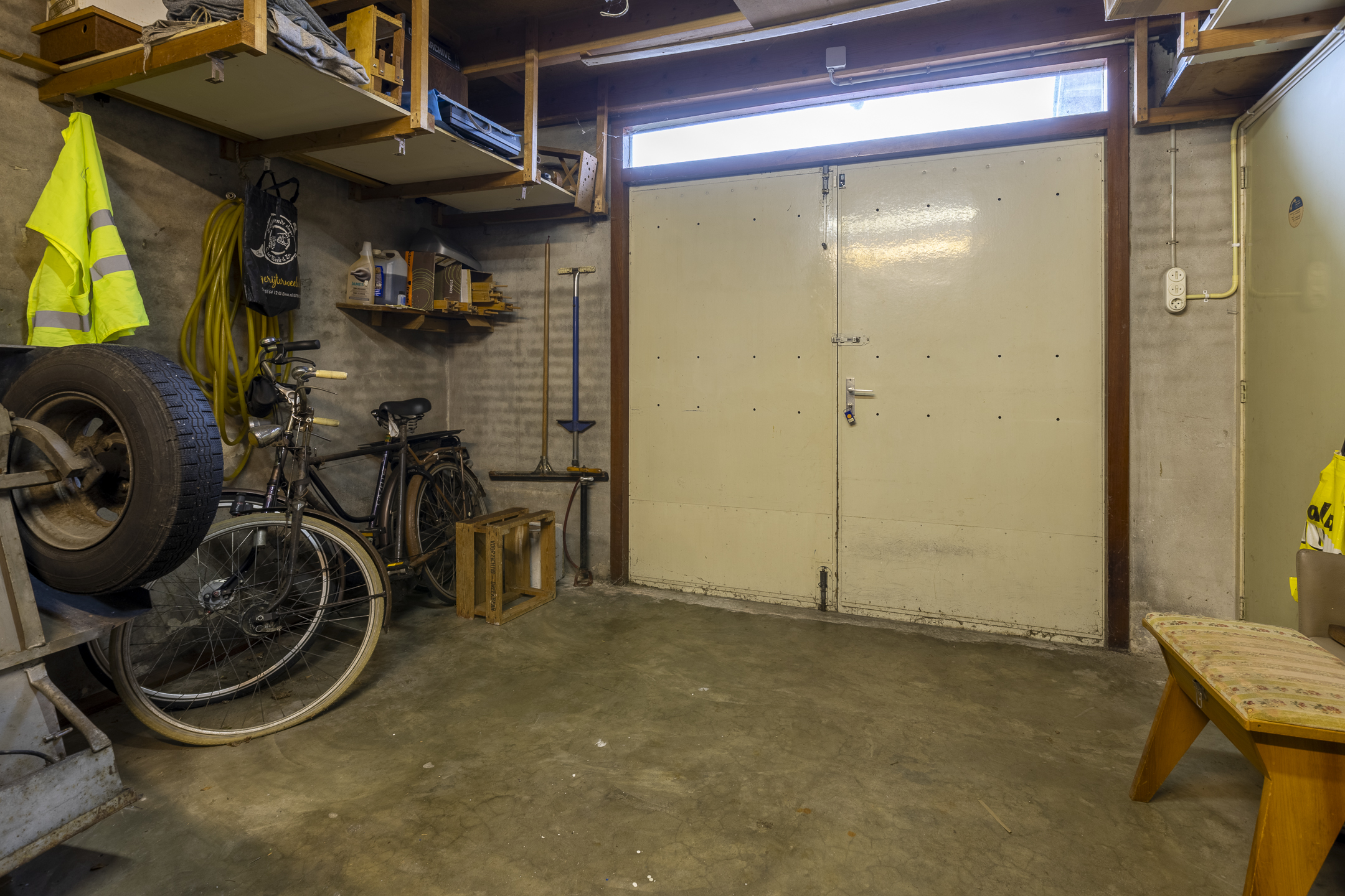 Vanuit de entree bereiken we de ruime woonkamer voorzien van vloerbedekking aan de voorzijde en een houten vloer aan de achterzijde. Dankzij de grote raampartijen is er veel natuurlijk lichtinval. Daarnaast beschikt de woonkamer over rolluiken en een open haard. De gesloten keuken is bereikbaar vanuit de woonkamer en de hal. De gedateerde maar nette keuken beschikt over een tegelvloer, spoelbak, gaskookplaat, oven, koelkast, afzuigkap en veel bergruimte. Vanuit de keuken is er toegang tot zowel de bijkeuken als de kelder. De bijkeuken is voorzien van aansluitingen voor wasapparatuur en biedt toegang tot de garage én de achtertuin. De ruime, multifunctionele garage is ideaal voor hobby, opslag of werkruimte. Aan de voorzijde is de werkkamer gelegen en deze is voorzien van vloerbedekking.