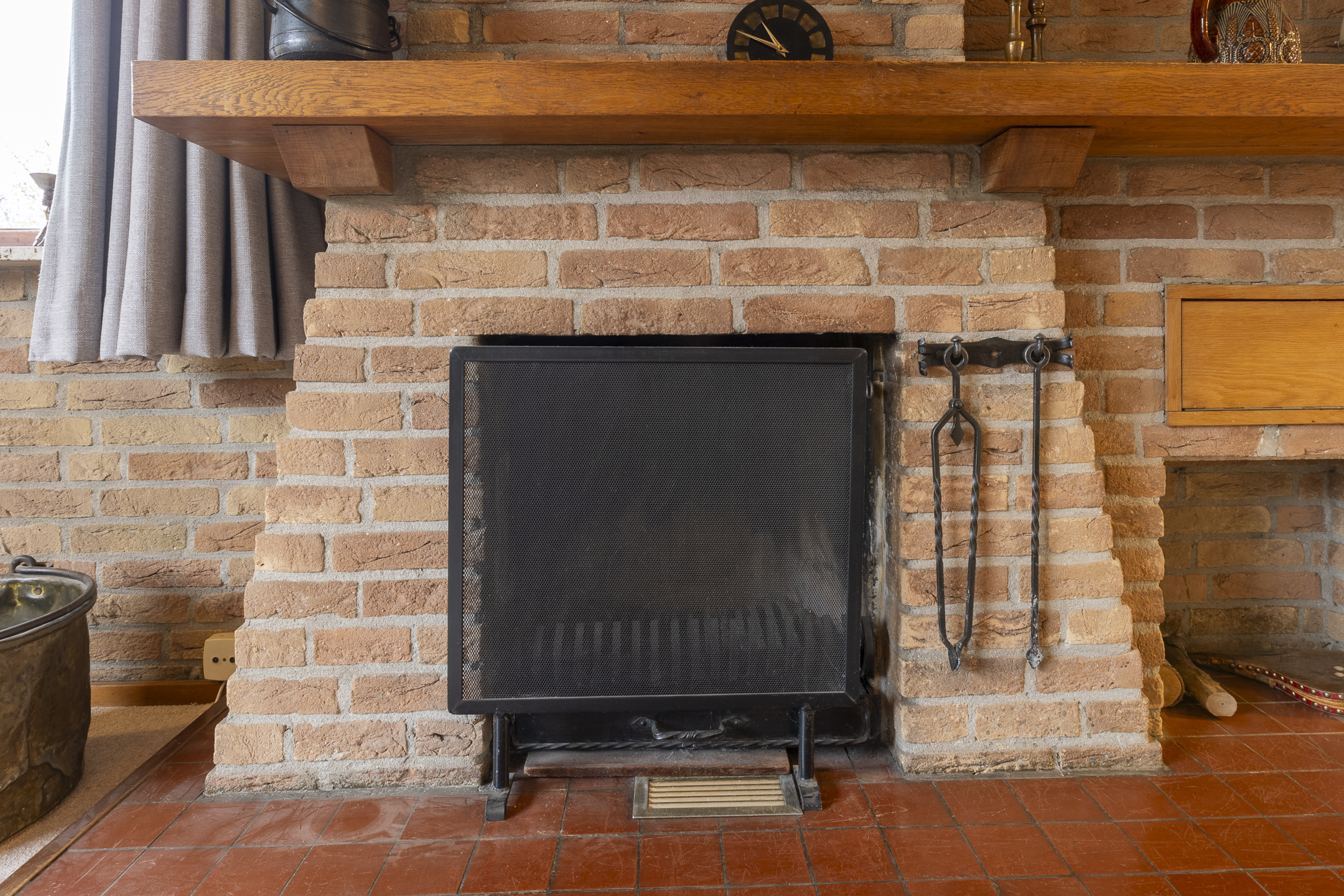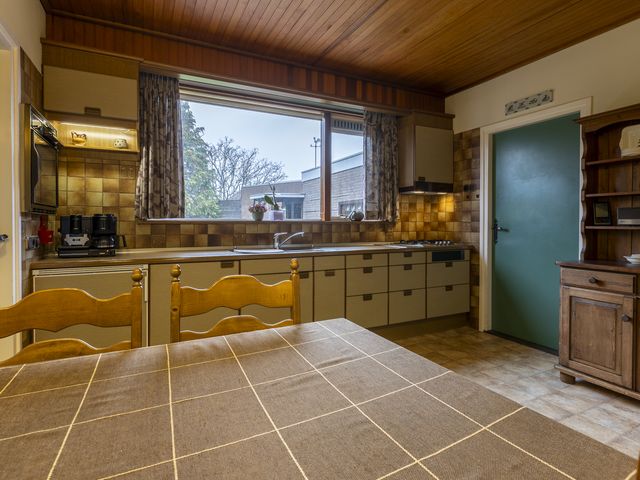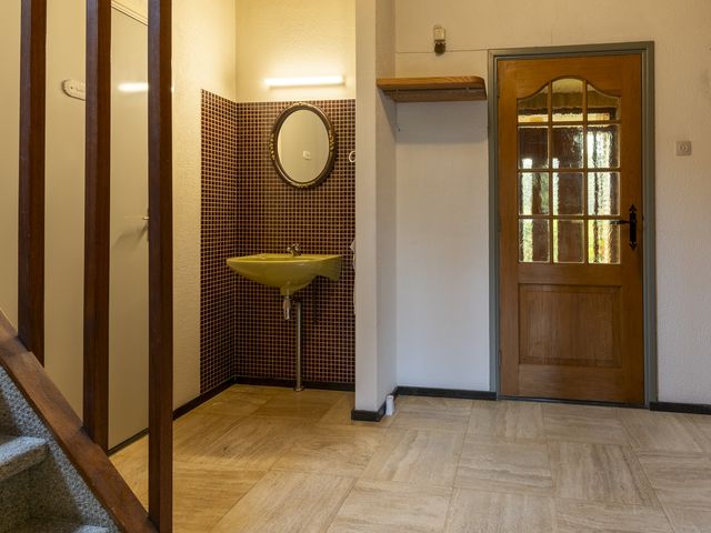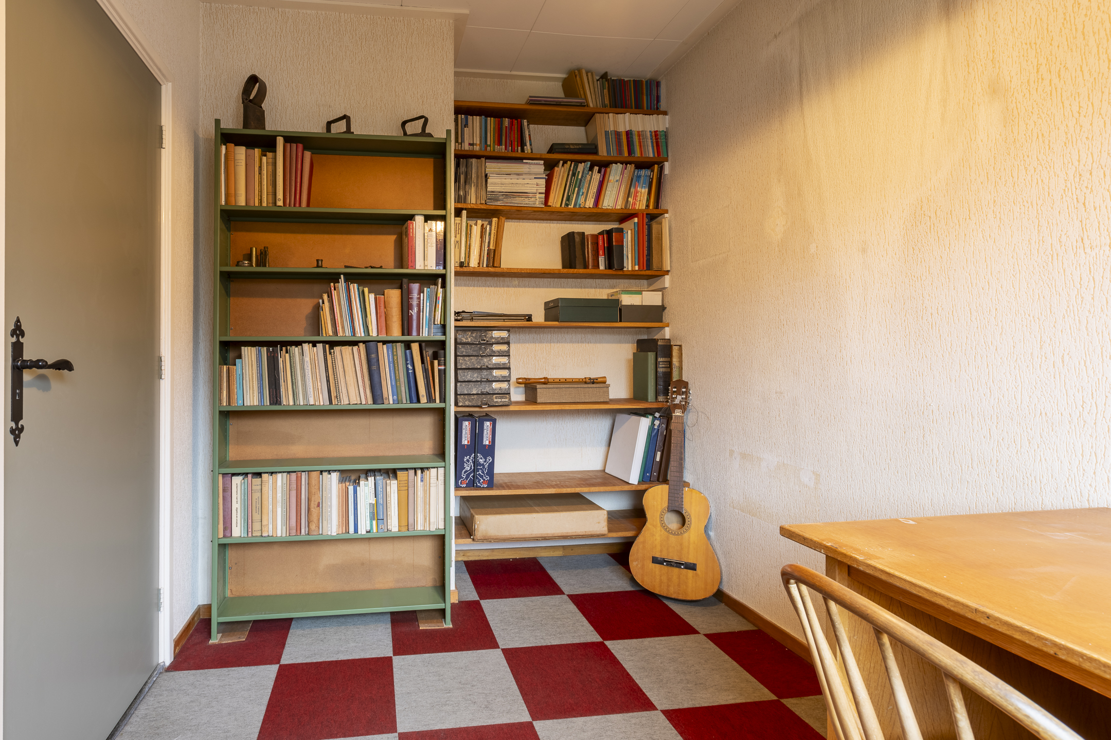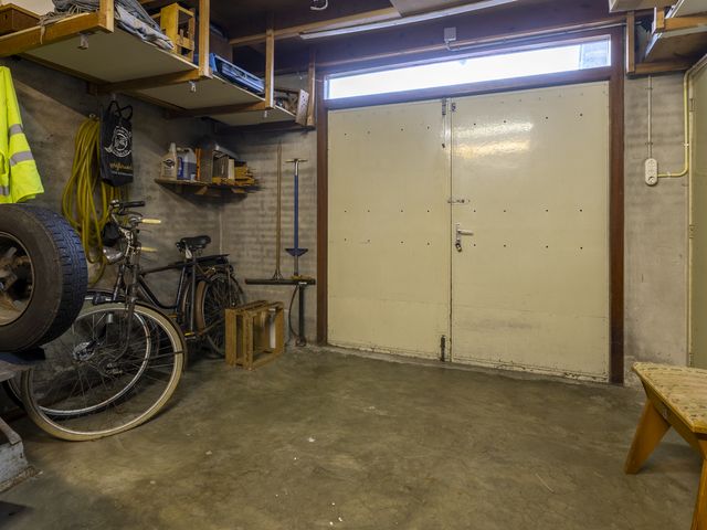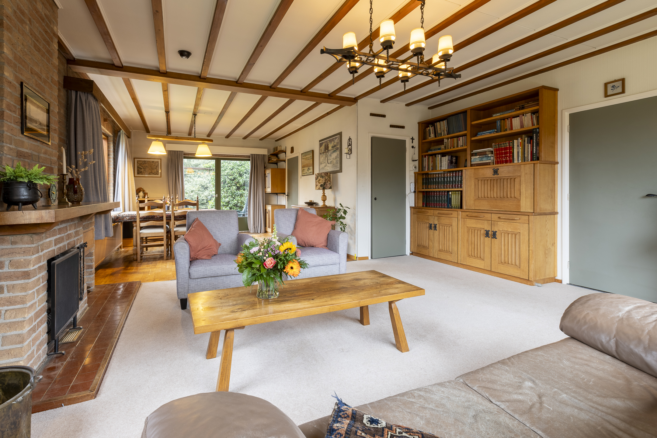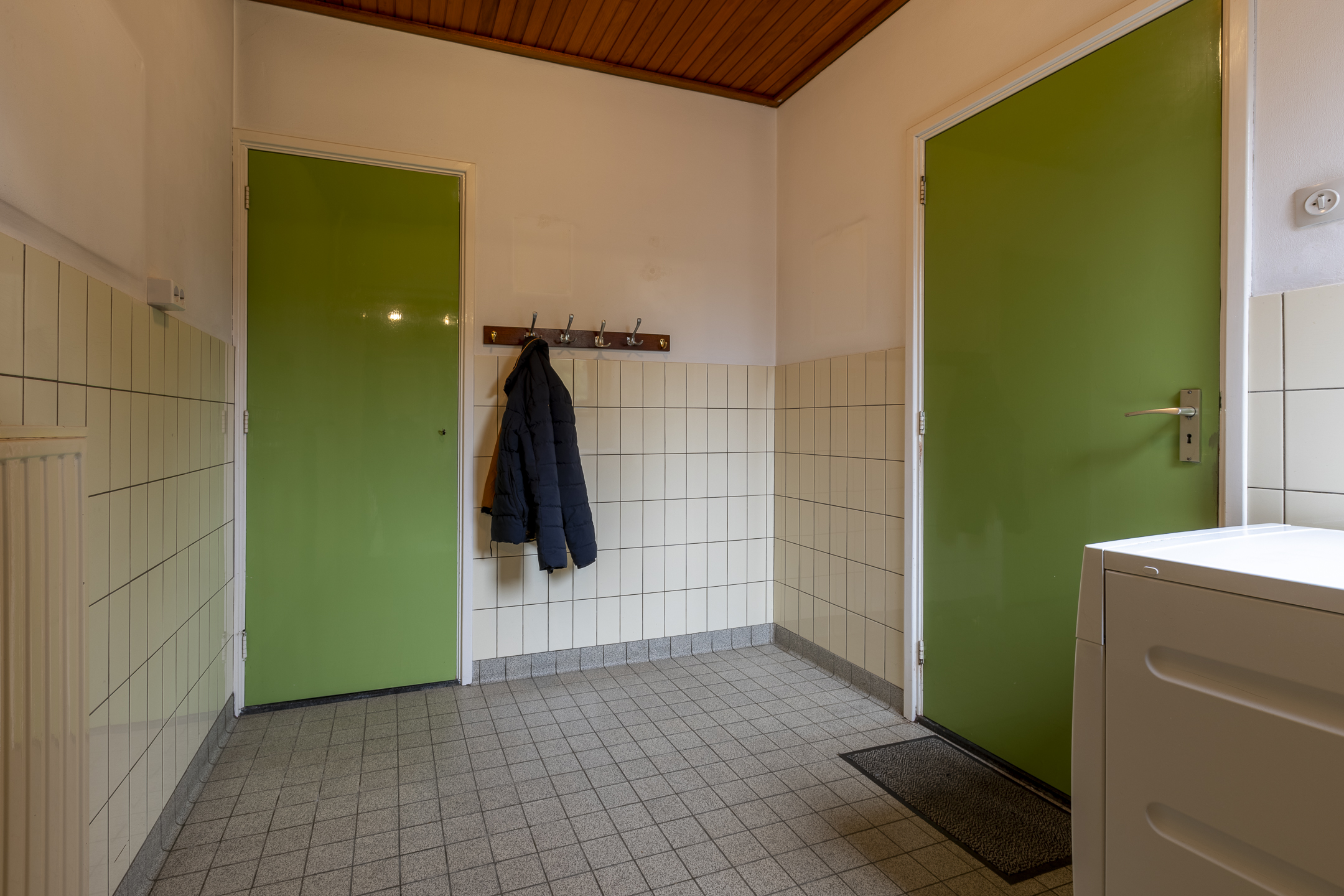 Vanuit de entree bereiken we de ruime woonkamer voorzien van vloerbedekking aan de voorzijde en een houten vloer aan de achterzijde. Dankzij de grote raampartijen is er veel natuurlijk lichtinval. Daarnaast beschikt de woonkamer over rolluiken en een open haard. De gesloten keuken is bereikbaar vanuit de woonkamer en de hal. De gedateerde maar nette keuken beschikt over een tegelvloer, spoelbak, gaskookplaat, oven, koelkast, afzuigkap en veel bergruimte. Vanuit de keuken is er toegang tot zowel de bijkeuken als de kelder. De bijkeuken is voorzien van aansluitingen voor wasapparatuur en biedt toegang tot de garage én de achtertuin. De ruime, multifunctionele garage is ideaal voor hobby, opslag of werkruimte. Aan de voorzijde is de werkkamer gelegen en deze is voorzien van vloerbedekking.