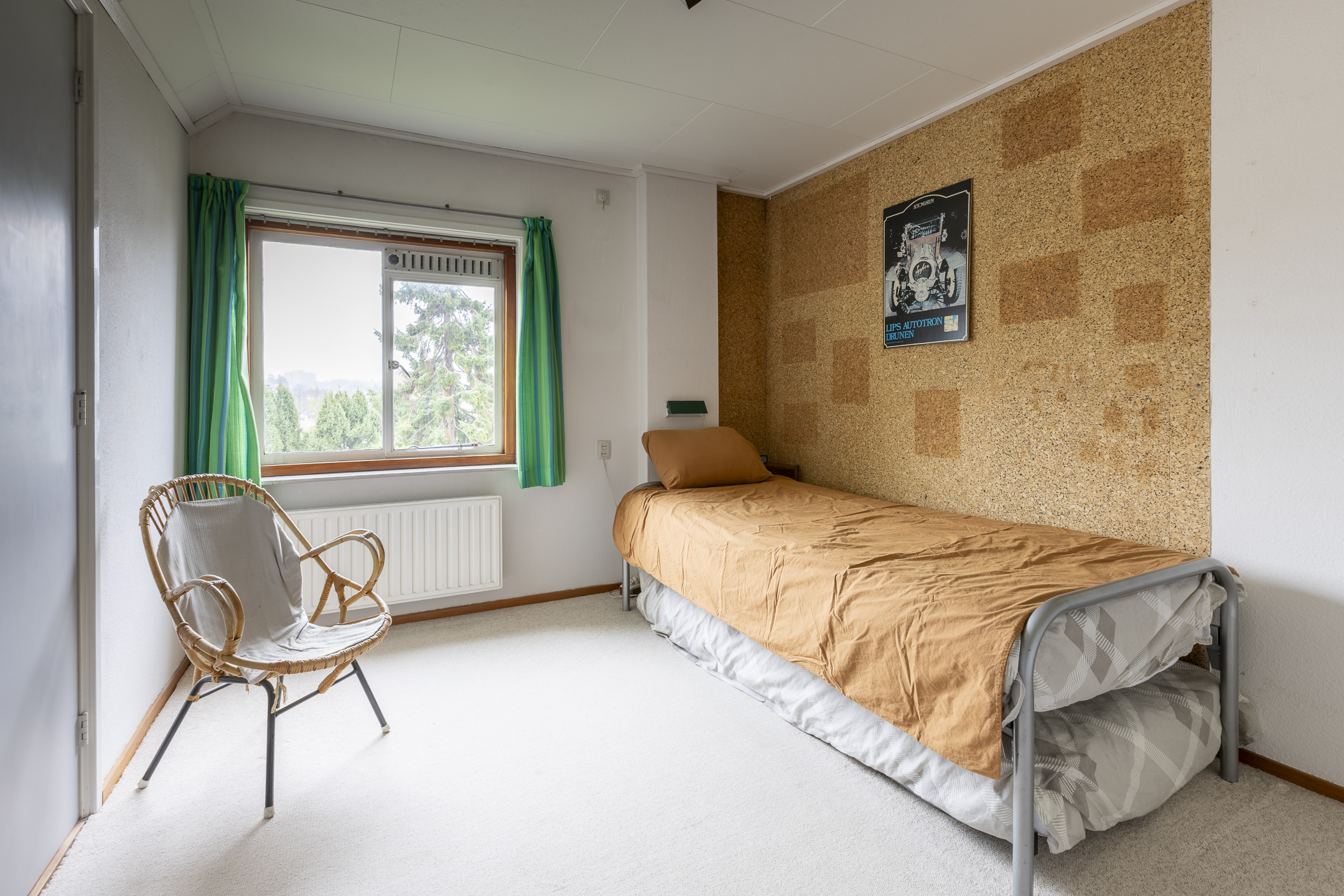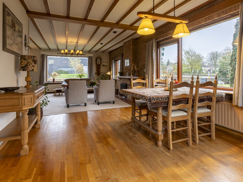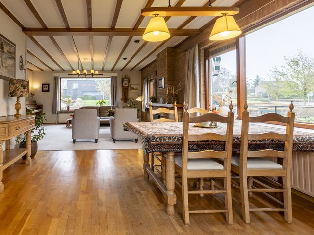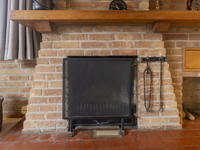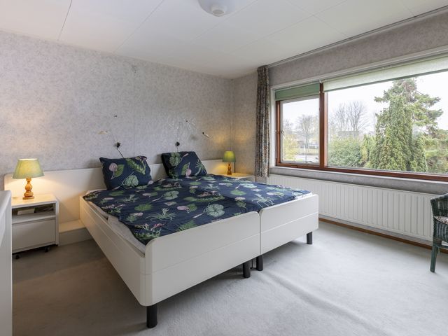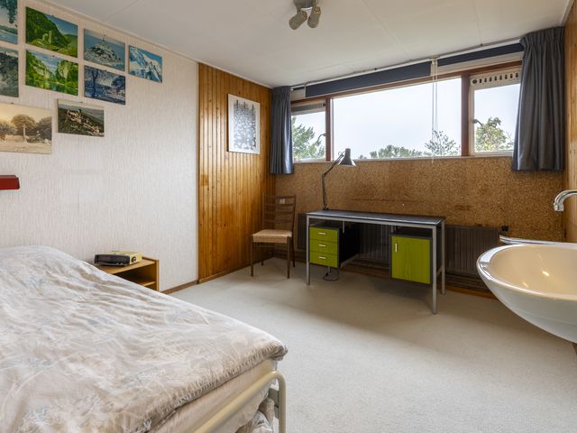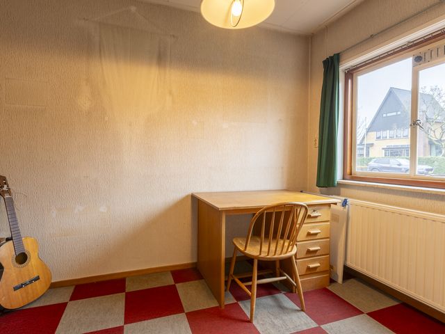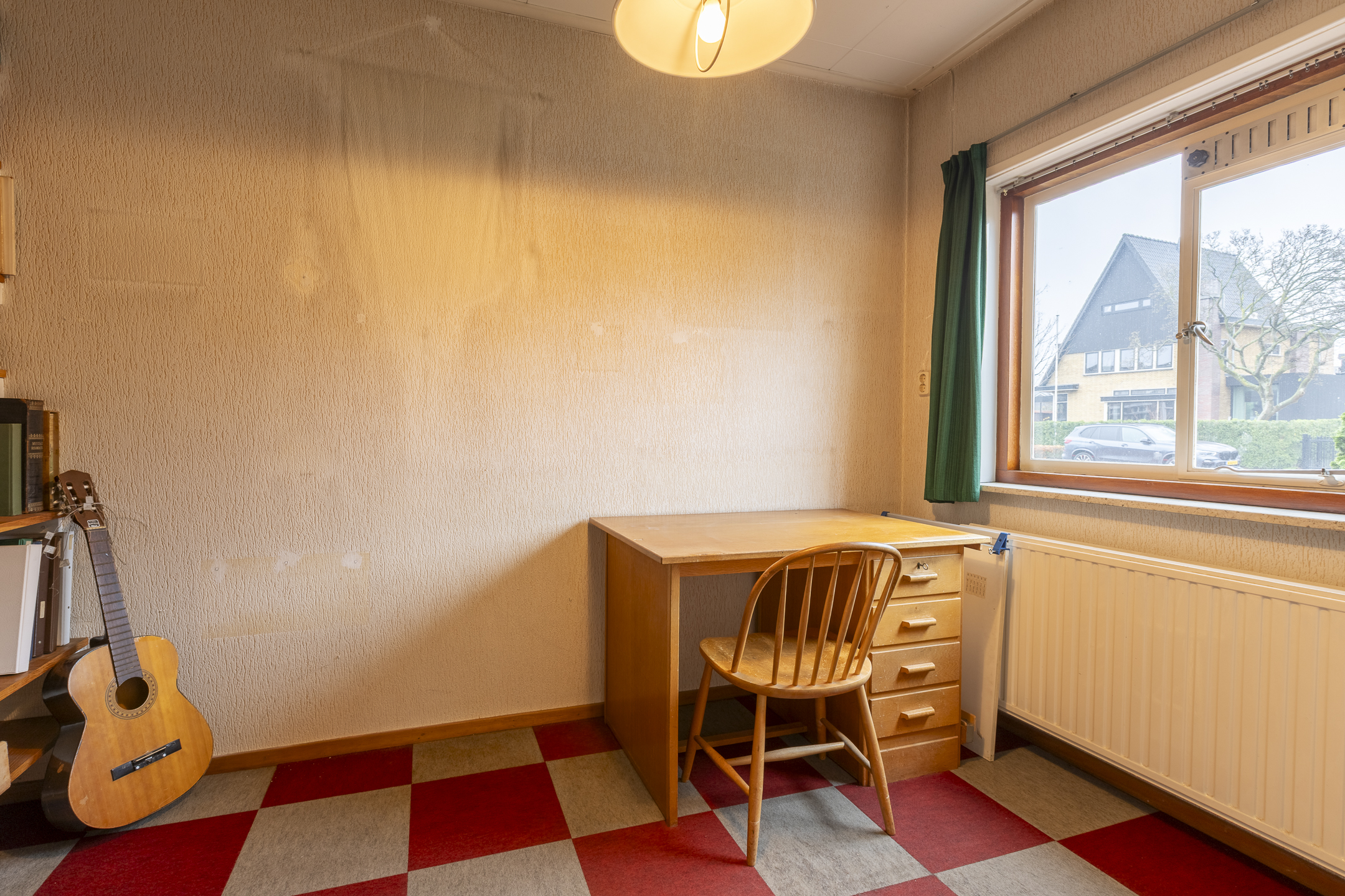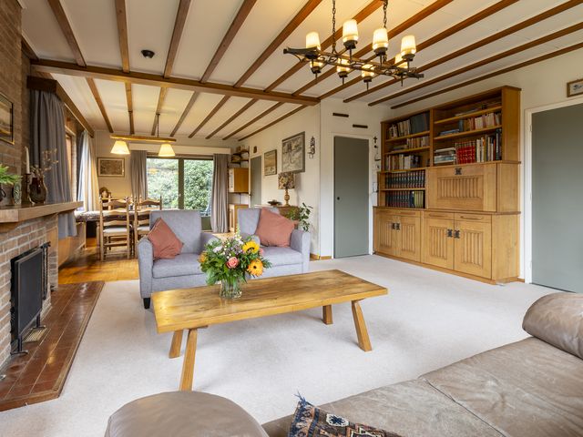 Vanuit de entree bereiken we de ruime woonkamer voorzien van vloerbedekking aan de voorzijde en een houten vloer aan de achterzijde. Dankzij de grote raampartijen is er veel natuurlijk lichtinval. Daarnaast beschikt de woonkamer over rolluiken en een open haard. De gesloten keuken is bereikbaar vanuit de woonkamer en de hal. De gedateerde maar nette keuken beschikt over een tegelvloer, spoelbak, gaskookplaat, oven, koelkast, afzuigkap en veel bergruimte. Vanuit de keuken is er toegang tot zowel de bijkeuken als de kelder. De bijkeuken is voorzien van aansluitingen voor wasapparatuur en biedt toegang tot de garage én de achtertuin. De ruime, multifunctionele garage is ideaal voor hobby, opslag of werkruimte. Aan de voorzijde is de werkkamer gelegen en deze is voorzien van vloerbedekking.