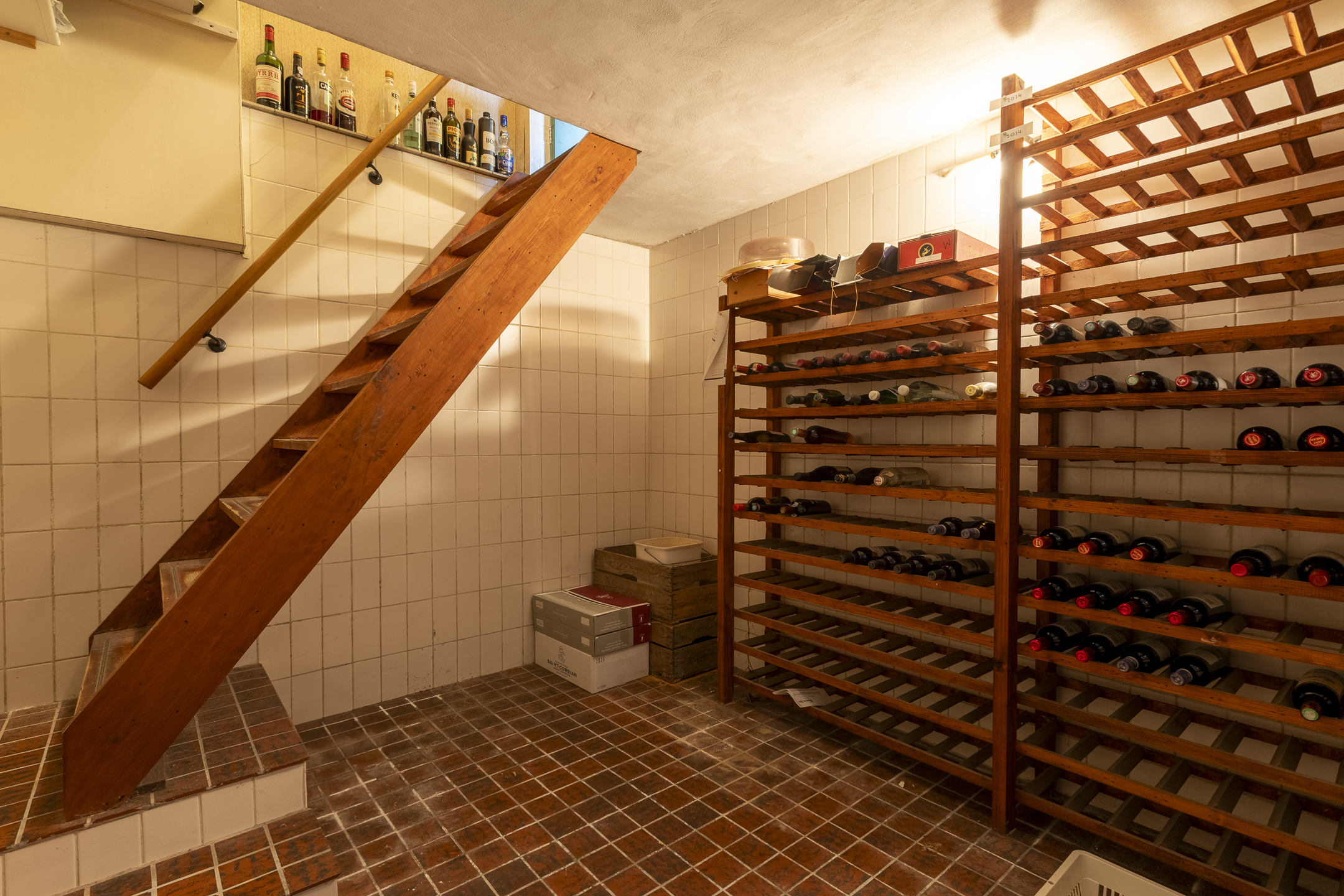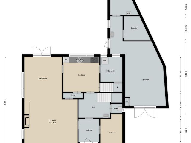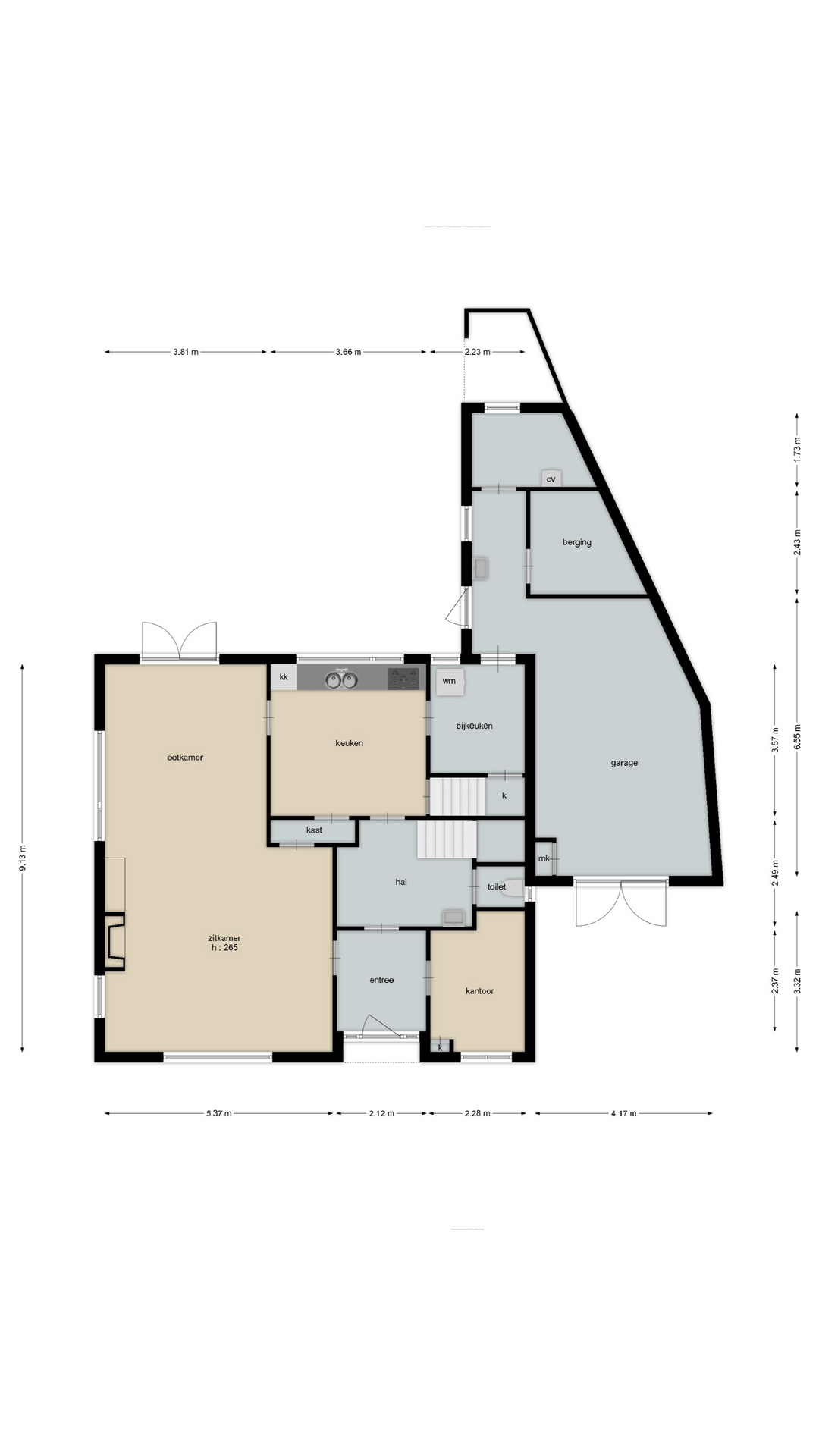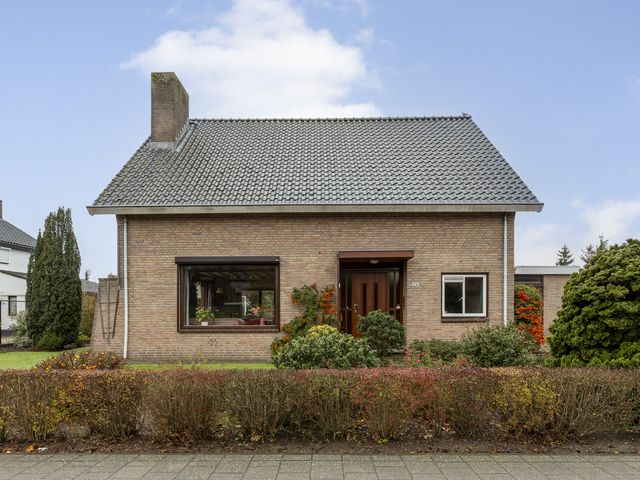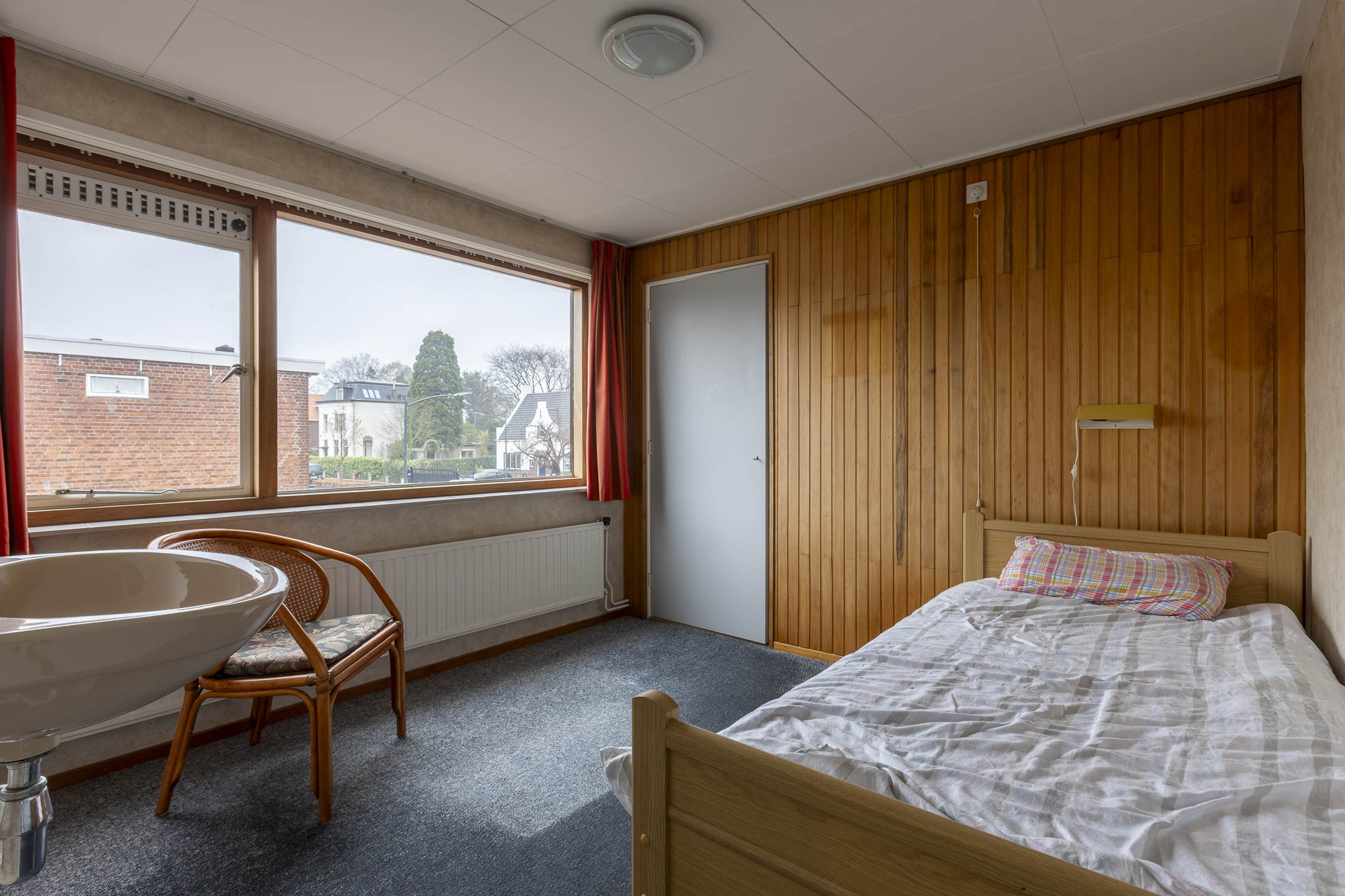 Vanuit de entree bereiken we de ruime woonkamer voorzien van vloerbedekking aan de voorzijde en een houten vloer aan de achterzijde. Dankzij de grote raampartijen is er veel natuurlijk lichtinval. Daarnaast beschikt de woonkamer over rolluiken en een open haard. De gesloten keuken is bereikbaar vanuit de woonkamer en de hal. De gedateerde maar nette keuken beschikt over een tegelvloer, spoelbak, gaskookplaat, oven, koelkast, afzuigkap en veel bergruimte. Vanuit de keuken is er toegang tot zowel de bijkeuken als de kelder. De bijkeuken is voorzien van aansluitingen voor wasapparatuur en biedt toegang tot de garage én de achtertuin. De ruime, multifunctionele garage is ideaal voor hobby, opslag of werkruimte. Aan de voorzijde is de werkkamer gelegen en deze is voorzien van vloerbedekking.