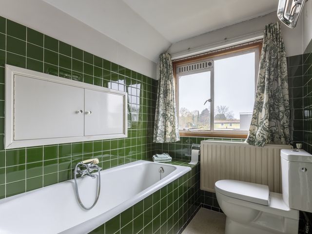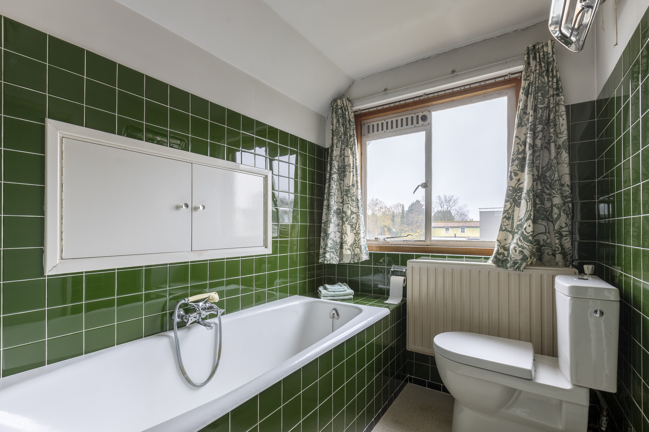 Betegelde badkamer voorzien van ligbad, vrijstaande toilet, douche en wastafel.
