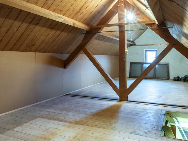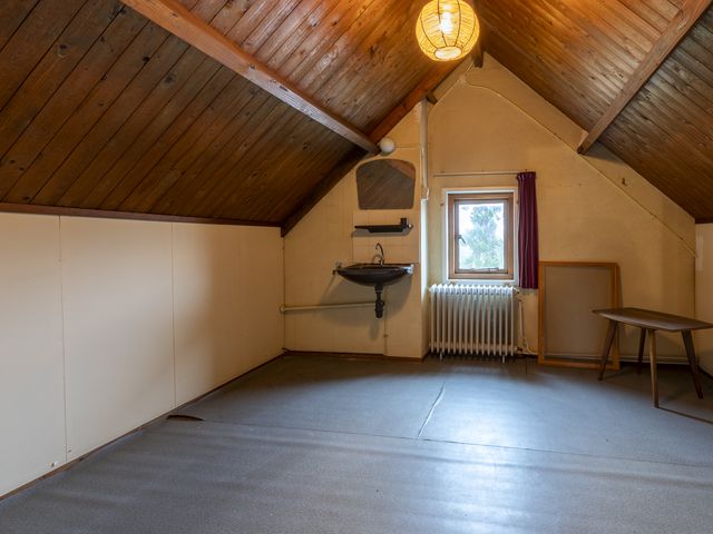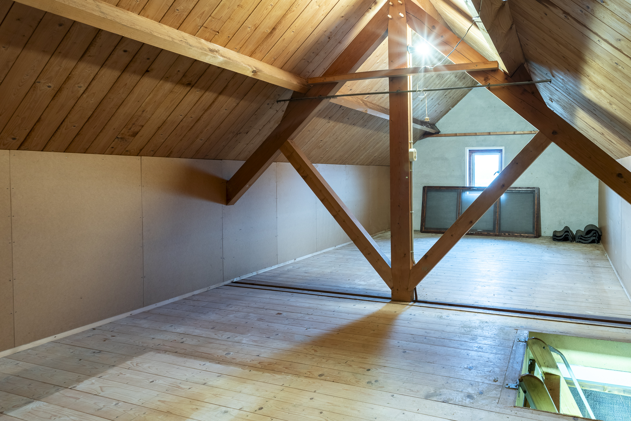 Middels vlizotrap te bereiken bergzolder opgedeeld in twee kamers met verwarming en ramen.