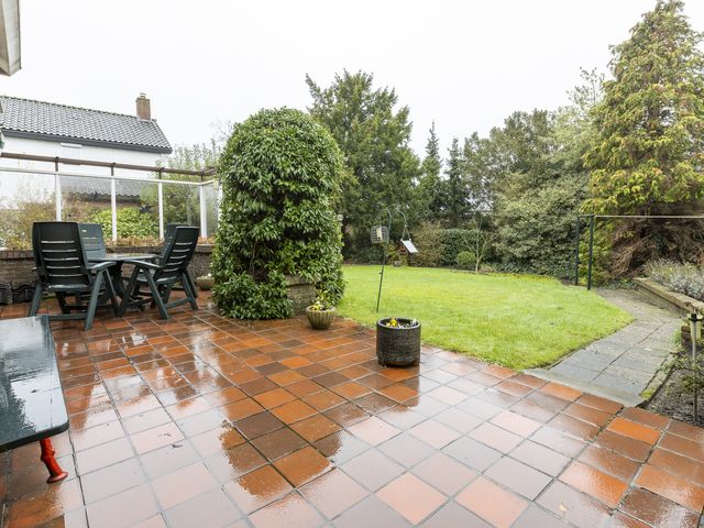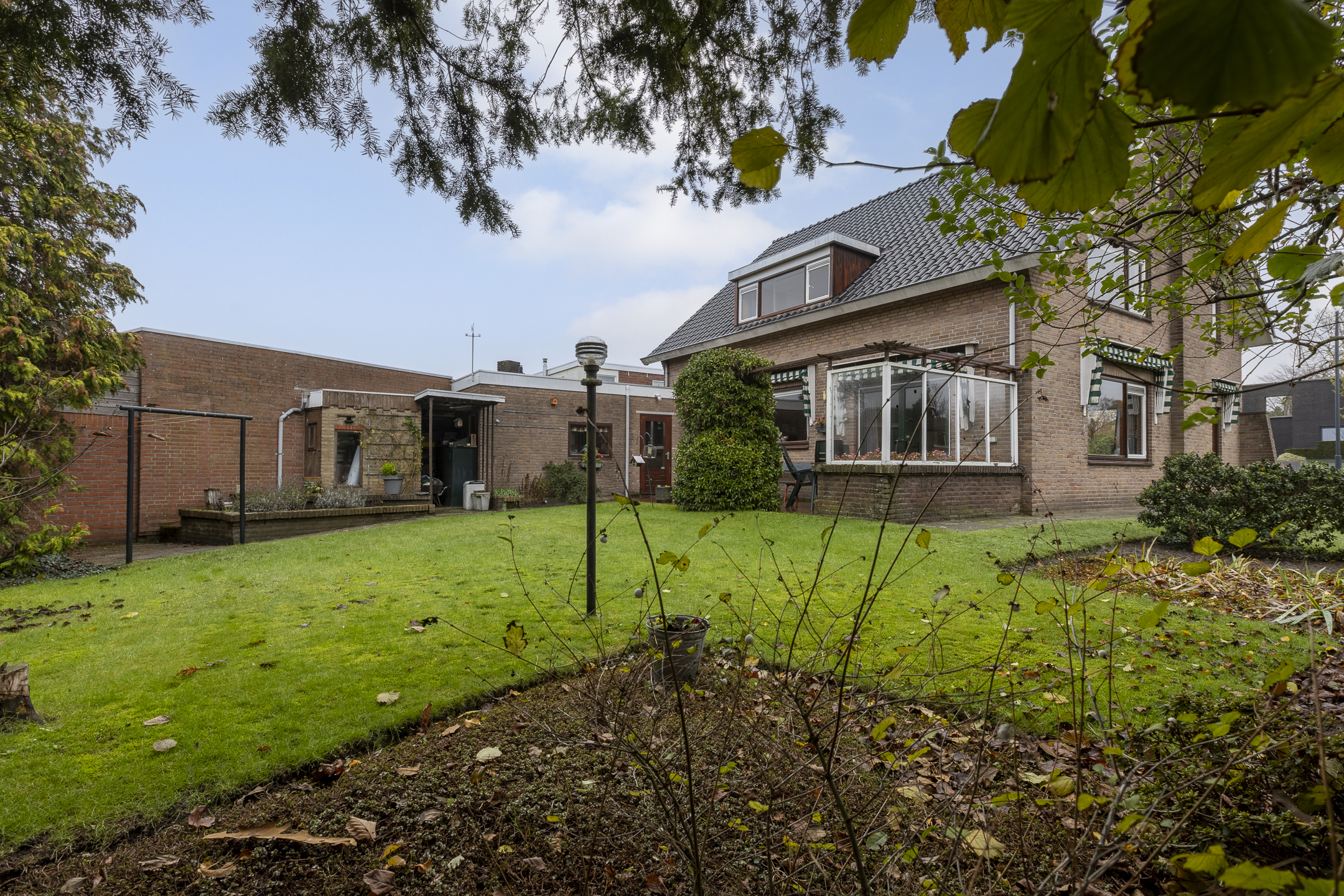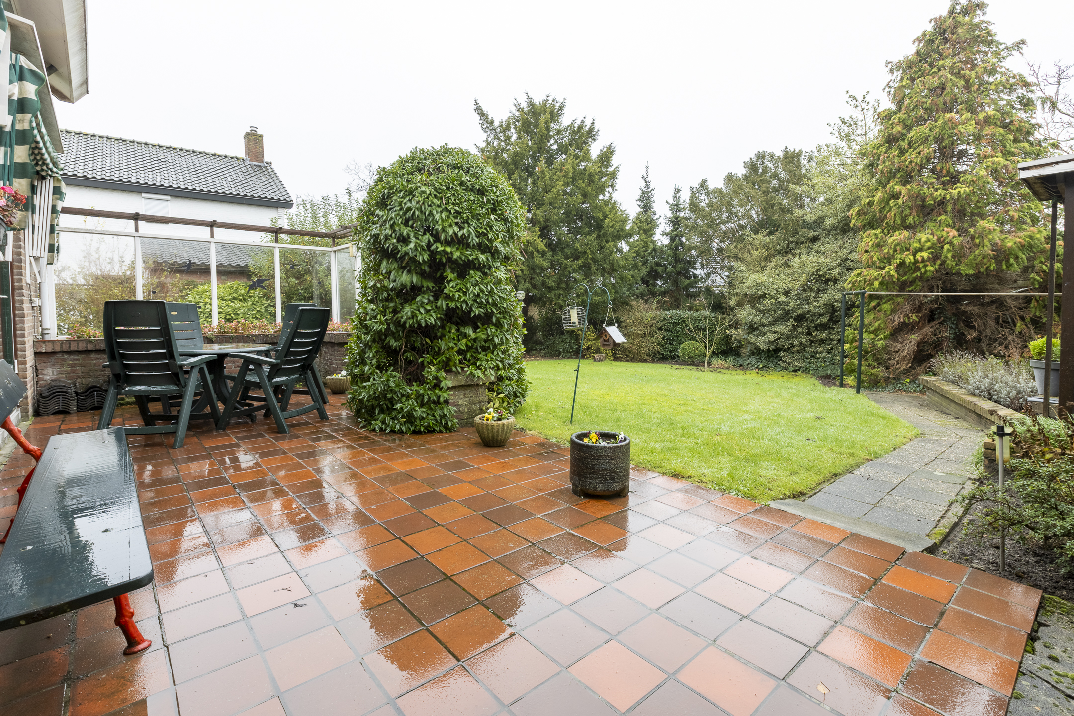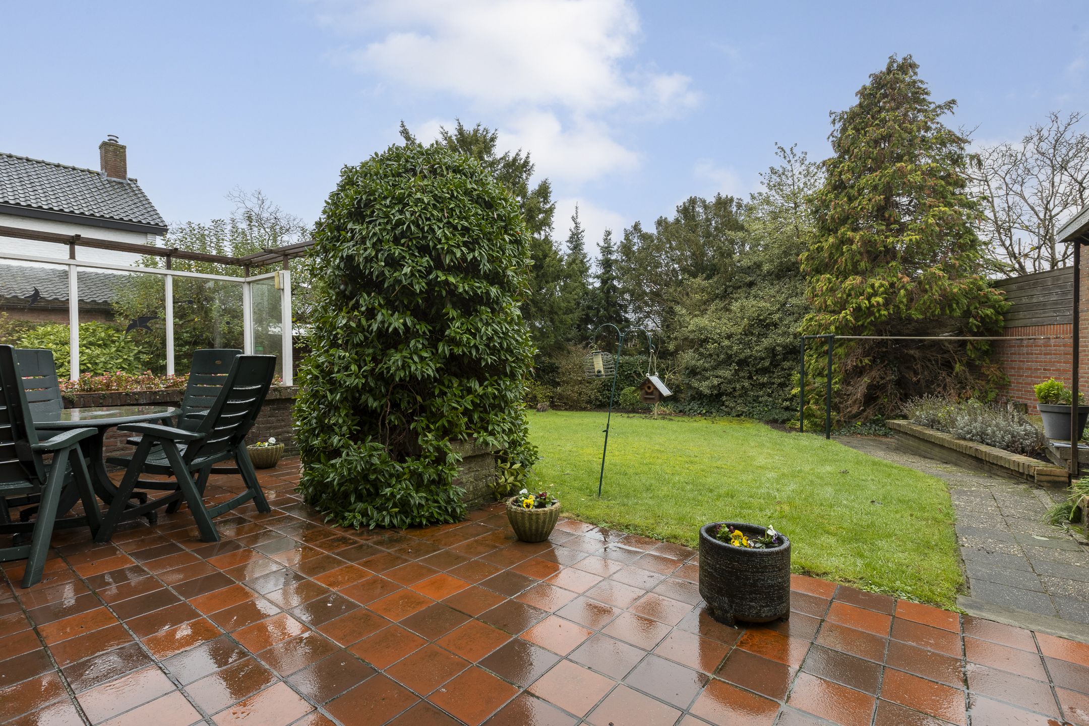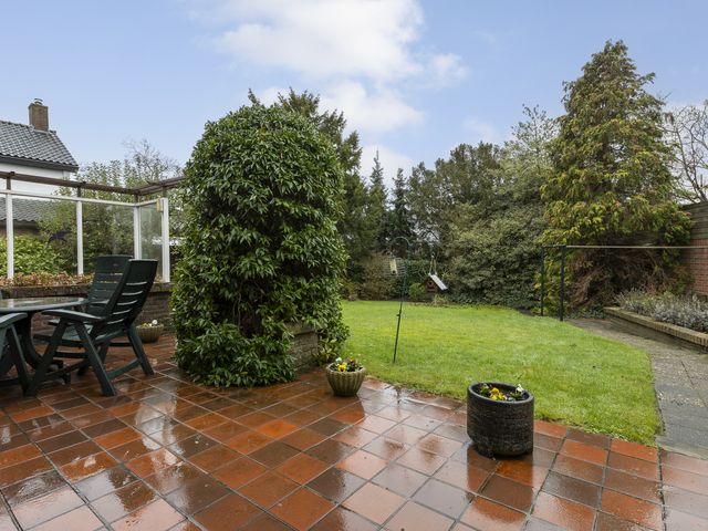 De privacybediende achtertuin is groen en ruim opgezet, met een groot gazon en voldoende beplanting rondom en een betegeld terras. De achtertuin biedt daarnaast directe toegang tot de garage.
