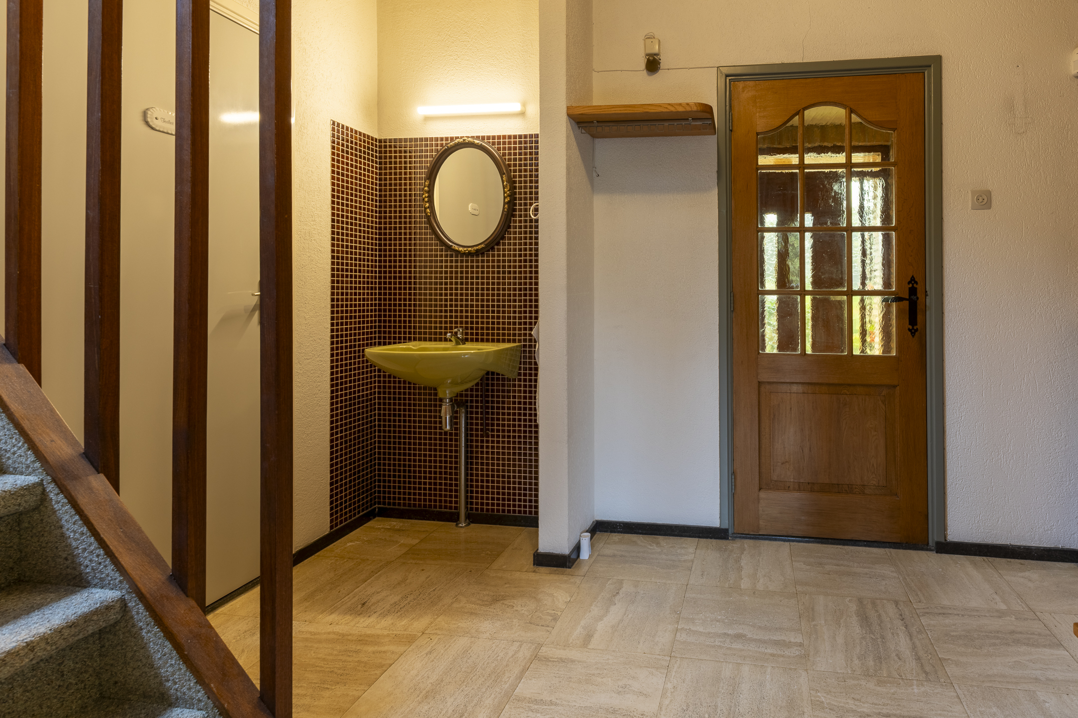 Entree met toegang tot de werkkamer, de woonkamer, trapopgang en toiletruimte met vrijhangend toilet en fonteintje.