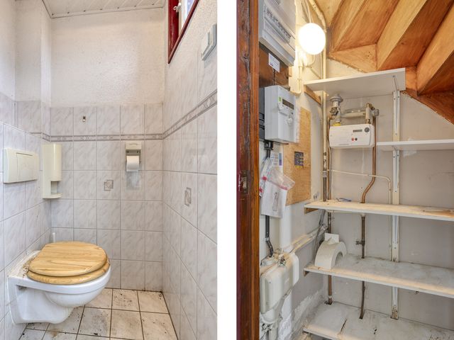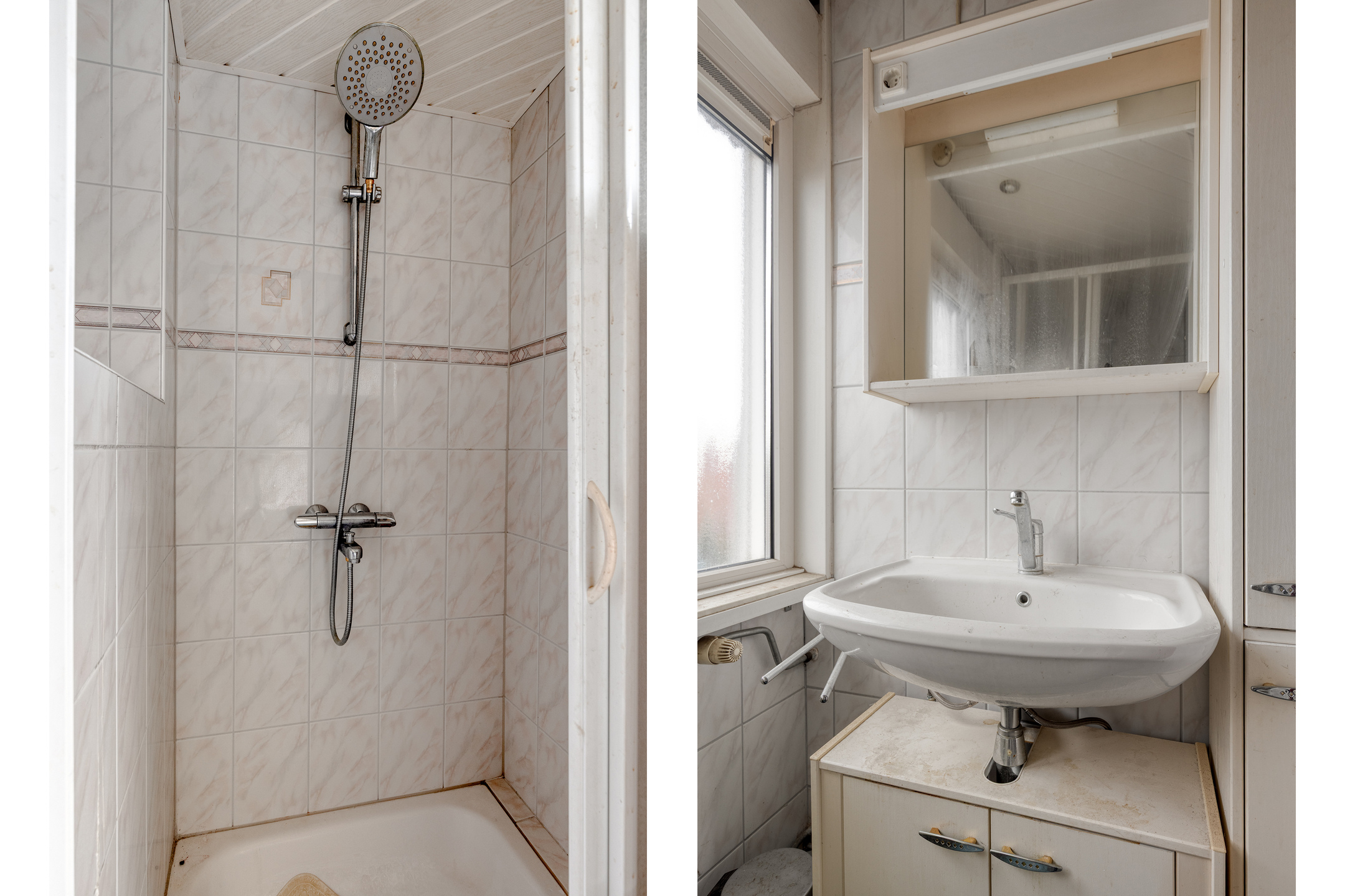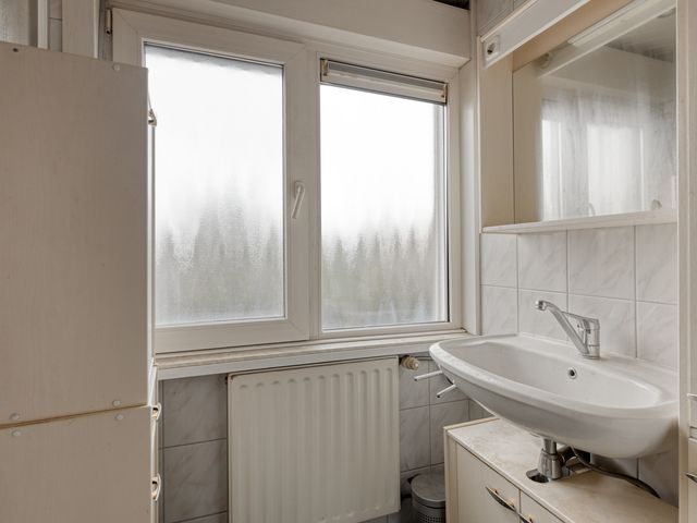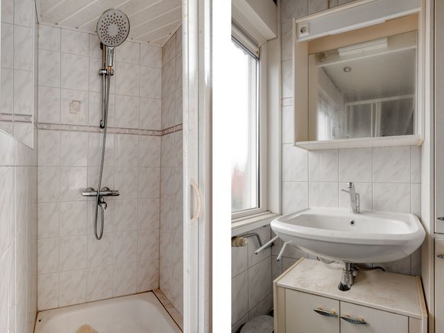De volledig betegelde badkamer beschikt over een wastafel, douchebak en kunststof kozijn met HR++-glas en draaikiepfunctie.
