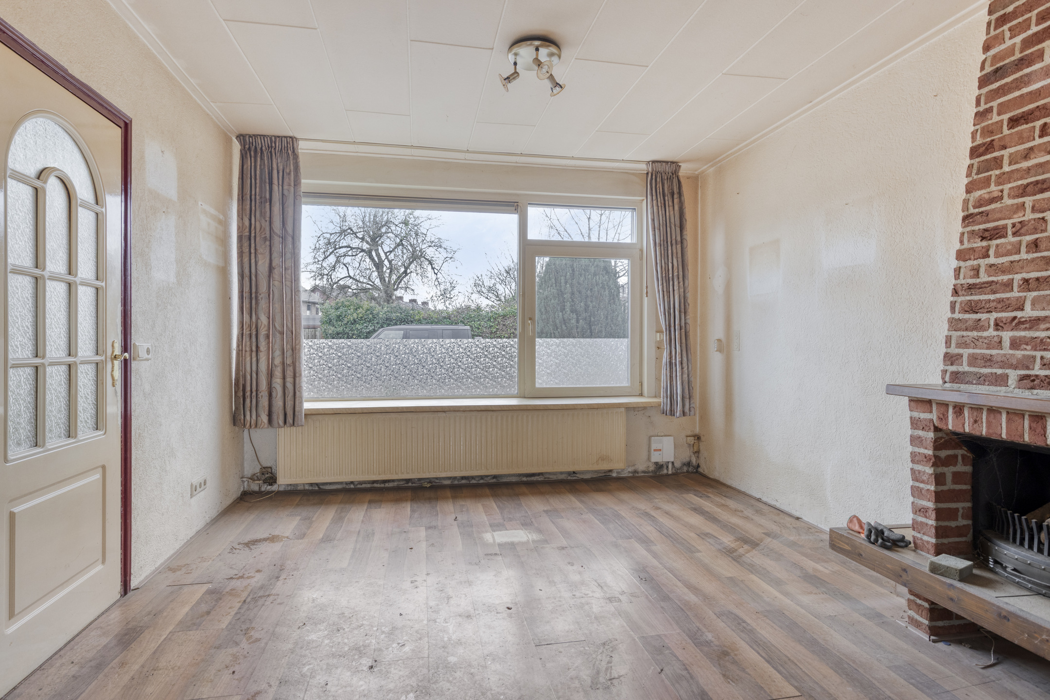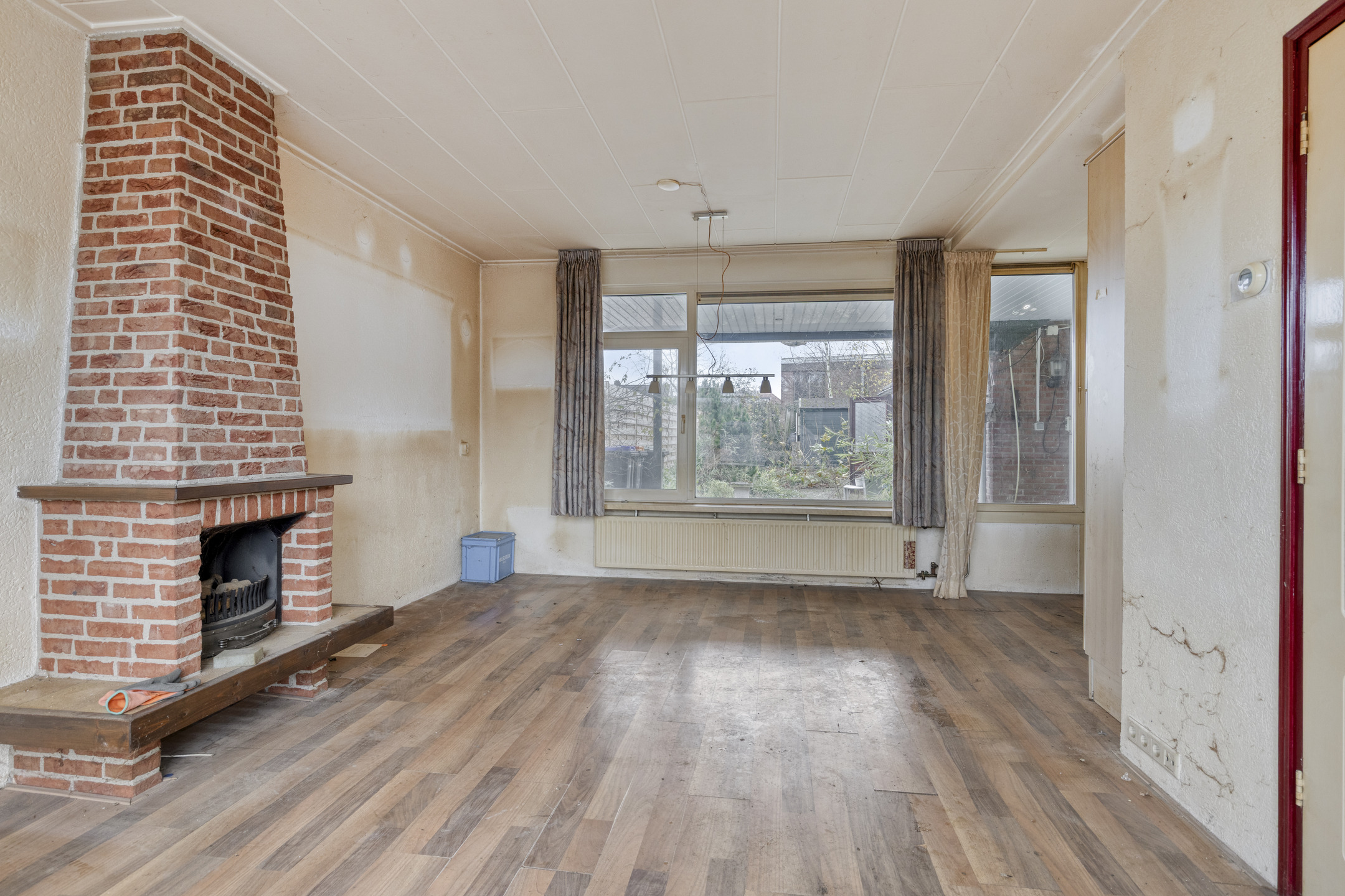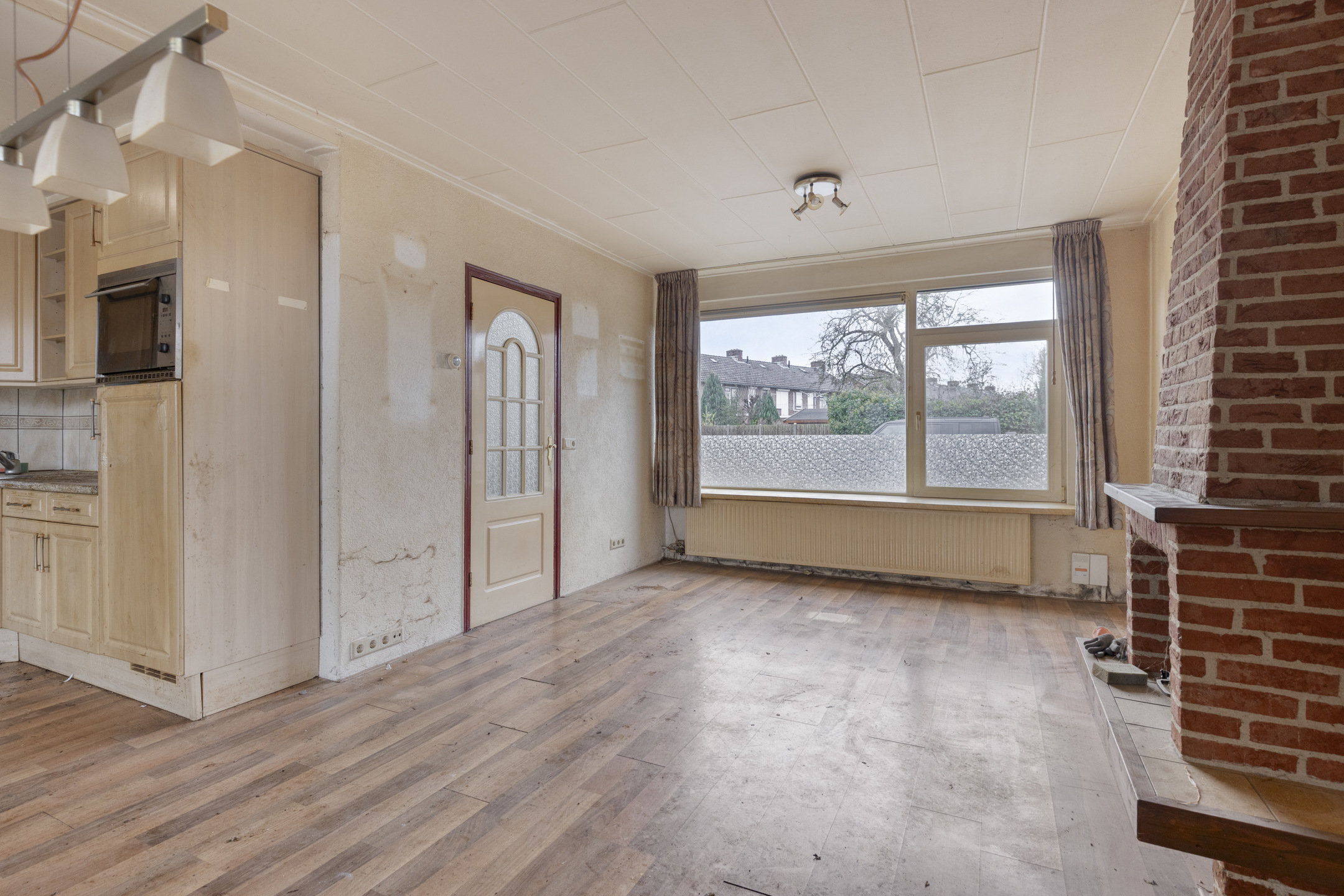 De lichte woonkamer is afgewerkt met een laminaatvloer en Spachtelputz wandafwerking. Ook hier zijn kunststof kozijnen met HR++-glas aanwezig.
