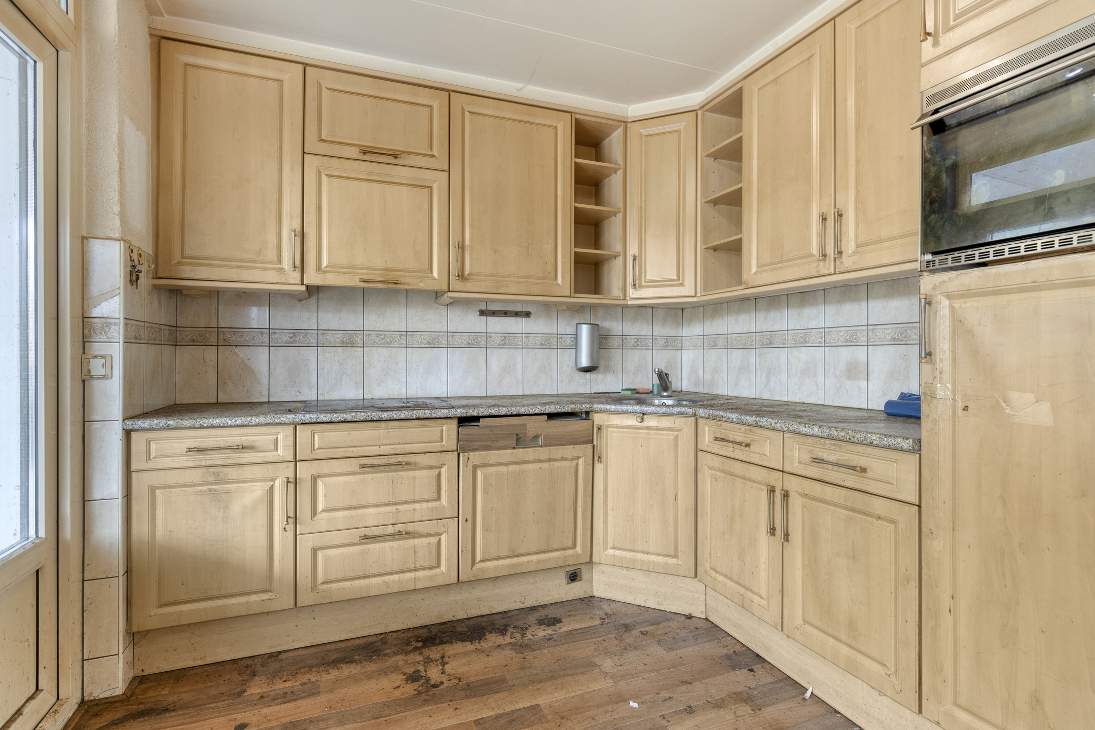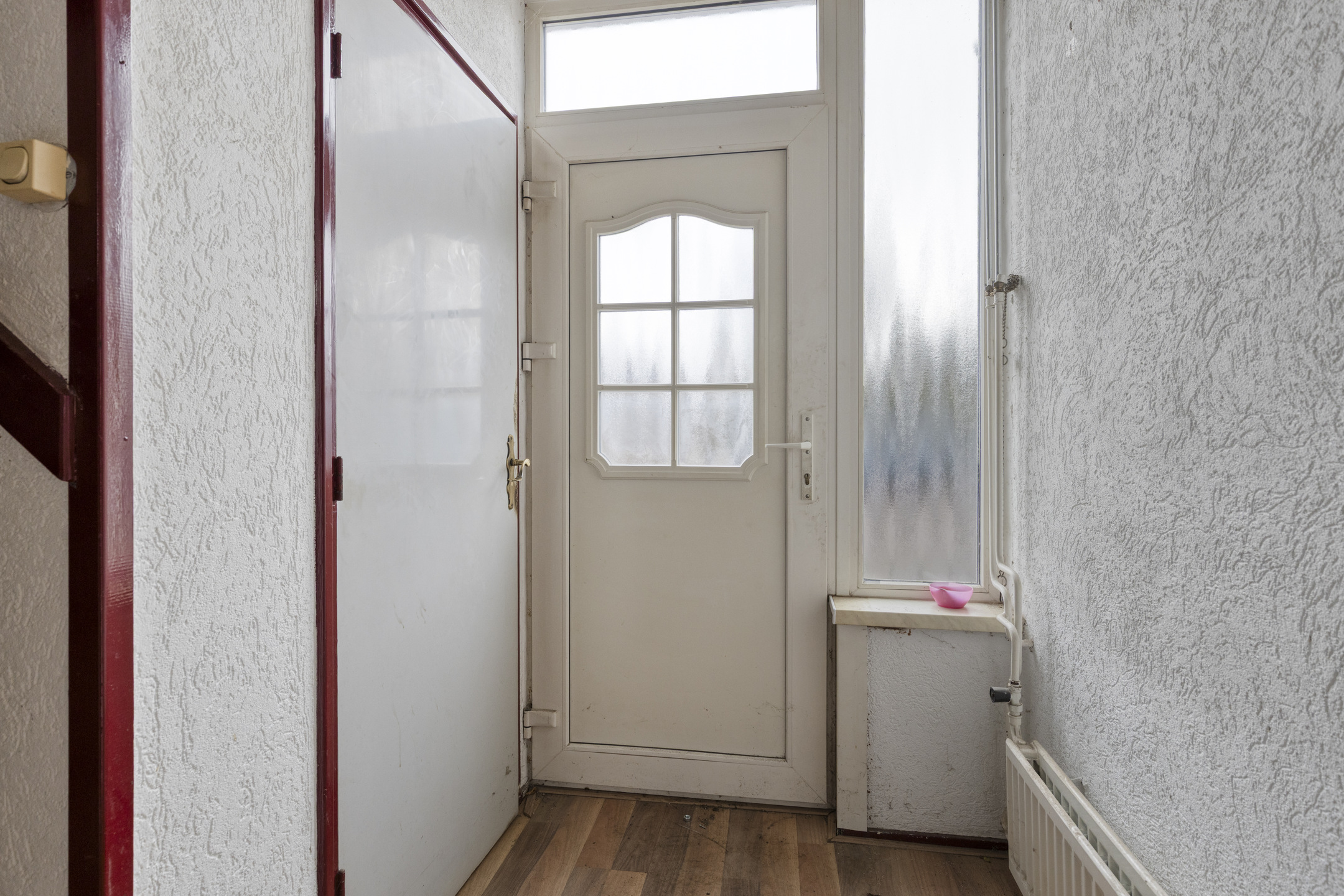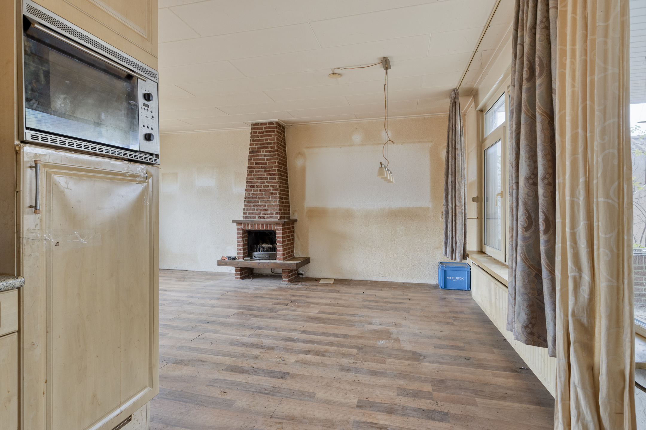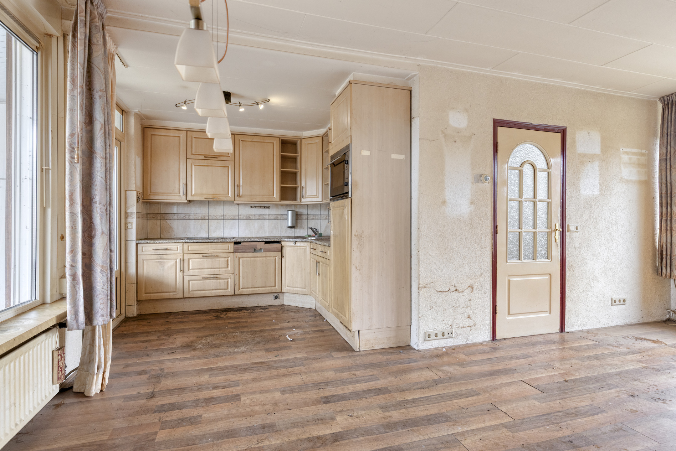 De lichte woonkamer is afgewerkt met een laminaatvloer en Spachtelputz wandafwerking. Ook hier zijn kunststof kozijnen met HR++-glas aanwezig.