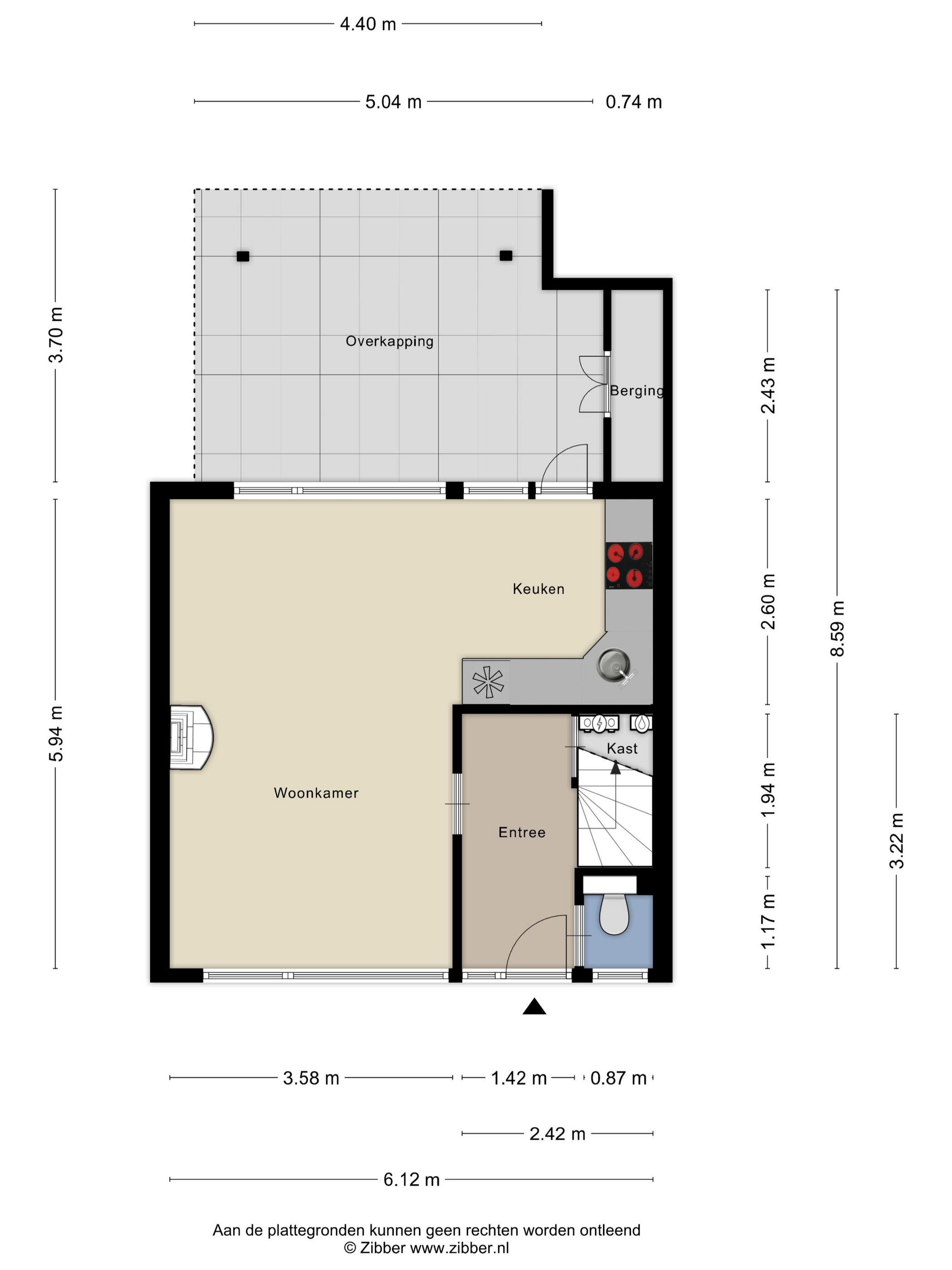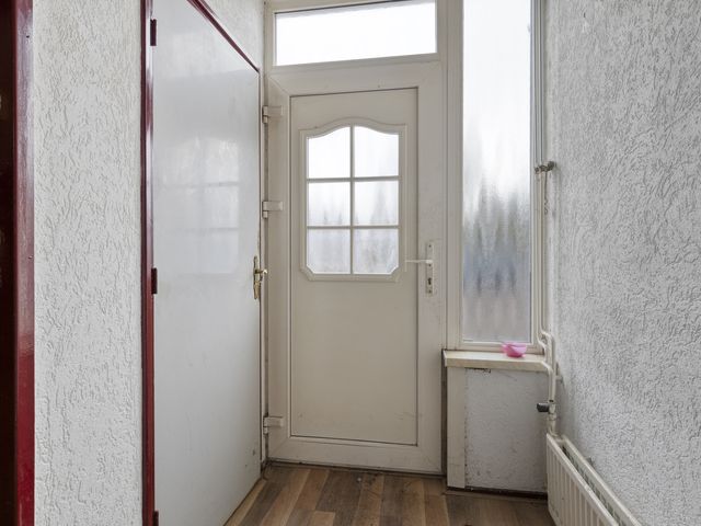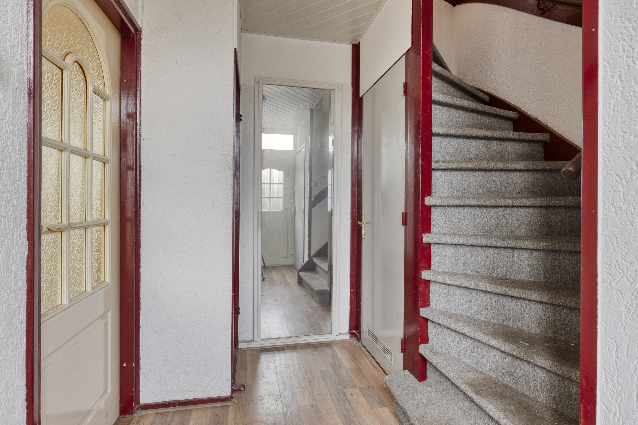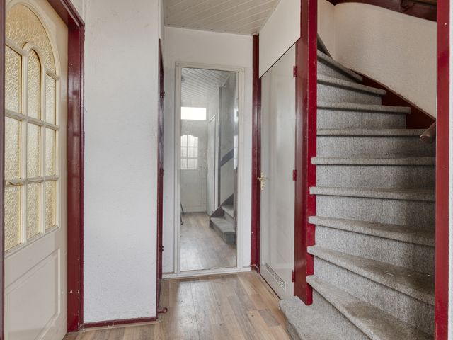 De entree betreft een hal met laminaatvloer, welke toegang biedt tot de deels betegelde toiletruimte, de trapkast, de woonkamer en de trapopgang naar de eerste verdieping. De hal is voorzien van kunststof kozijnen met HR++-beglazing.