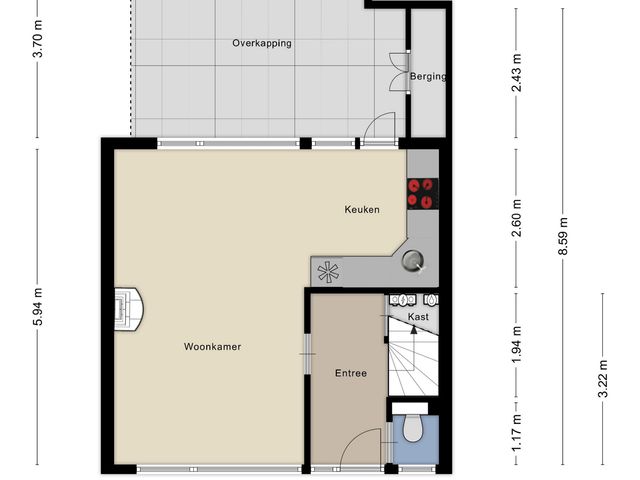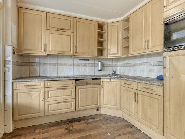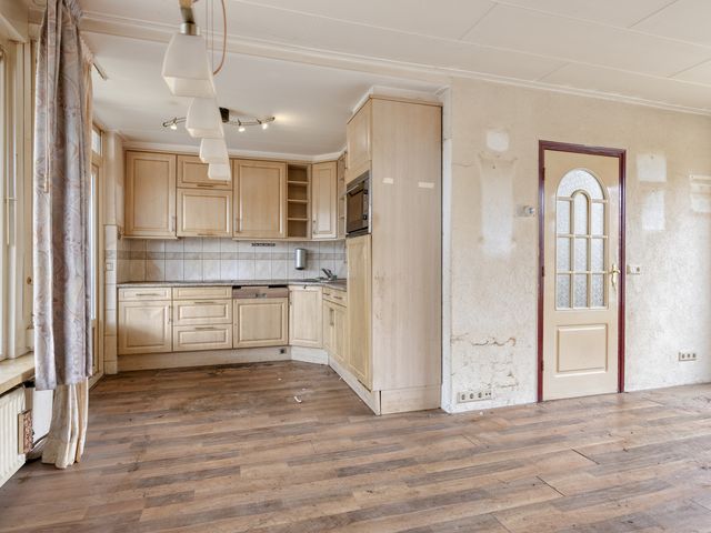 De aangrenzende keuken is uitgerust met een koelkast, oven, gaskookplaat, afzuigkap en een spoelbak. Vanuit de keuken is de achtertuin bereikbaar.