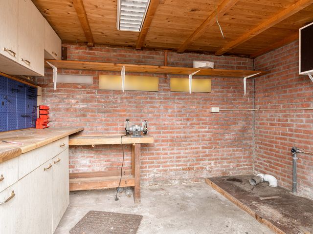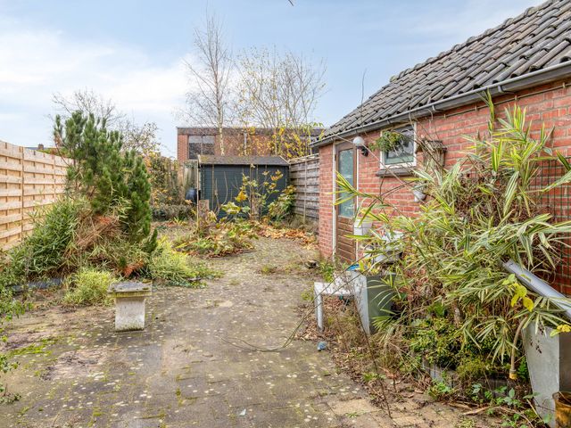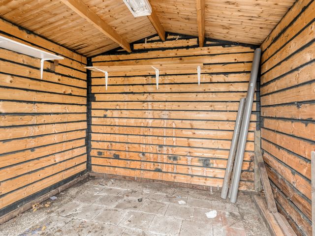 De riante, op het zuidoosten gelegen achtertuin beschikt over een aangebouwde stenen berging, een vrijstaande houten berging en een praktische achterom.