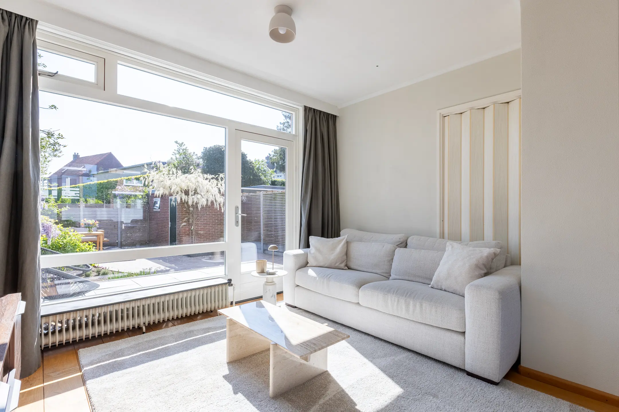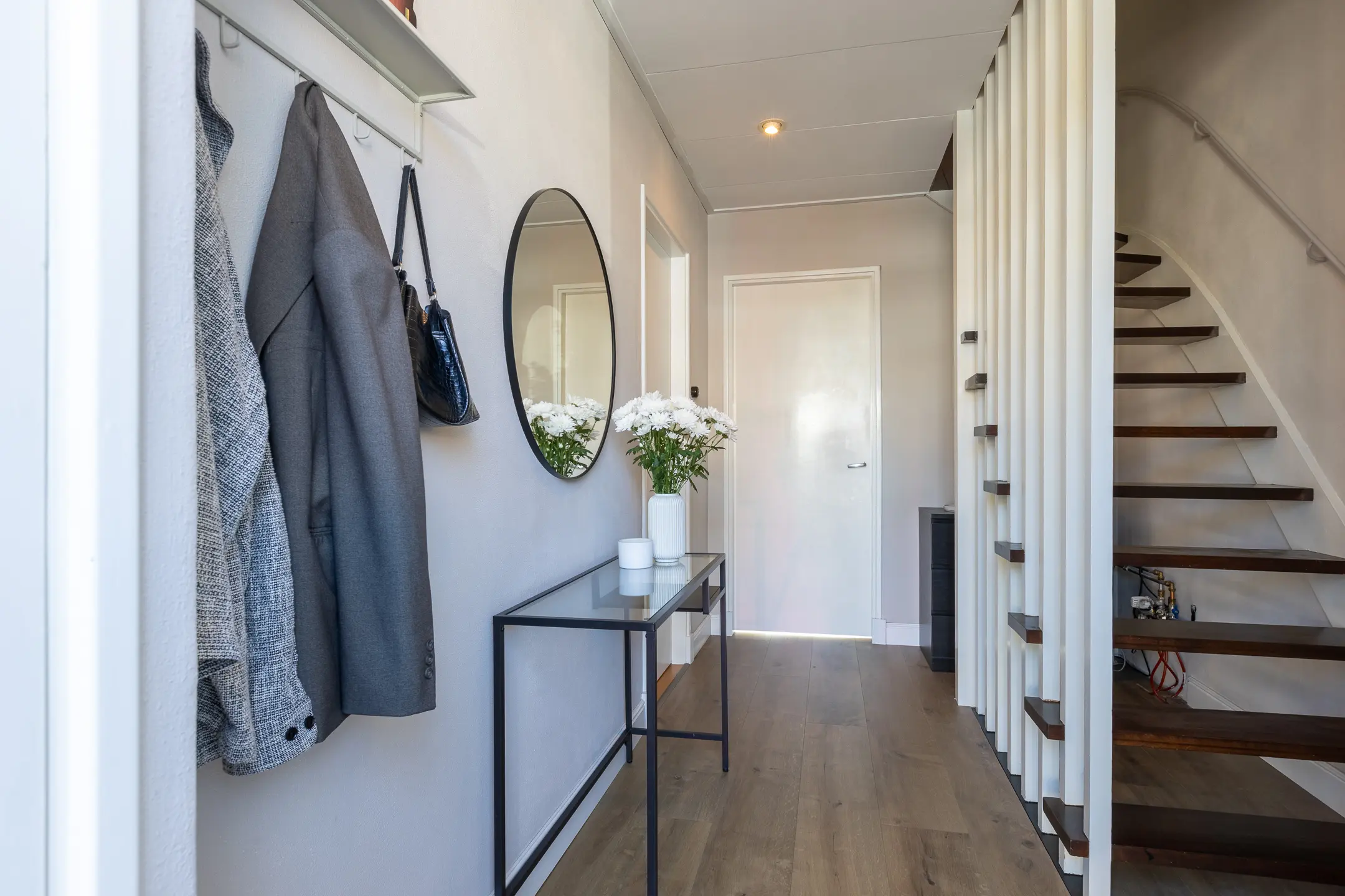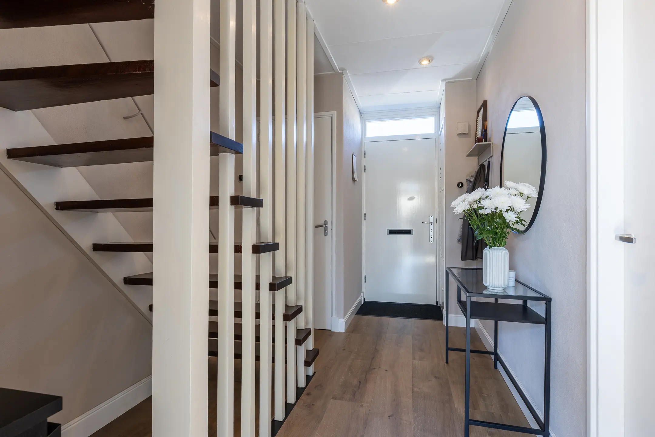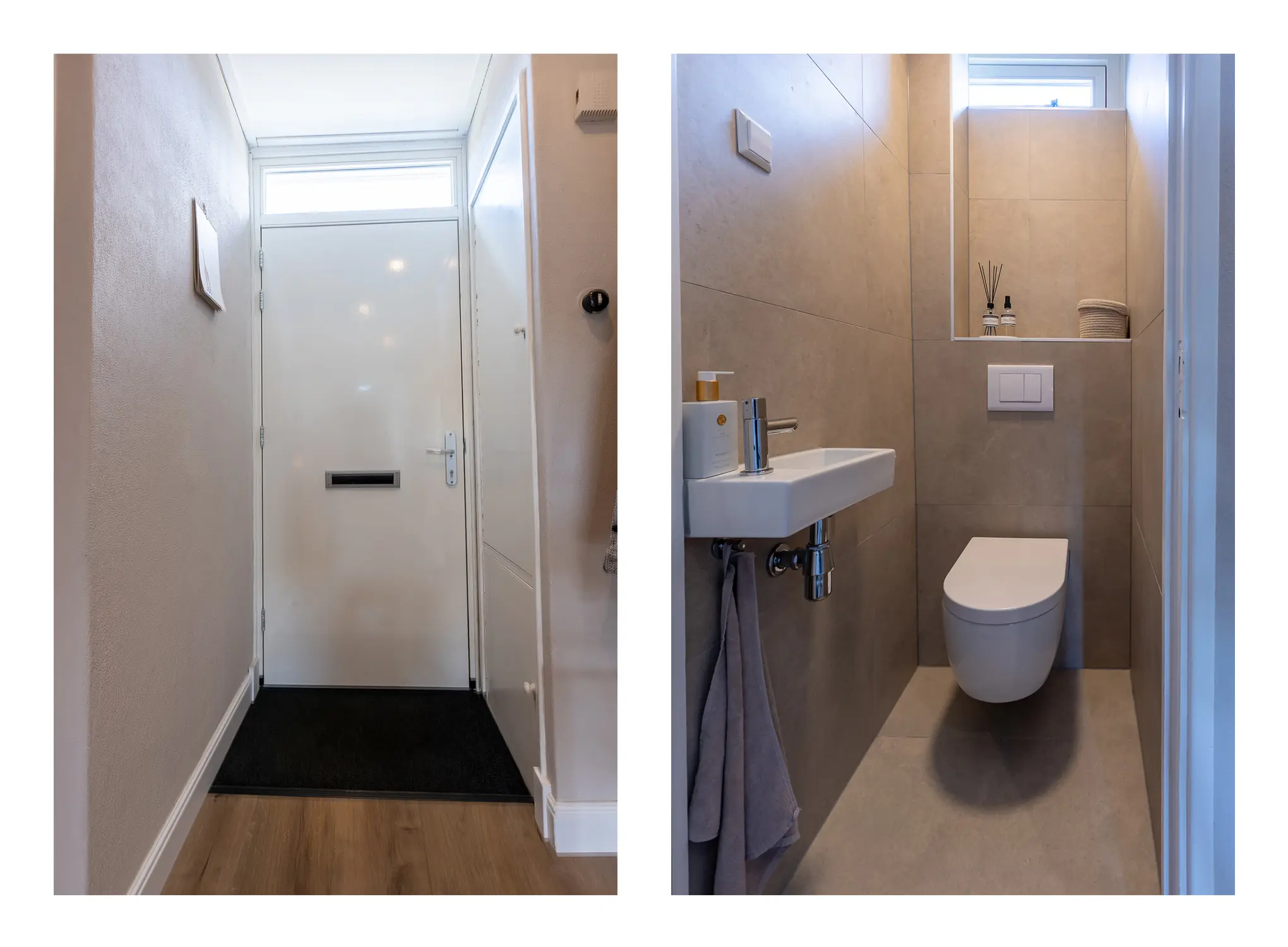 Via de entree betreedt u de hal met meterkast en toiletruimte. Vanuit hier heeft u toegang tot de woonkamer en de keuken. De woonkamer is een lichte en sfeervolle leefruimte en beschikt over een praktische inbouwkast, een eikenhouten vloer en een deur naar de achtertuin.