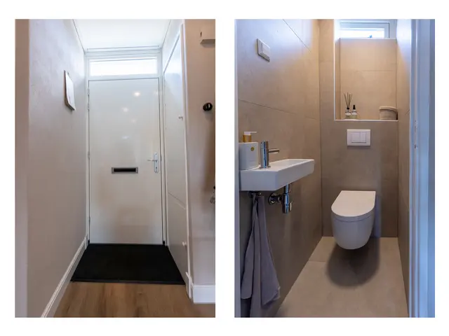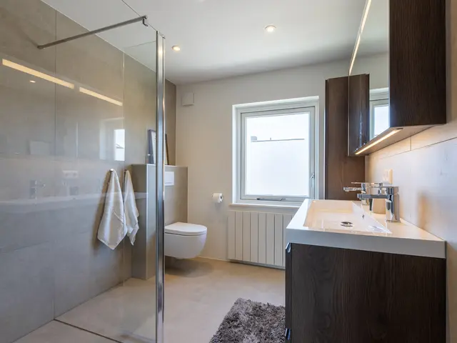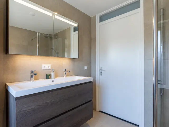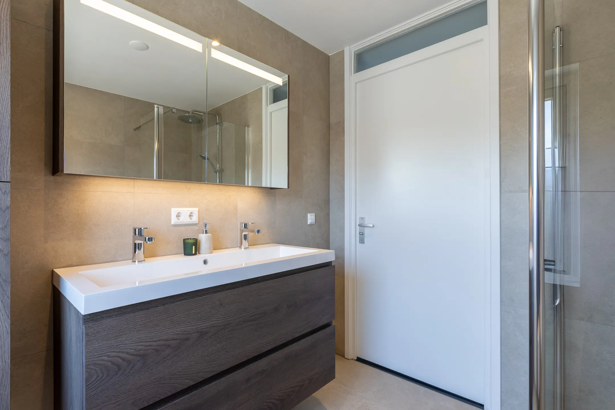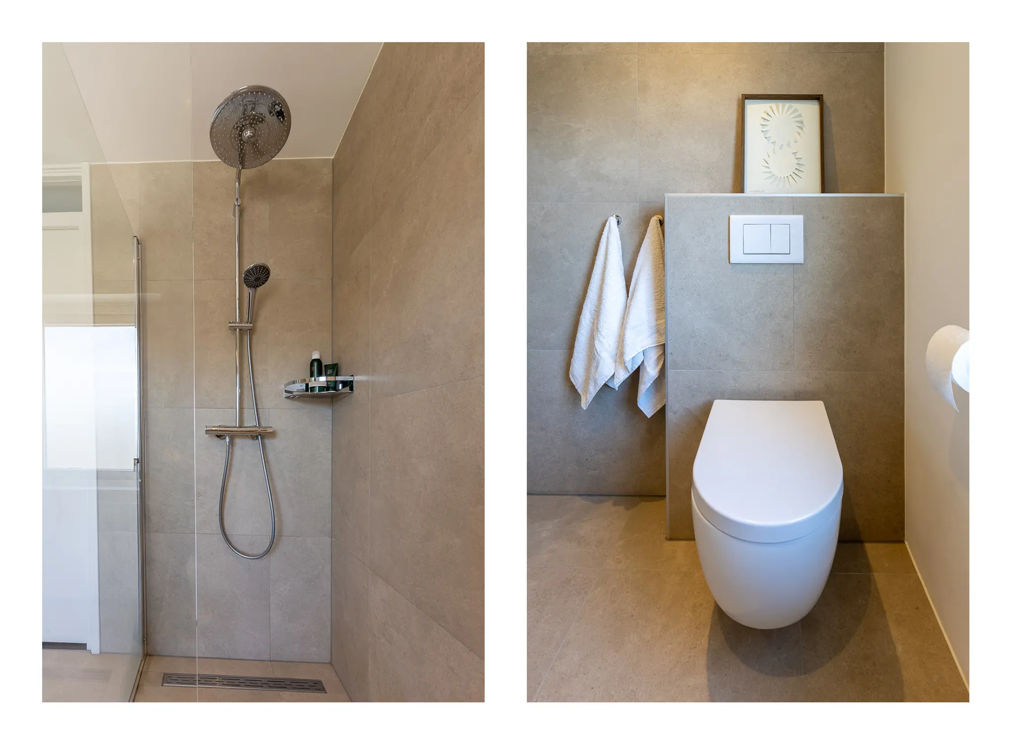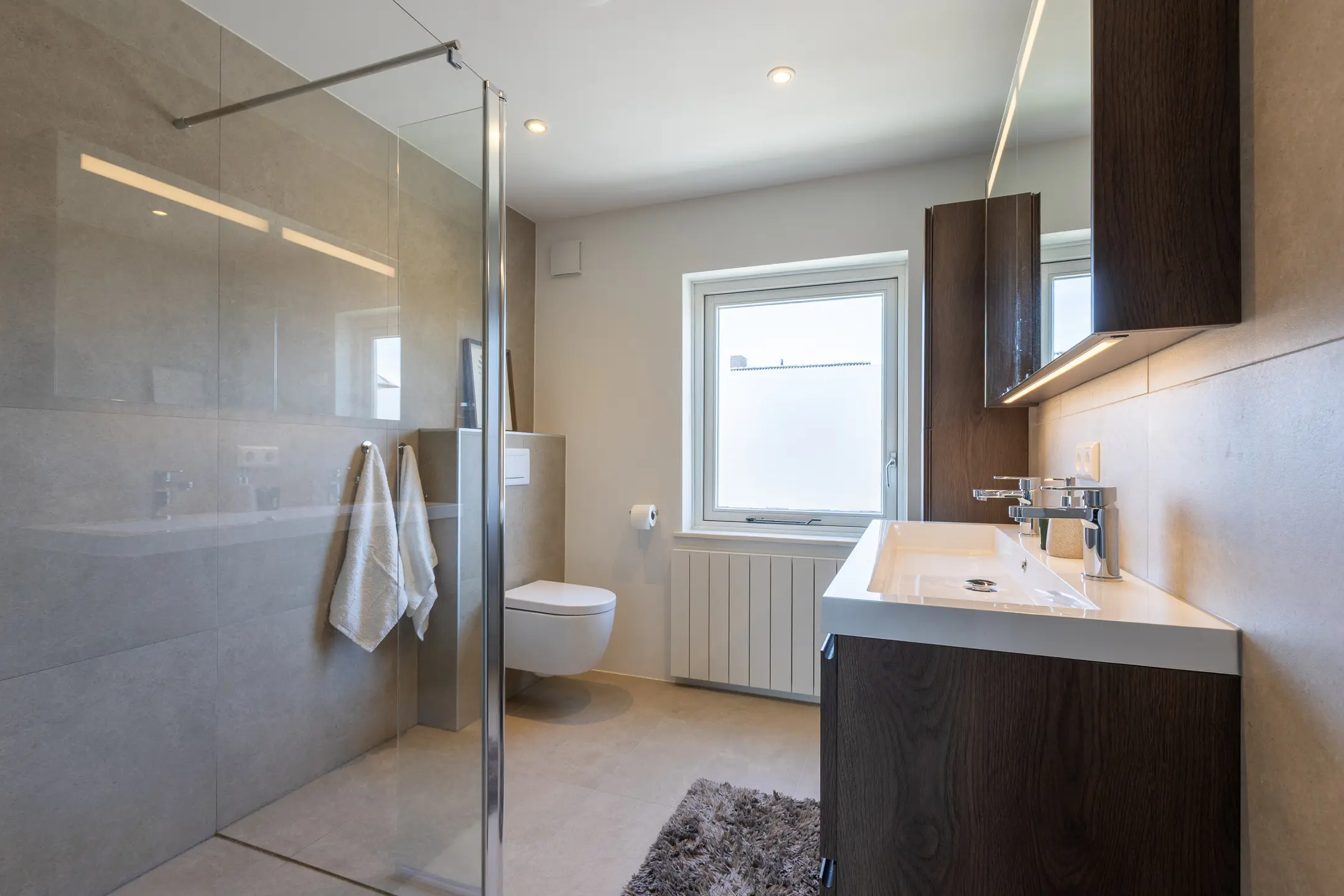 De moderne badkamer (2024) is stijlvol afgewerkt en beschikt over een inloopdouche met glazen wand, toilet en een dubbele wastafel in meubel.