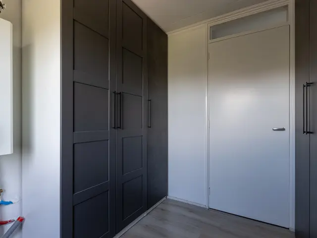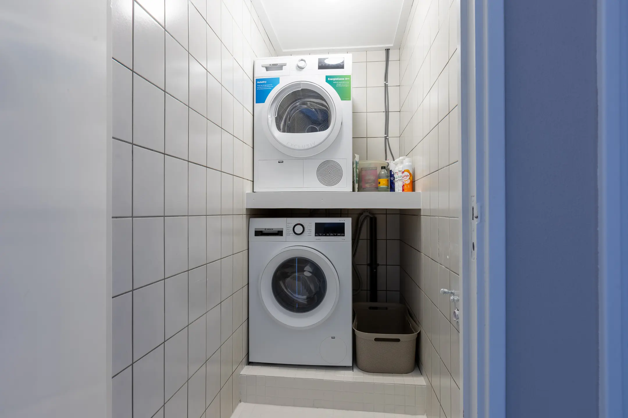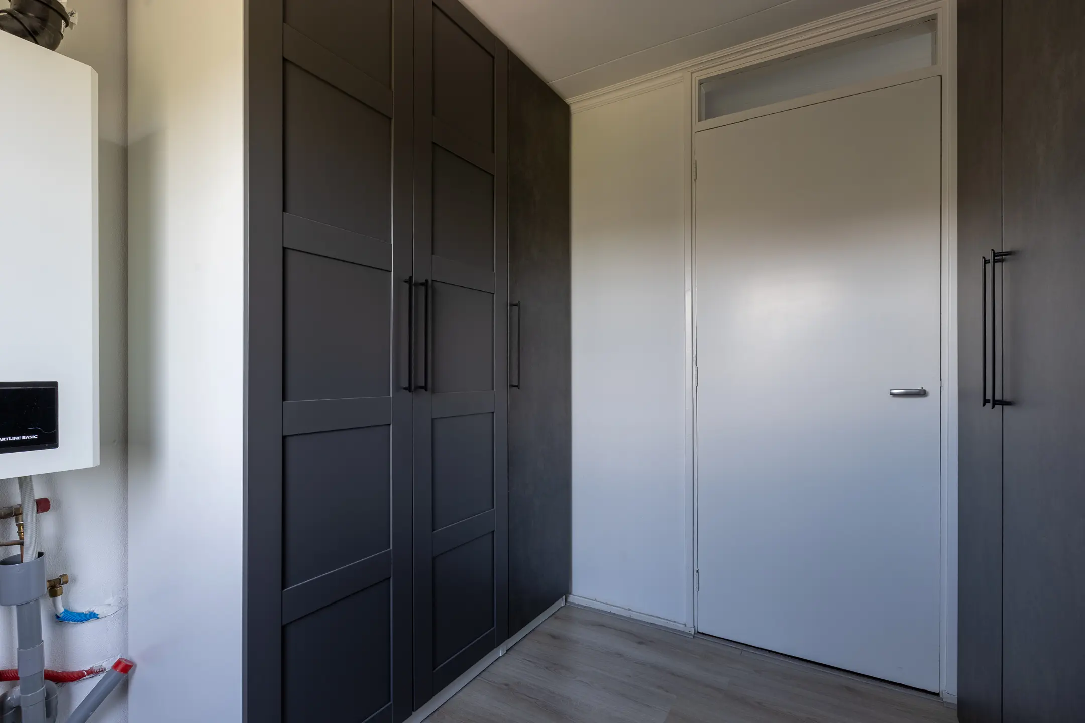 Daarnaast is er een praktische inbouwkast aanwezig met aansluitingen ten behoeve van de wasapparatuur.