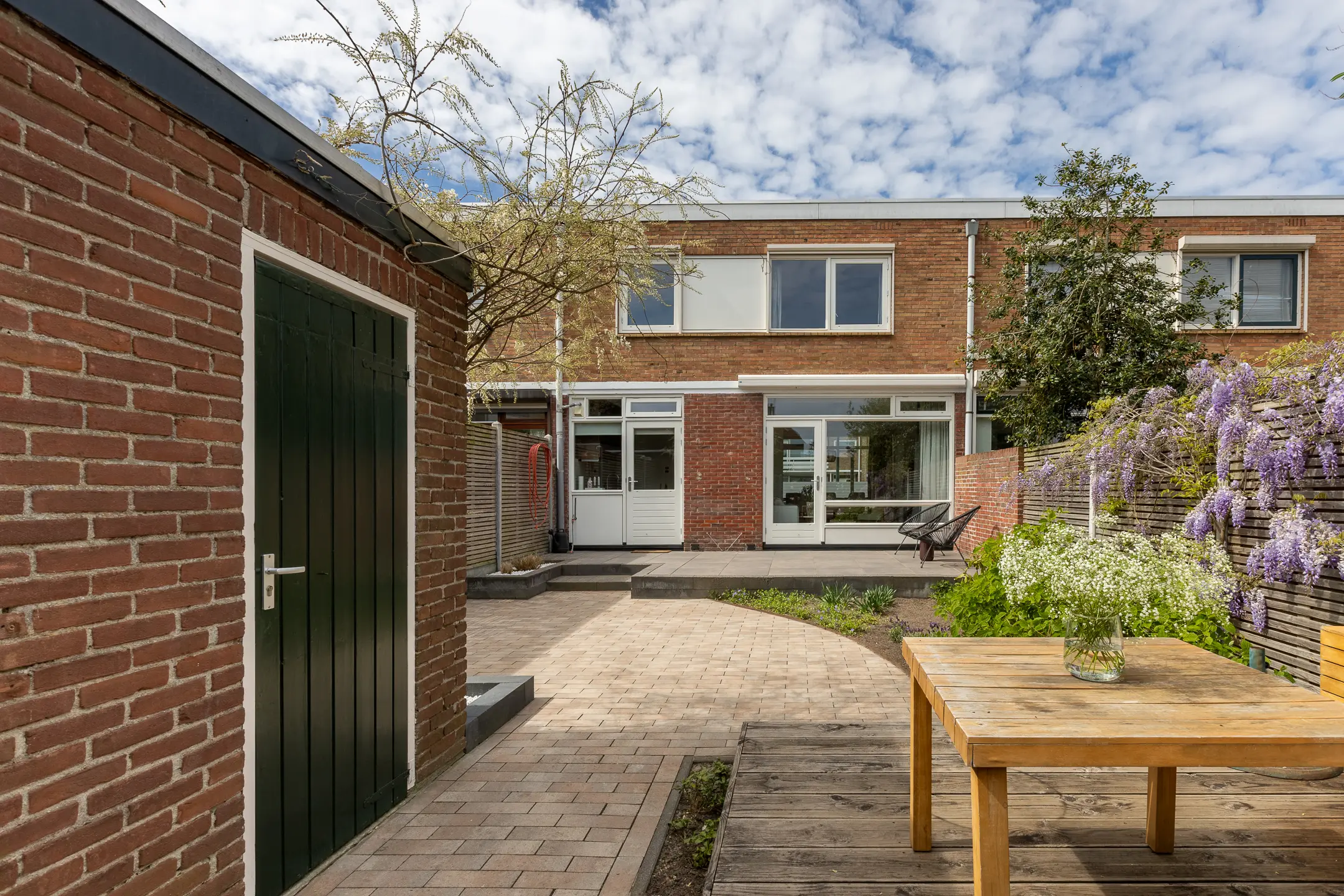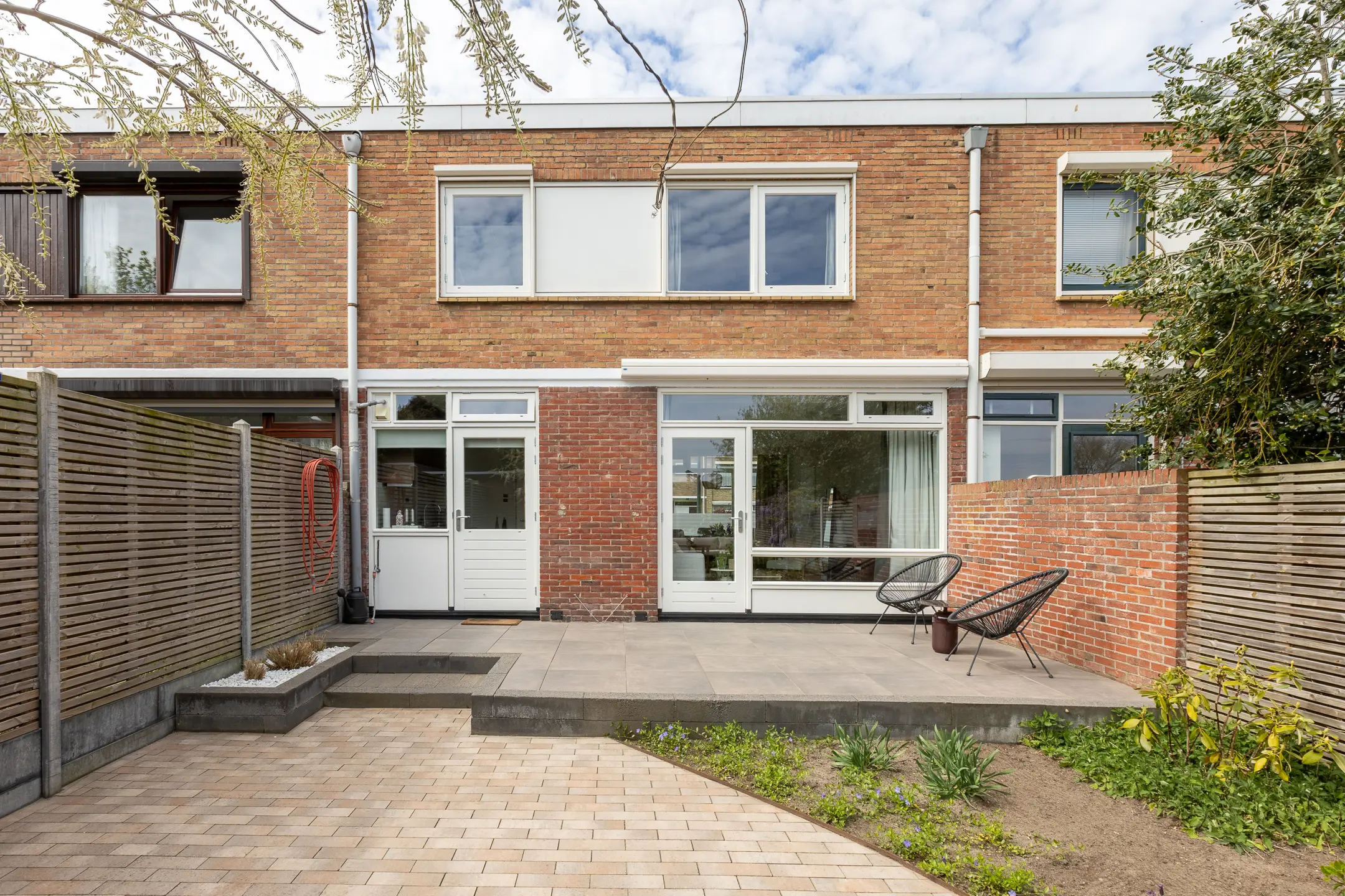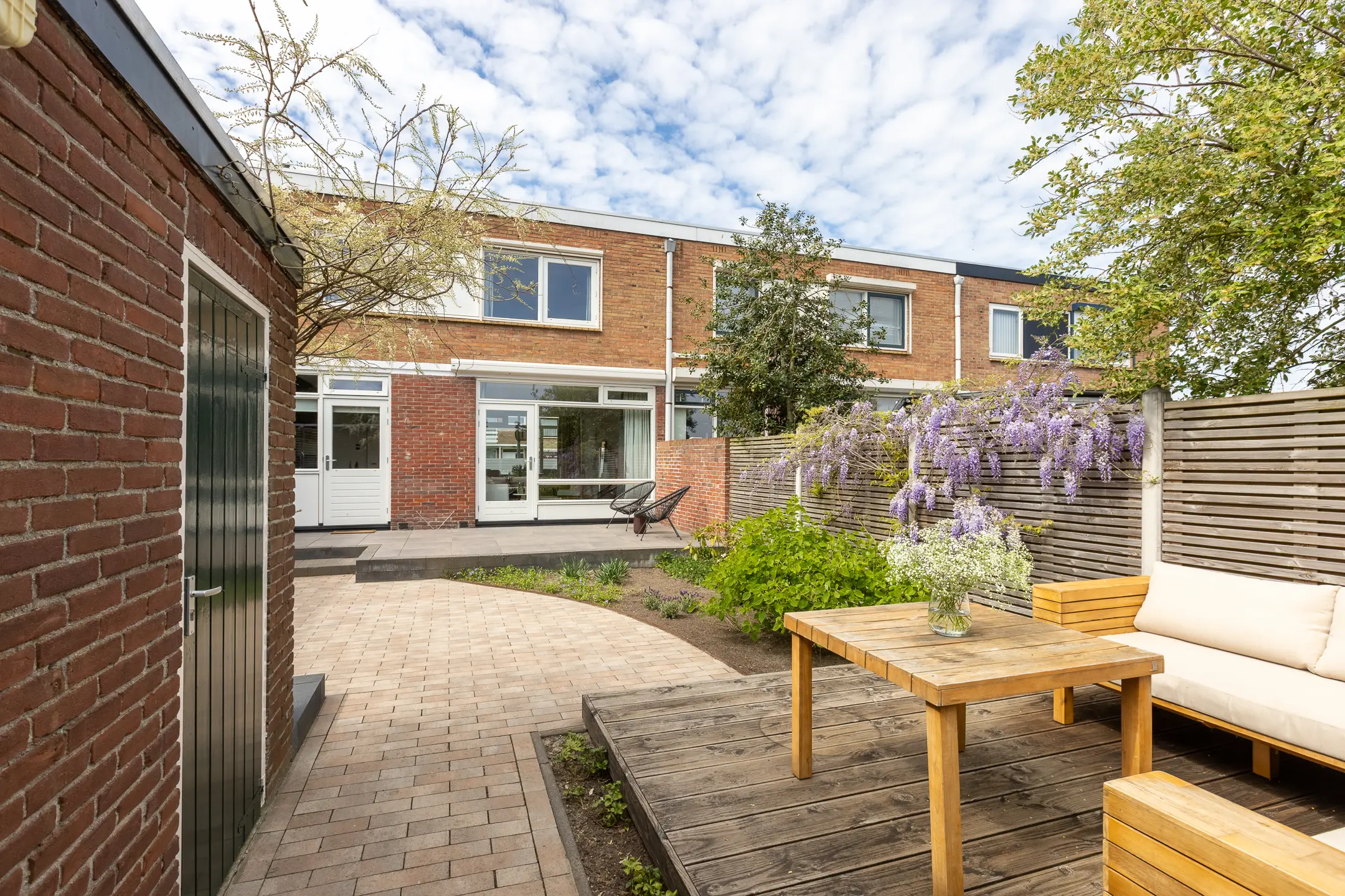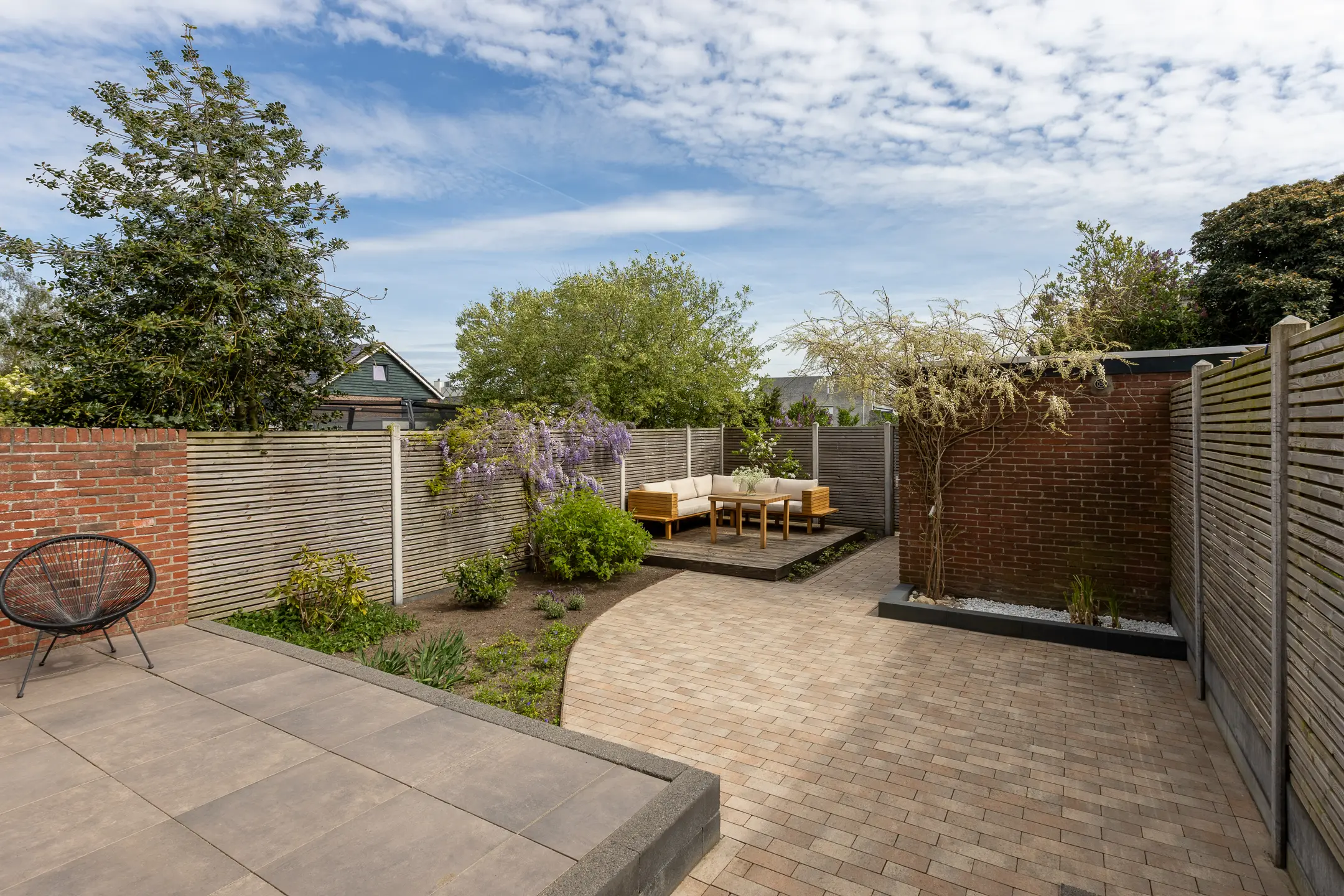 De achtertuin is verzorgd aangelegd met sierbestrating, een stenen berging en meerdere terrassen waar u heerlijk kunt zitten. De tuin beschikt over een achterom via een gezamenlijk afgesloten poort.