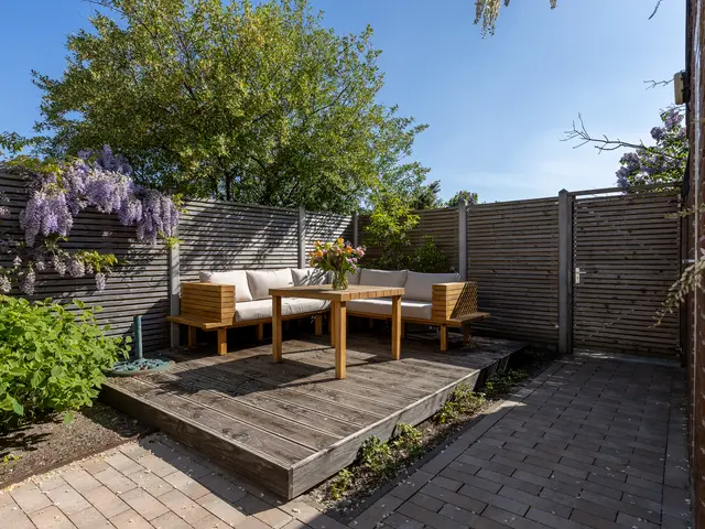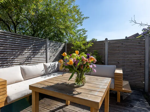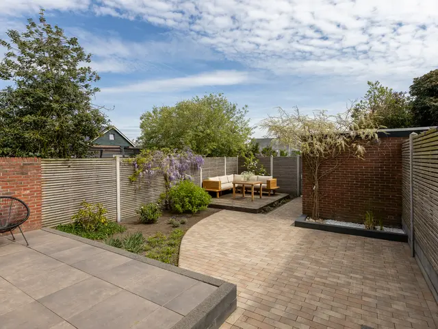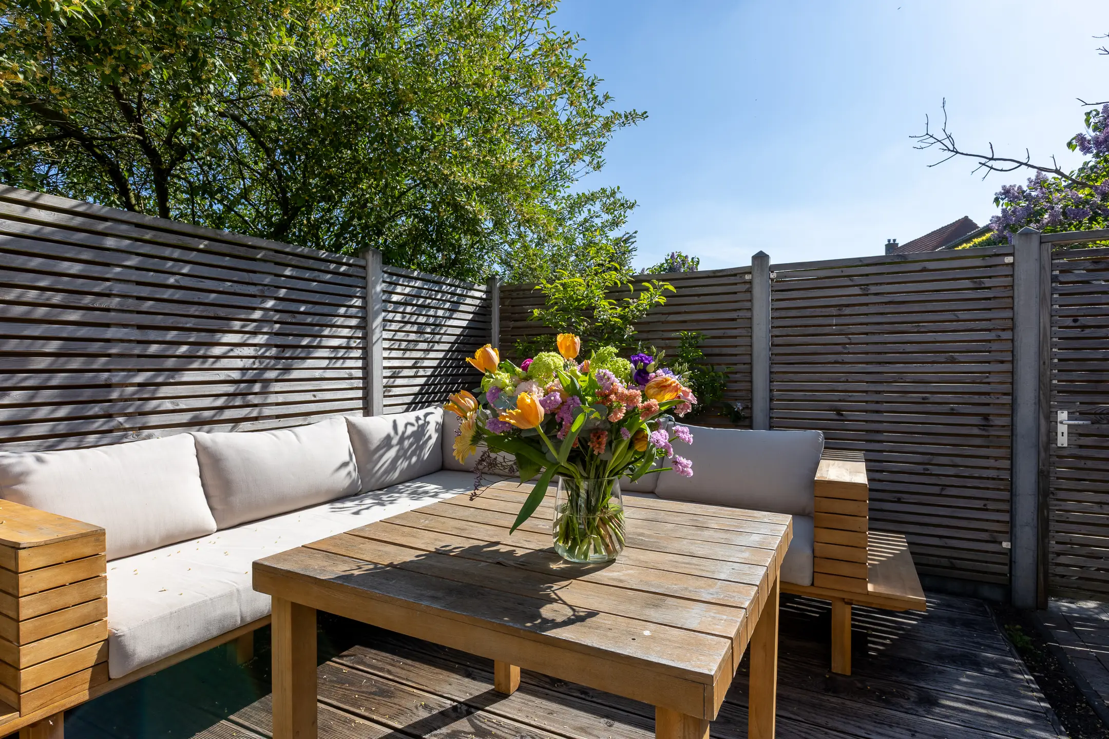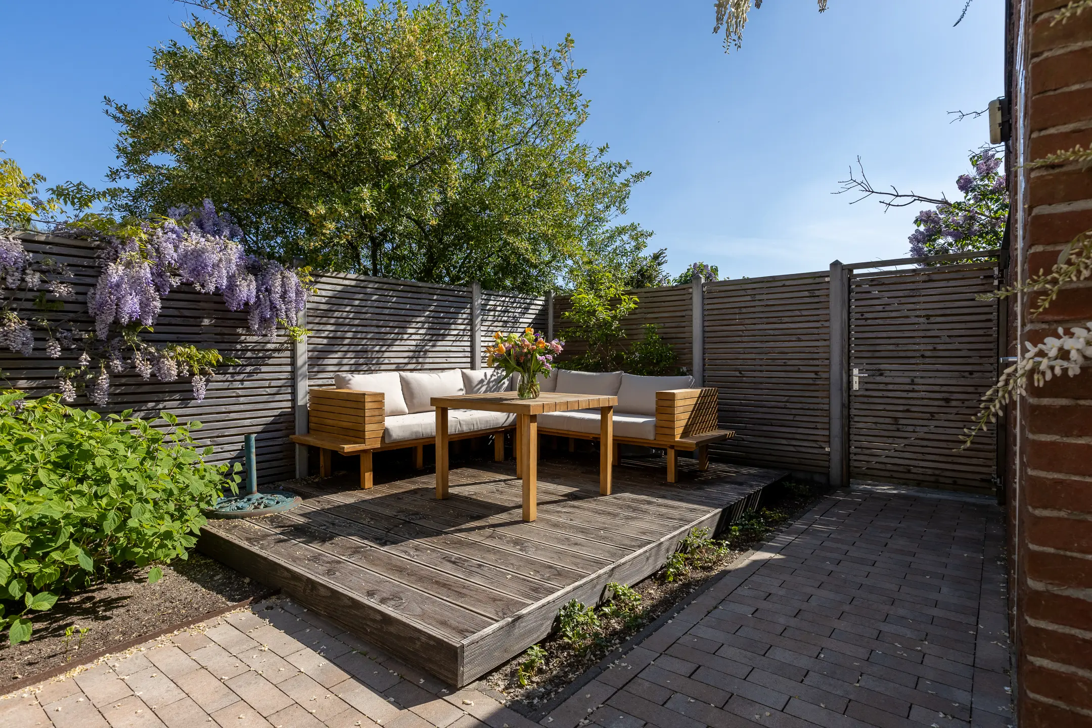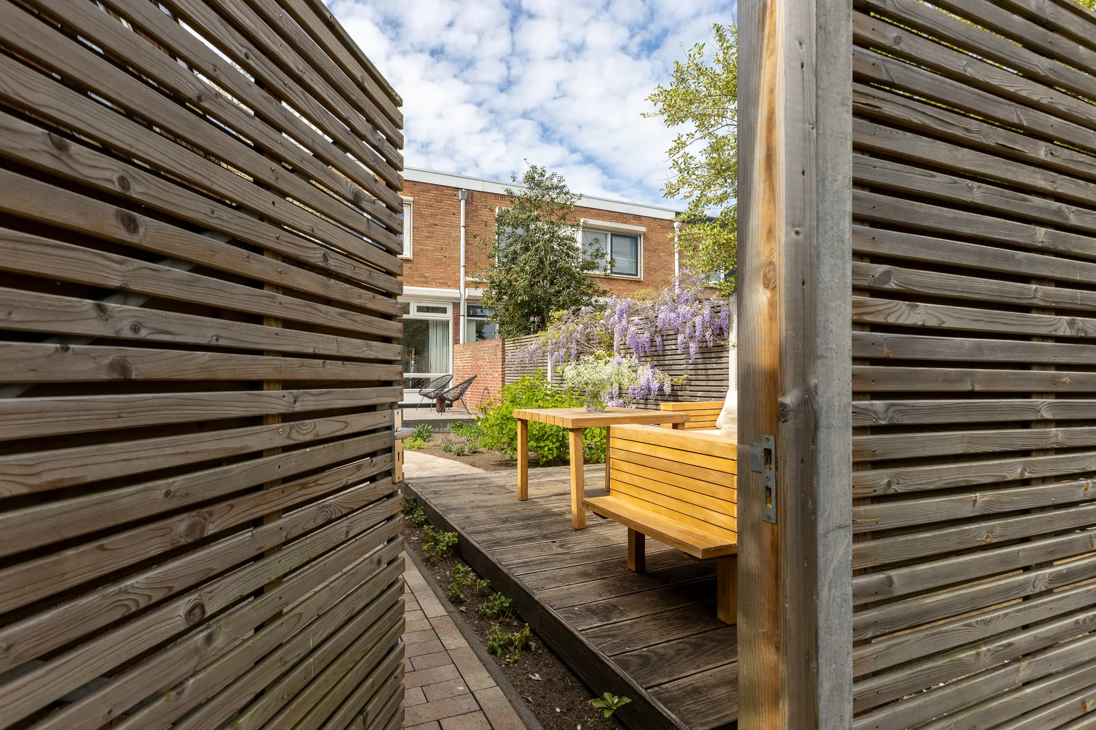 De achtertuin is verzorgd aangelegd met sierbestrating, een stenen berging en meerdere terrassen waar u heerlijk kunt zitten. De tuin beschikt over een achterom via een gezamenlijk afgesloten poort.