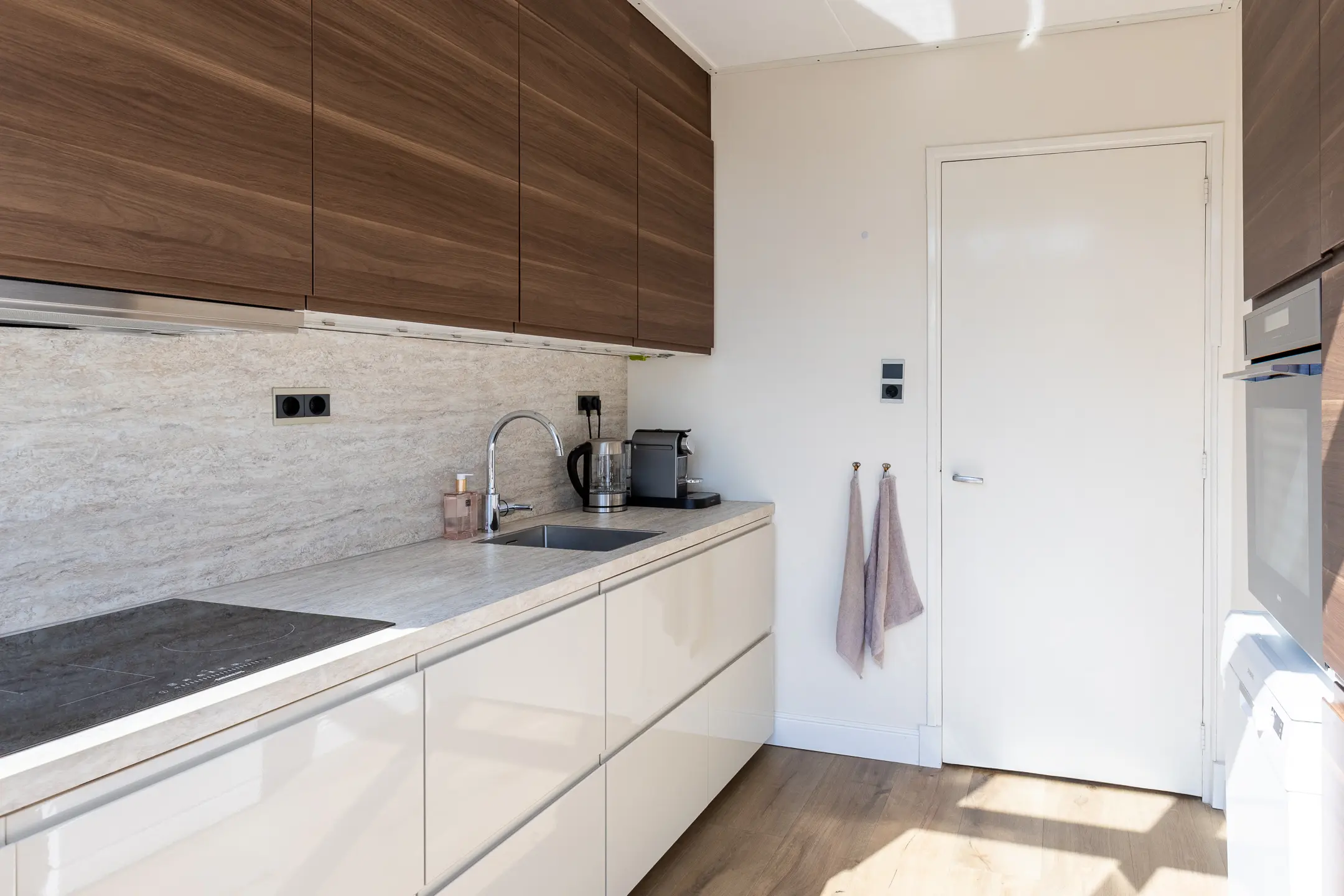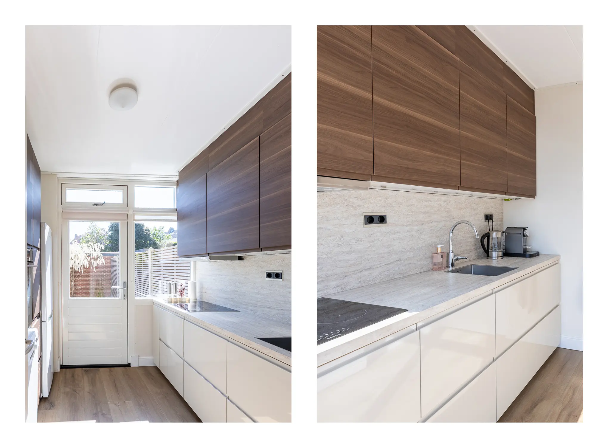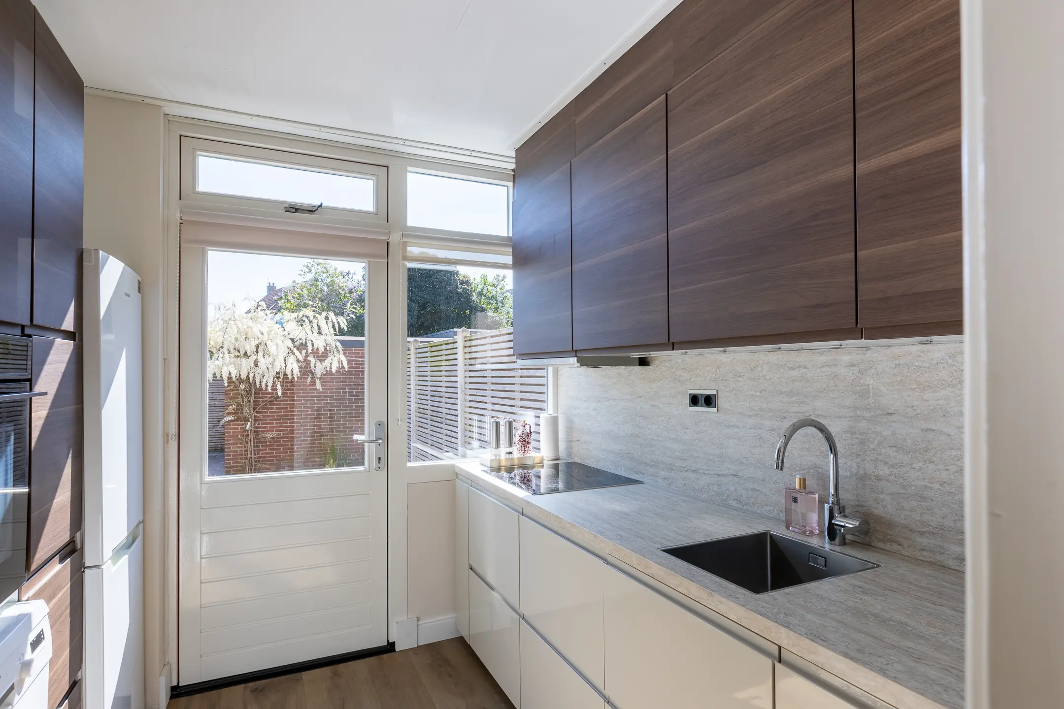 Aan de achterzijde bevindt zich de gesloten keuken (2020) en voorzien van diverse inbouwapparatuur, waaronder een inductiekookplaat, combi magnetron/oven, afzuigkap, vaatwasser, koel-/vriescombinatie en voldoende kastruimte. Vanuit de keuken heeft u eveneens toegang tot de achtertuin.