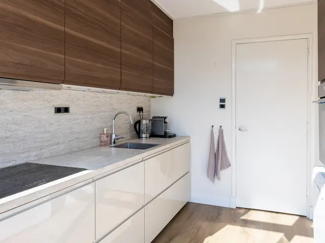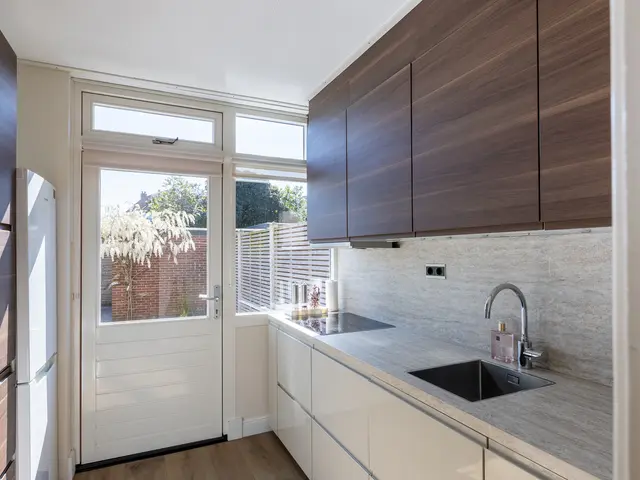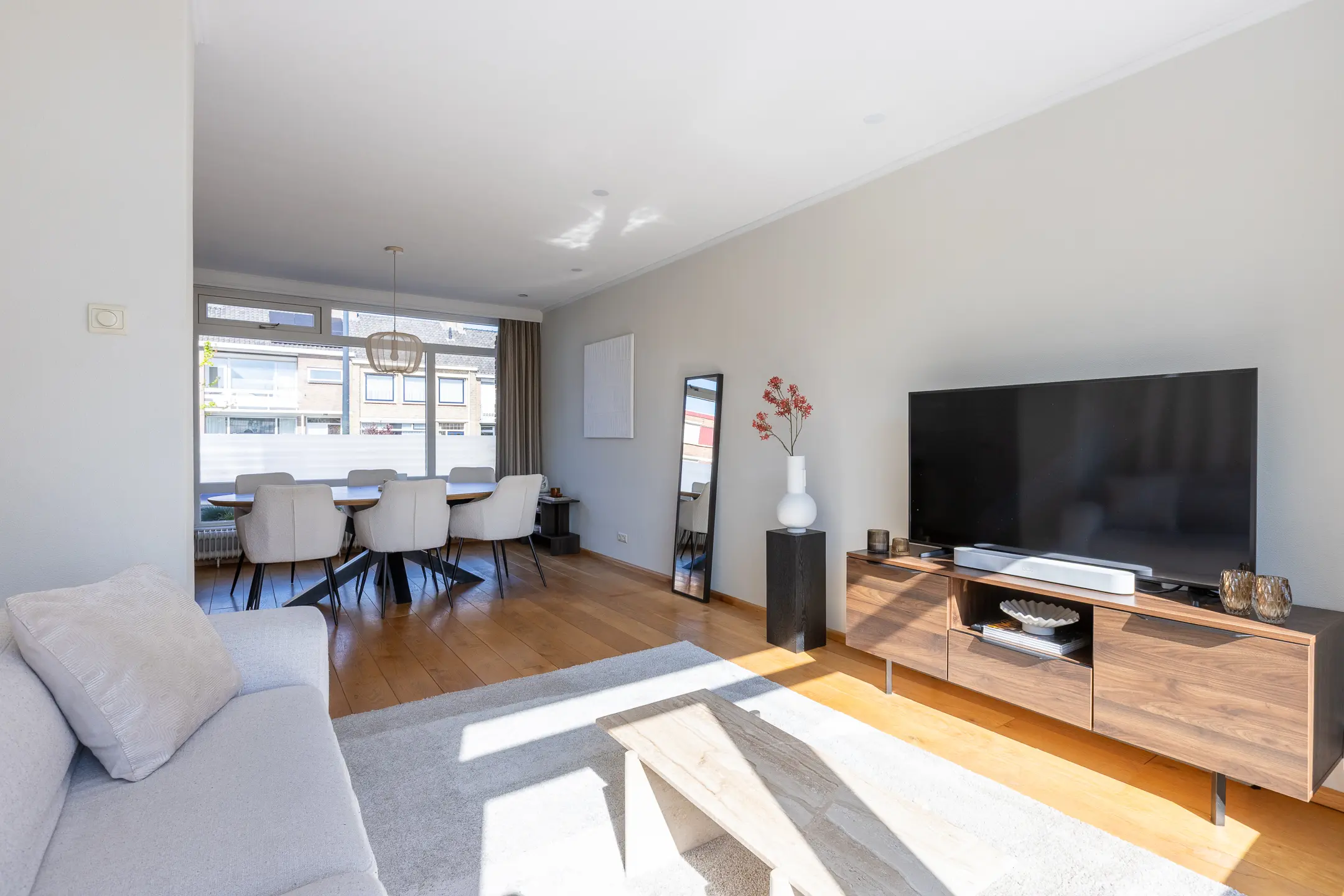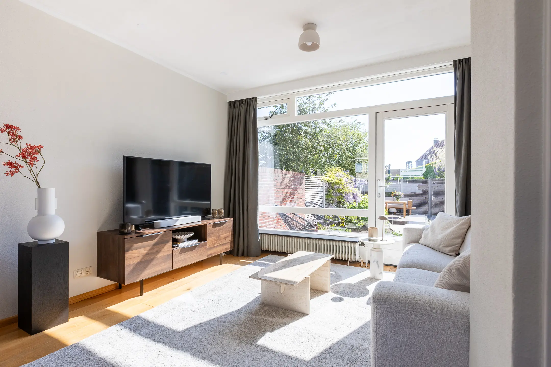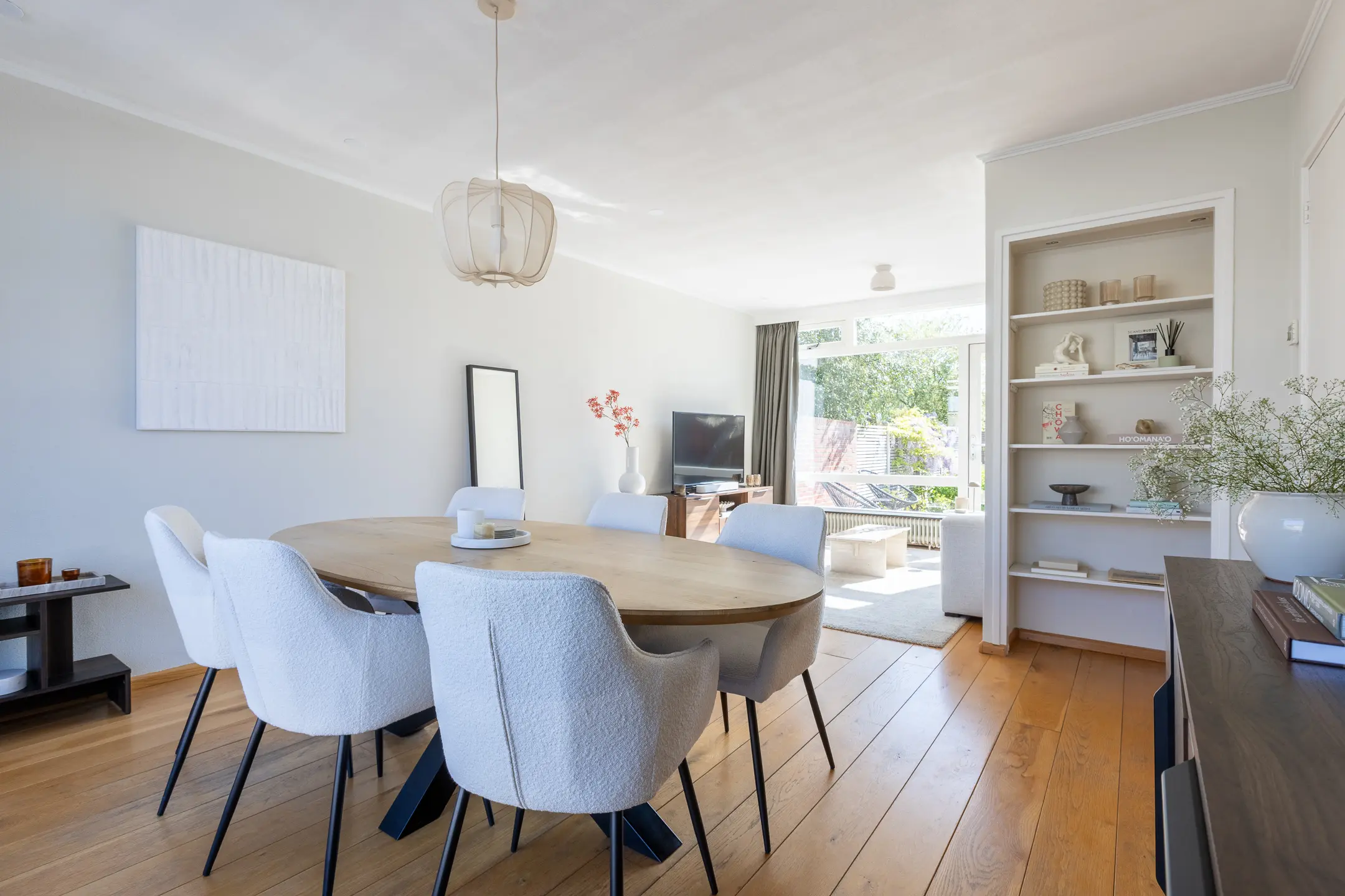 Aan de achterzijde bevindt zich de gesloten keuken (2020) en voorzien van diverse inbouwapparatuur, waaronder een inductiekookplaat, combi magnetron/oven, afzuigkap, vaatwasser, koel-/vriescombinatie en voldoende kastruimte. Vanuit de keuken heeft u eveneens toegang tot de achtertuin.