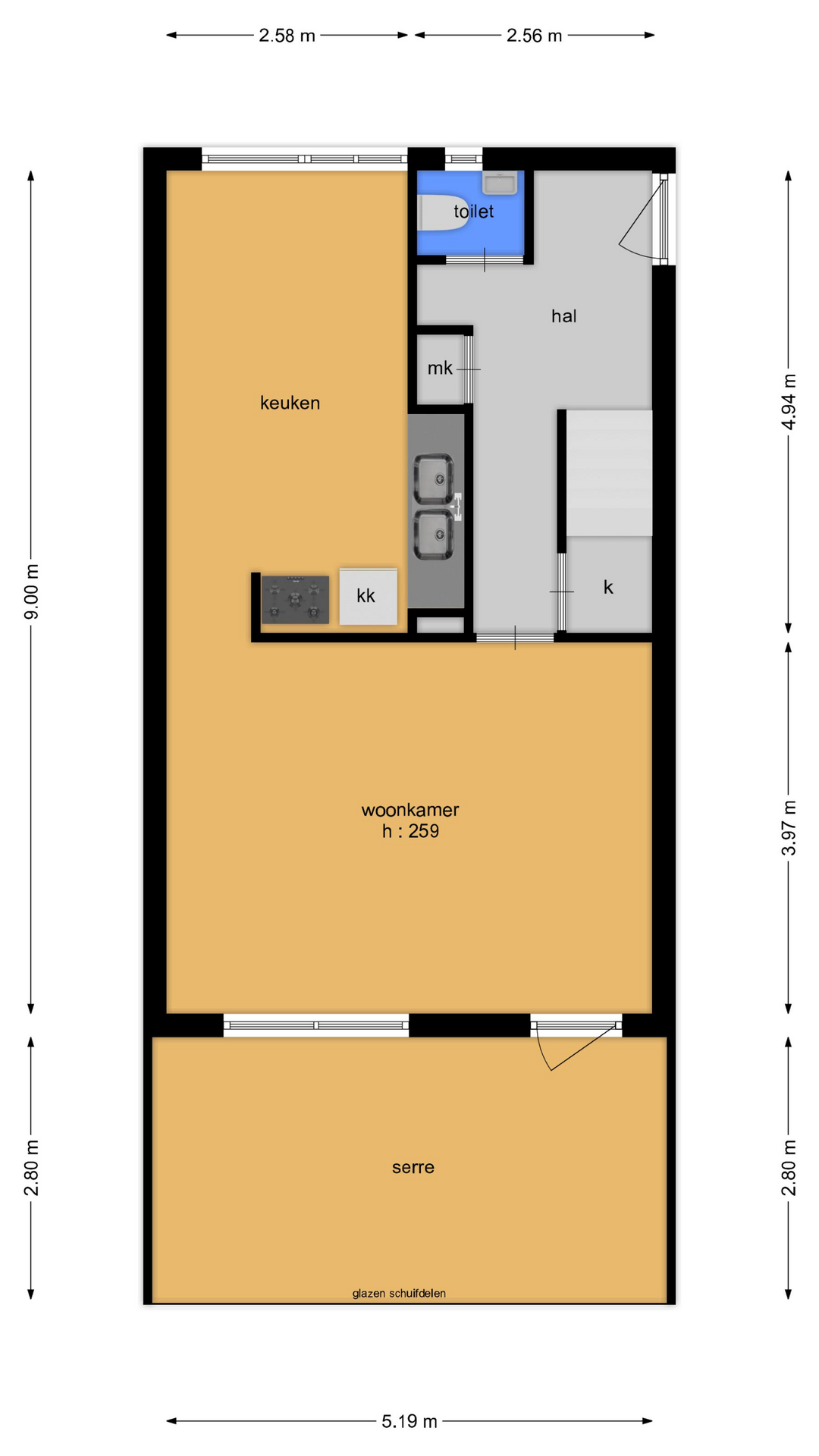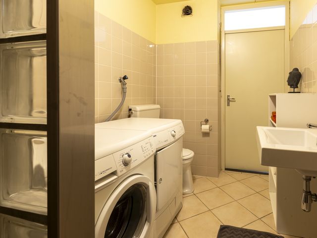 Via een trap bereiken we entree/hal met toegang tot de meterkast, toiletruimte met fonteintje en de trap naar de tweede verdieping. De woonkamer is licht en sfeervol en grenst direct aan de achtertuin die te bereiken is door tuindeur. Verder is deze verdieping volledig voorzien van een laminaatvloer. Aan de voorzijde bevindt zich de halfopen keuken voorzien van inbouwapparatuur. Extra pluspunt is de serre met glazen pui, met de serre als verlengstuk van de woonkamer geniet je van extra ruimte en volop daglicht.