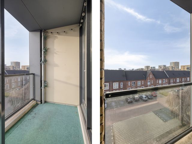 Het overdekte balkon is een fijne toevoeging aan het appartement. Hier zit je beschut en geniet je van een vrij uitzicht over de omgeving. Dankzij de overkapping kun je hier al vroeg in het voorjaar en tot laat in het najaar comfortabel buiten zitten.