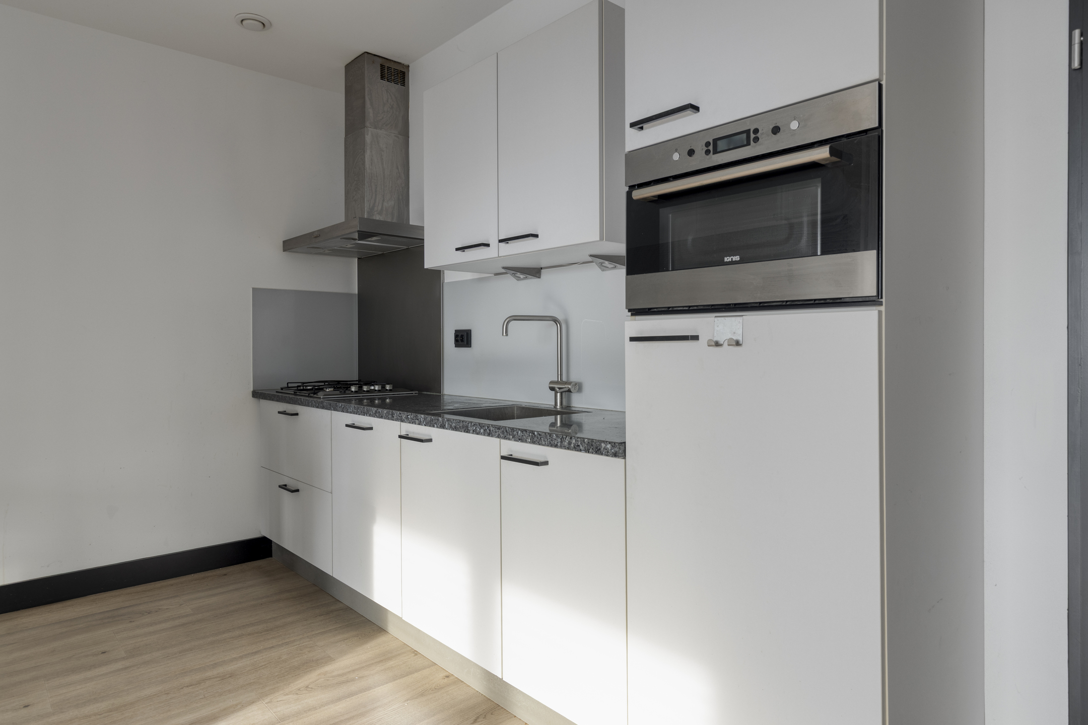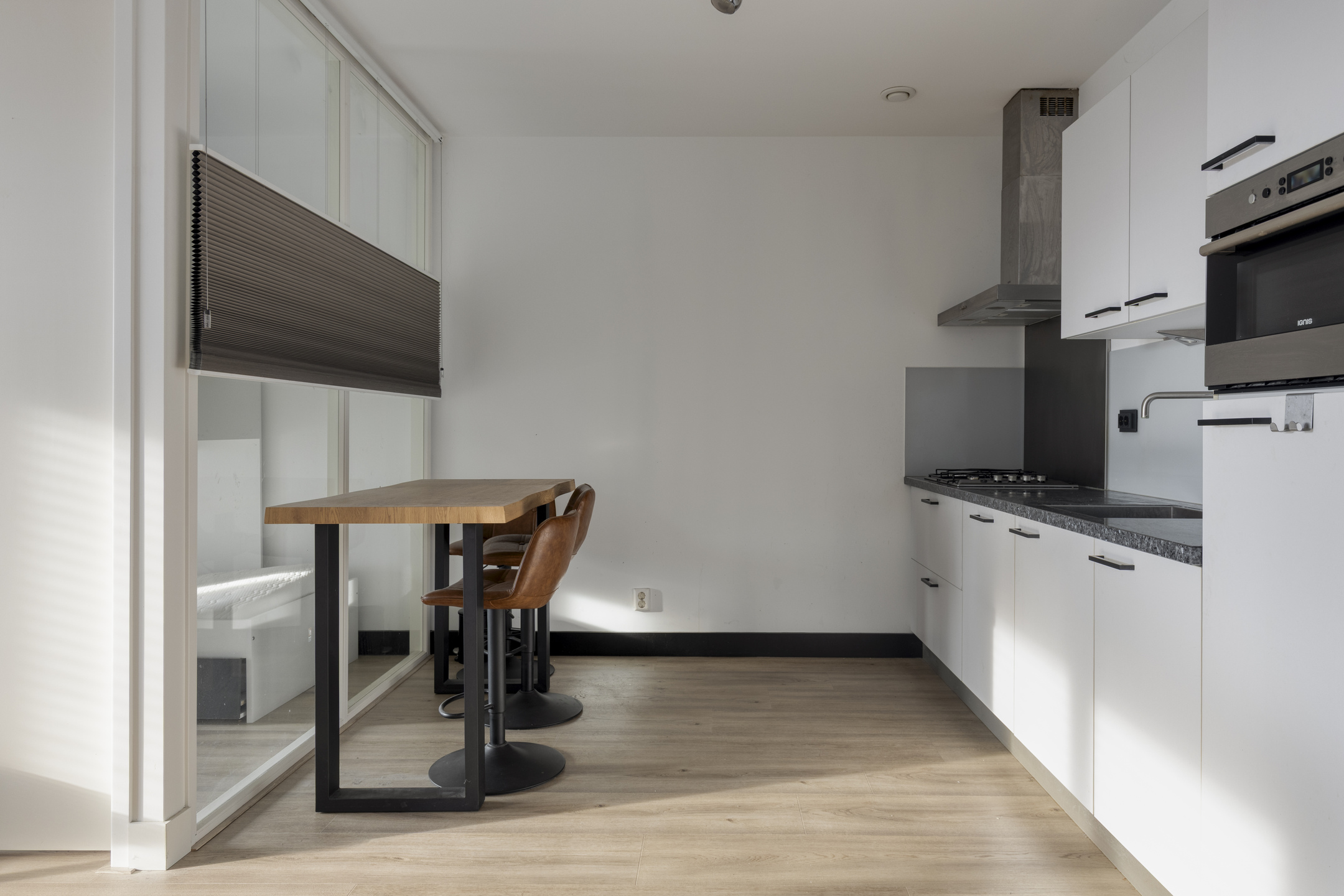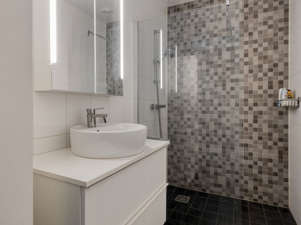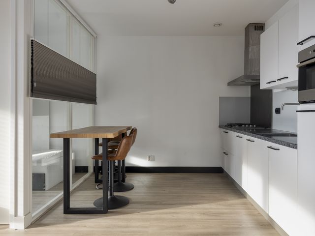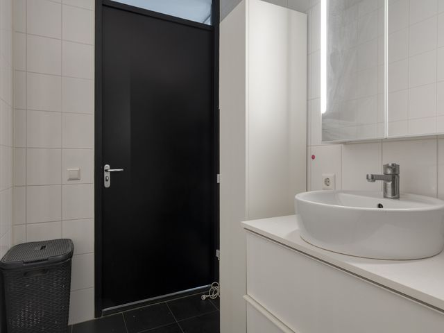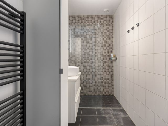 De open keuken sluit naadloos aan op de leefruimte en is uitgevoerd in een strakke lichte opstelling met een contrasterend werkblad. Je beschikt over een gaskookplaat, afzuigkap, combi-oven, koelkast, vaatwasser en voldoende kastruimte. Functioneel en modern, precies wat je dagelijks nodig hebt.