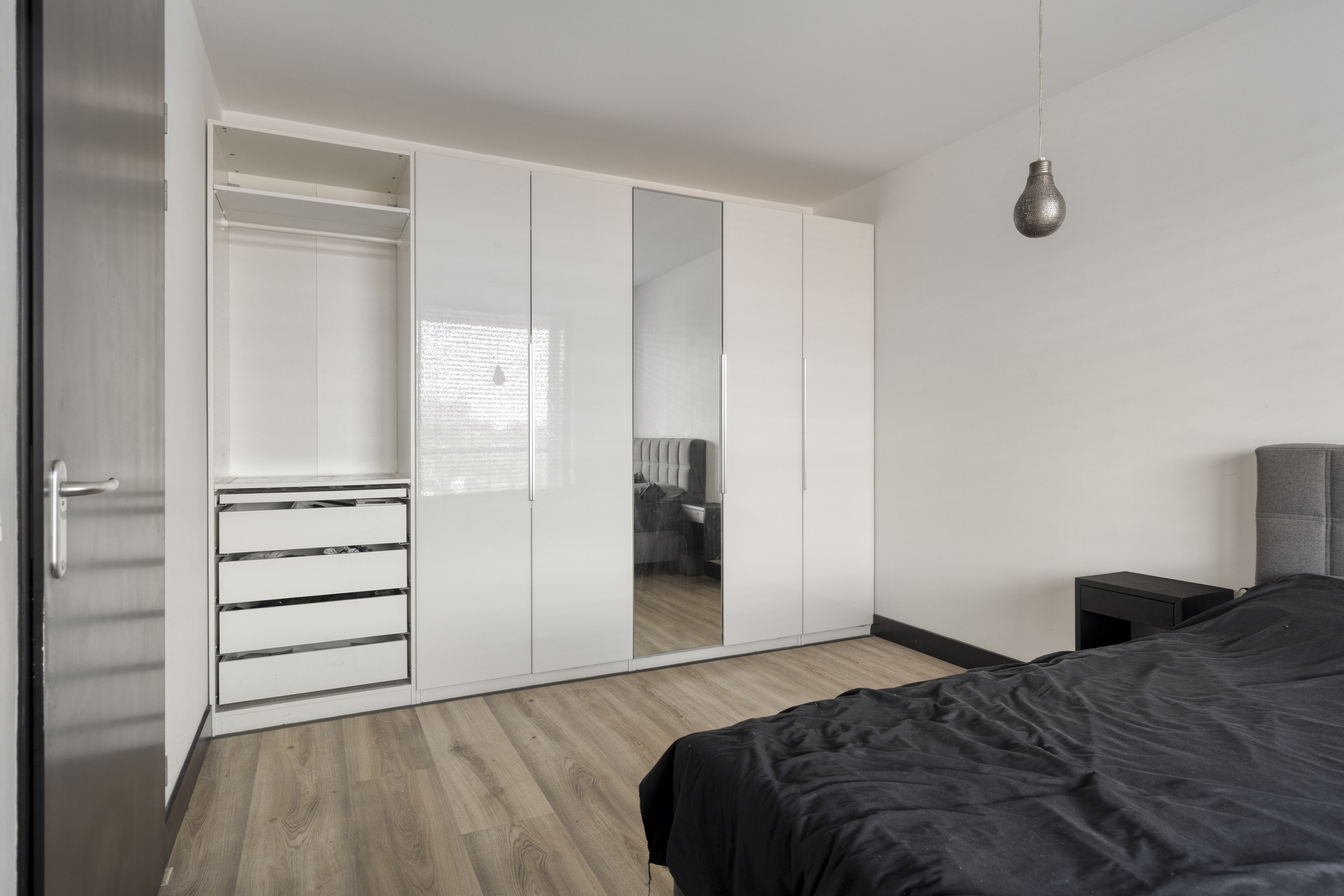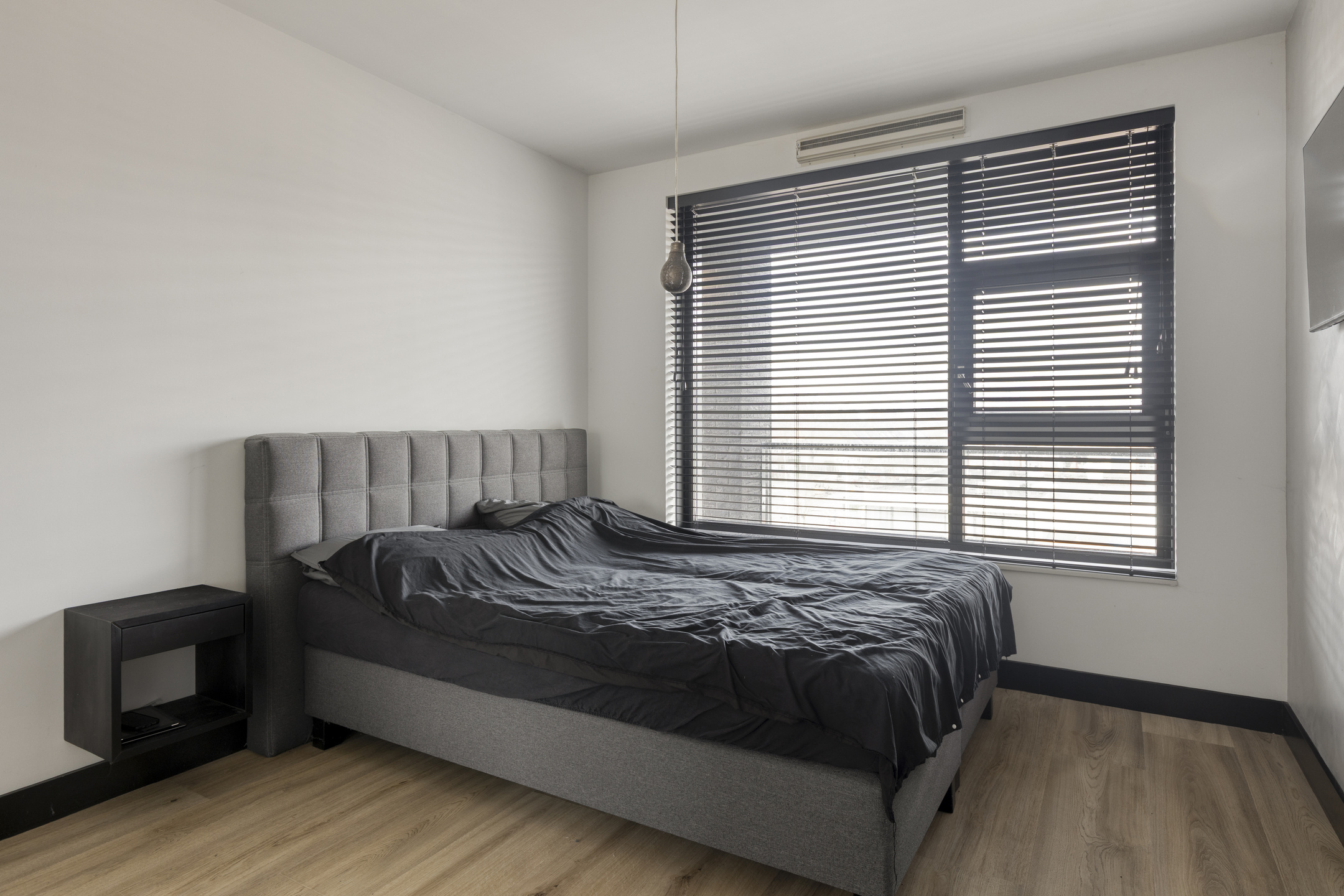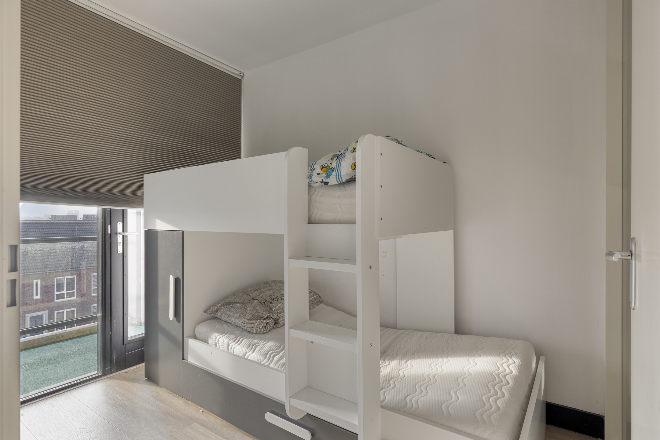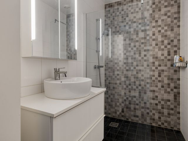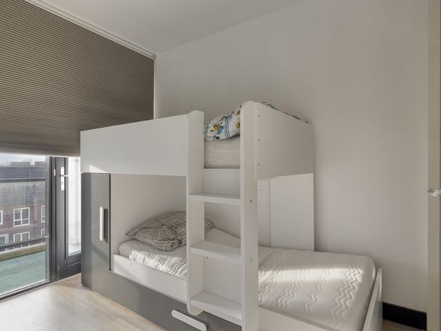 Het appartement beschikt over twee slaapkamers, elk met een eigen karakter. De grootste slaapkamer bevindt zich aan de voorzijde en biedt alle ruimte voor een tweepersoonsbed en een royale kastenwand. De tweede slaapkamer ligt juist aan de balkonzijde en is ideaal als logeer- of werkkamer. De badkamer is modern uitgevoerd en voorzien van een inloopdouche, wastafelmeubel met opbouwkom, hangkast en een designradiator.