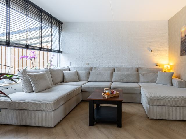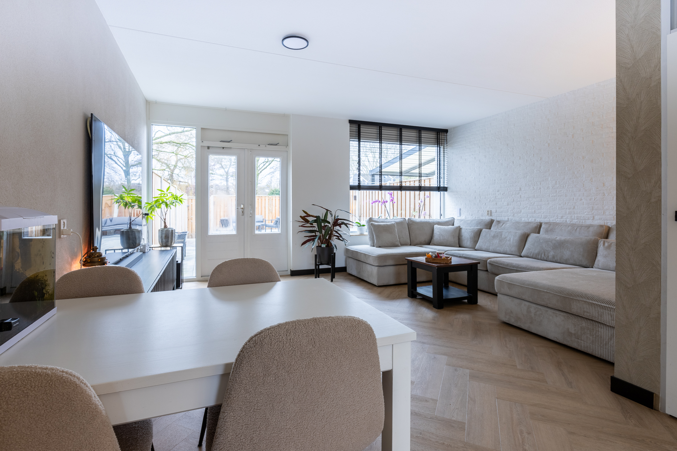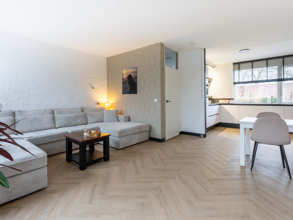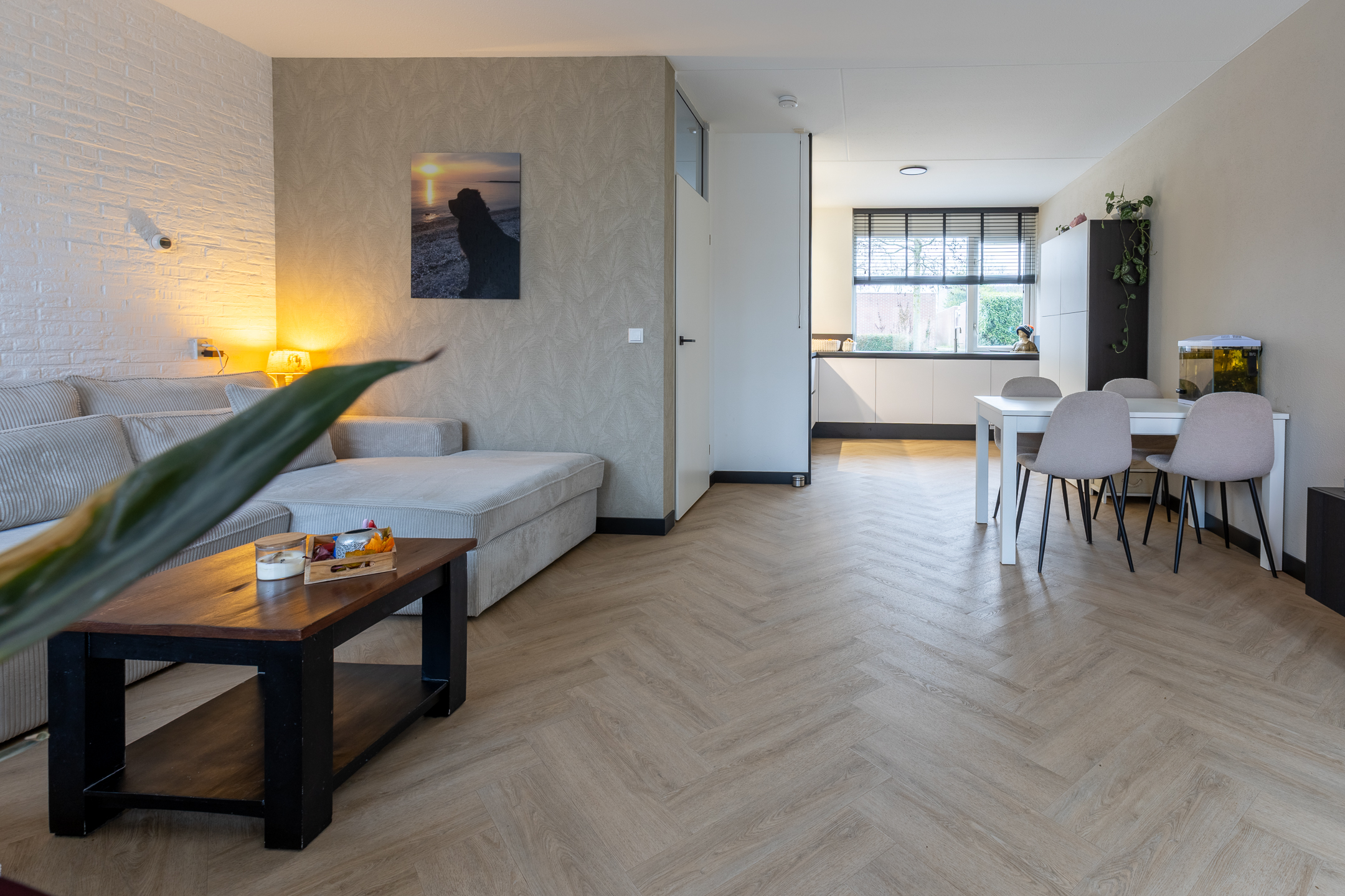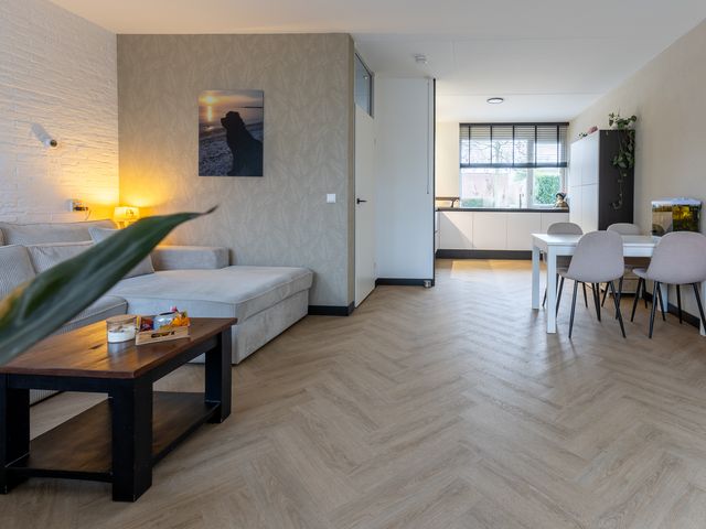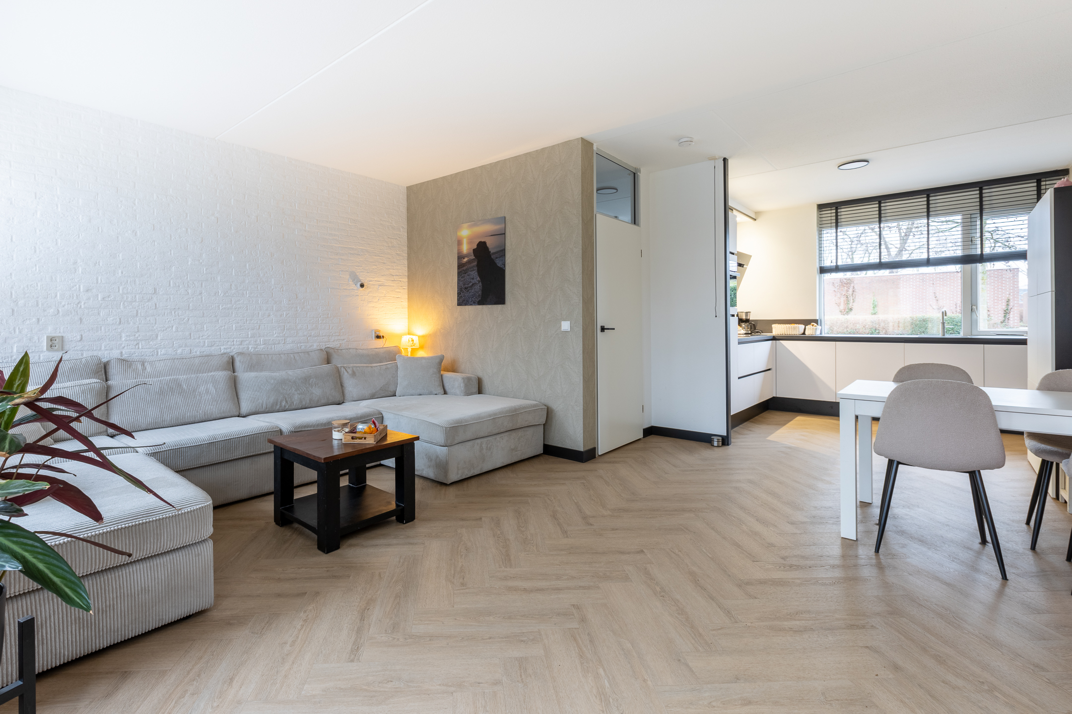 De lichte woonkamer is afgewerkt met een pvc vloer en beschikt over vloerverwarming en openslaande deuren naar de achtertuin, wat zorgt voor veel daglicht.