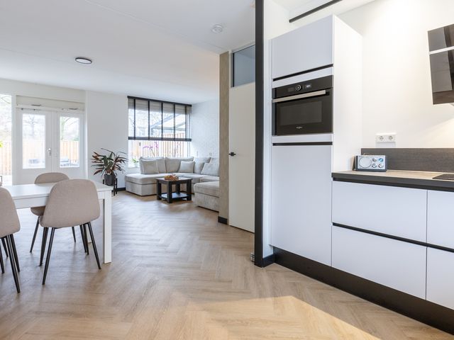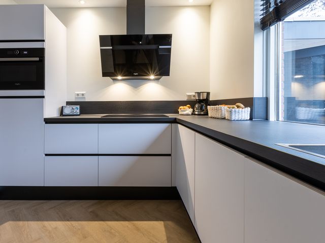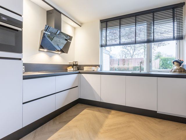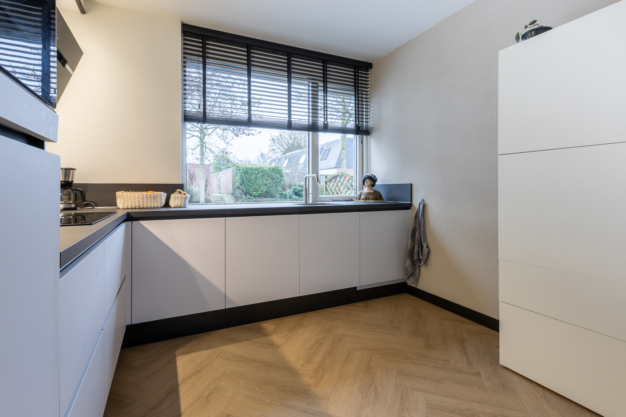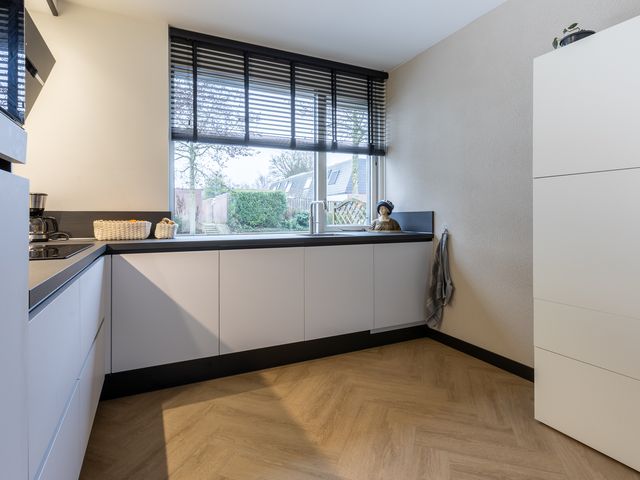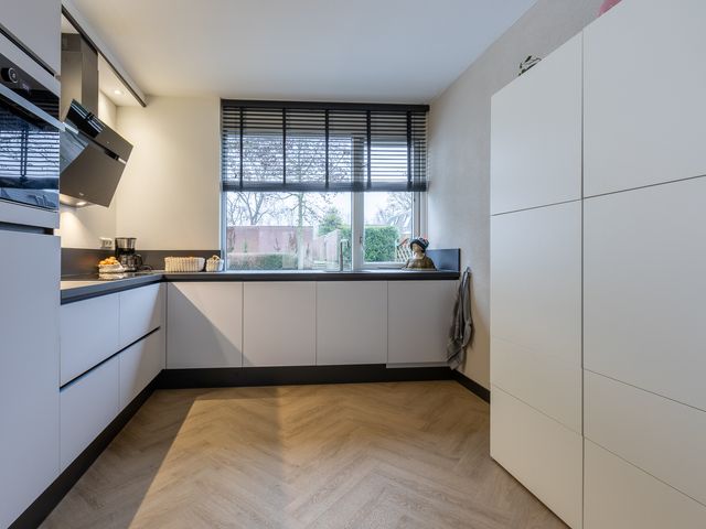 De moderne open keuken (2024) is gelegen aan de voorzijde en voorzien van diverse inbouwapparatuur, waaronder een inductiekookplaat, vaatwasmachine, koelkast, vriezer, combi magnetron/oven, afzuigkap en een cooker. Daarnaast is er een losse kastenwand aanwezig voor extra bergruimte.