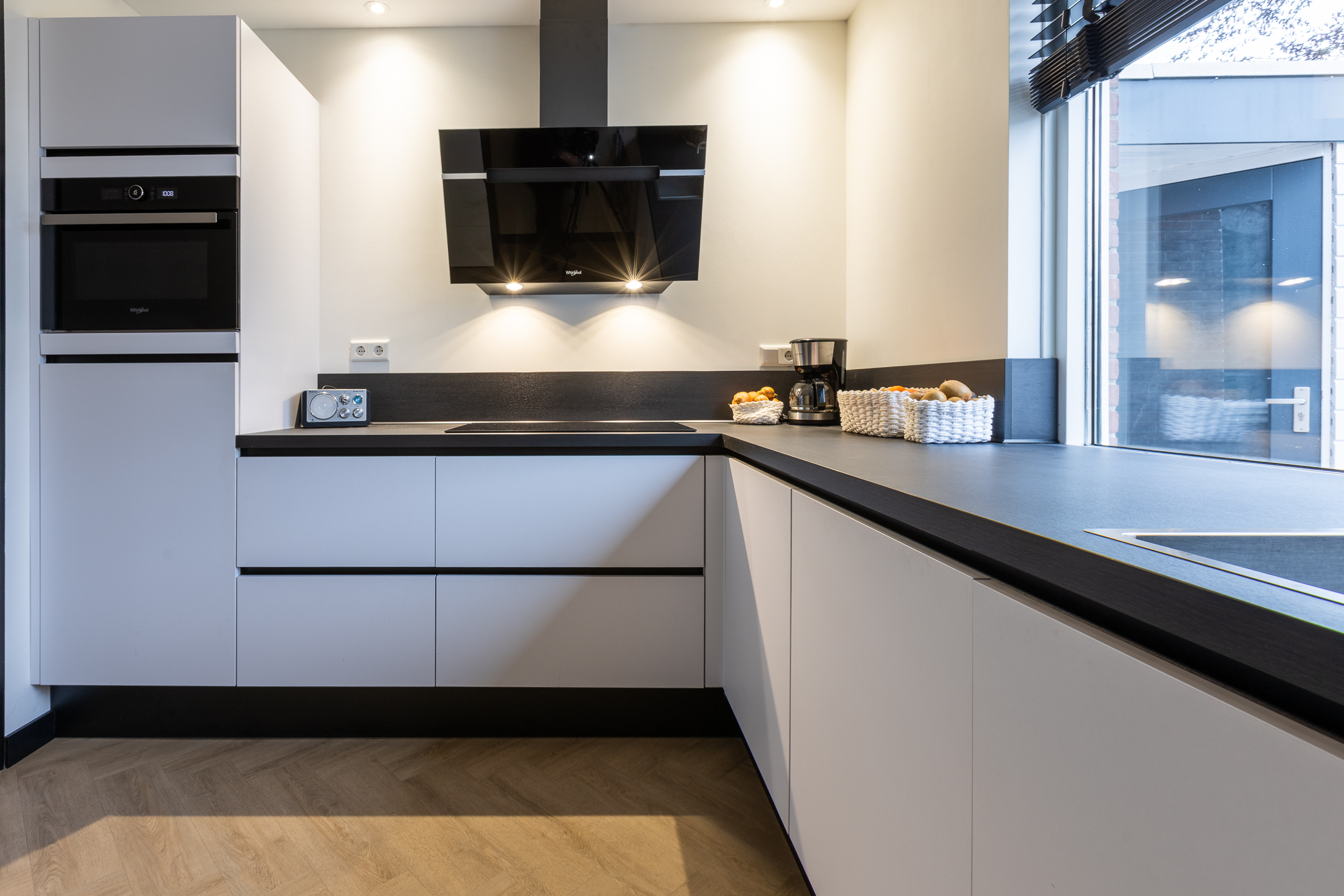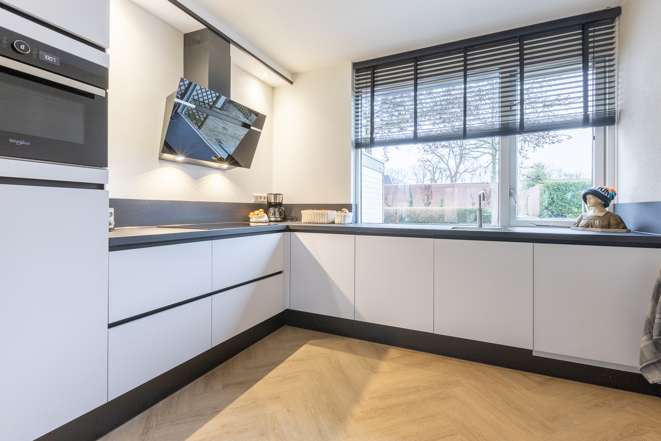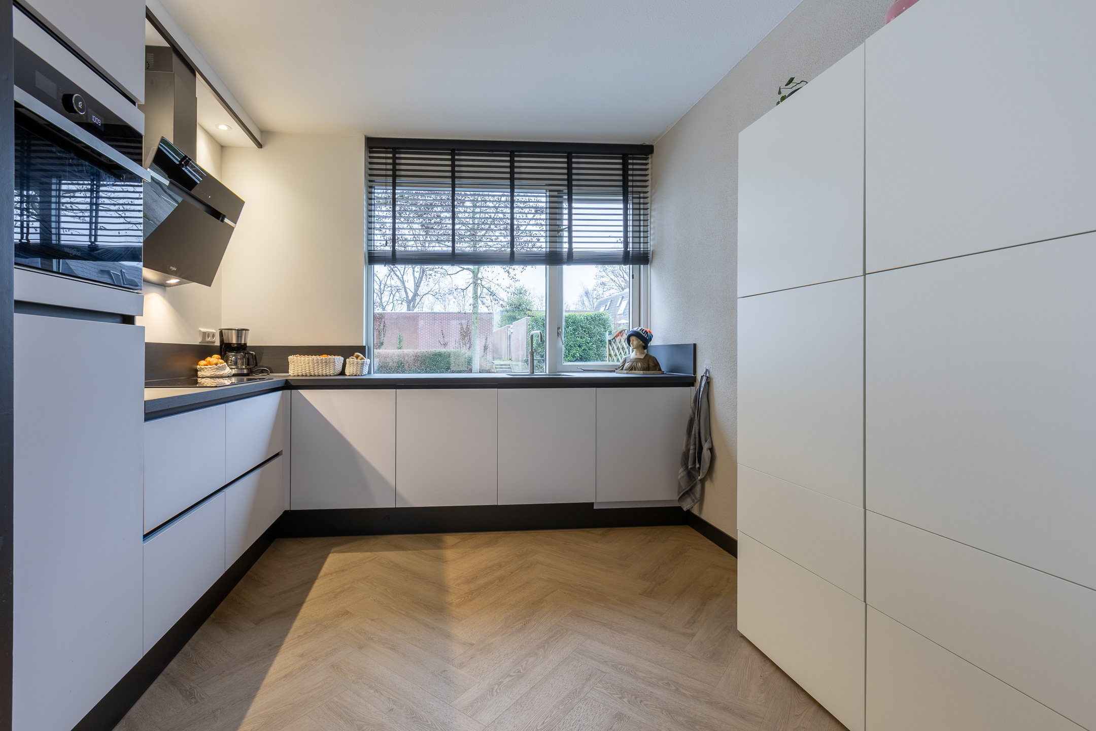 De moderne open keuken (2024) is gelegen aan de voorzijde en voorzien van diverse inbouwapparatuur, waaronder een inductiekookplaat, vaatwasmachine, koelkast, vriezer, combi magnetron/oven, afzuigkap en een cooker. Daarnaast is er een losse kastenwand aanwezig voor extra bergruimte.