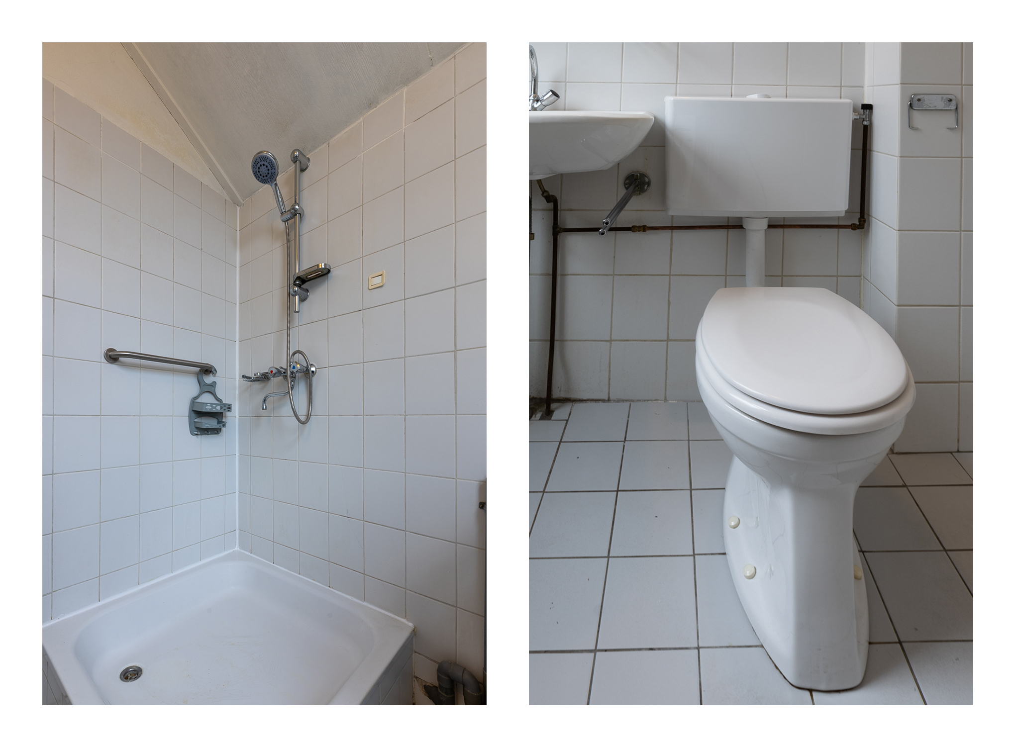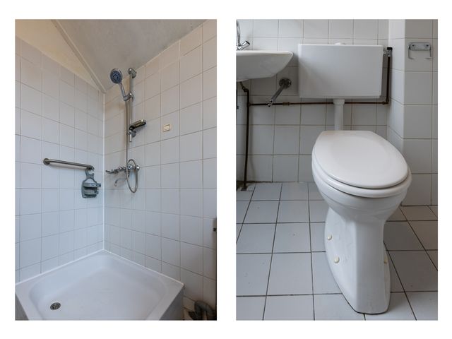 De badkamer is volledig betegeld en voorzien van een douche, toilet en een wastafelmeubel.