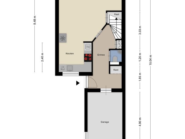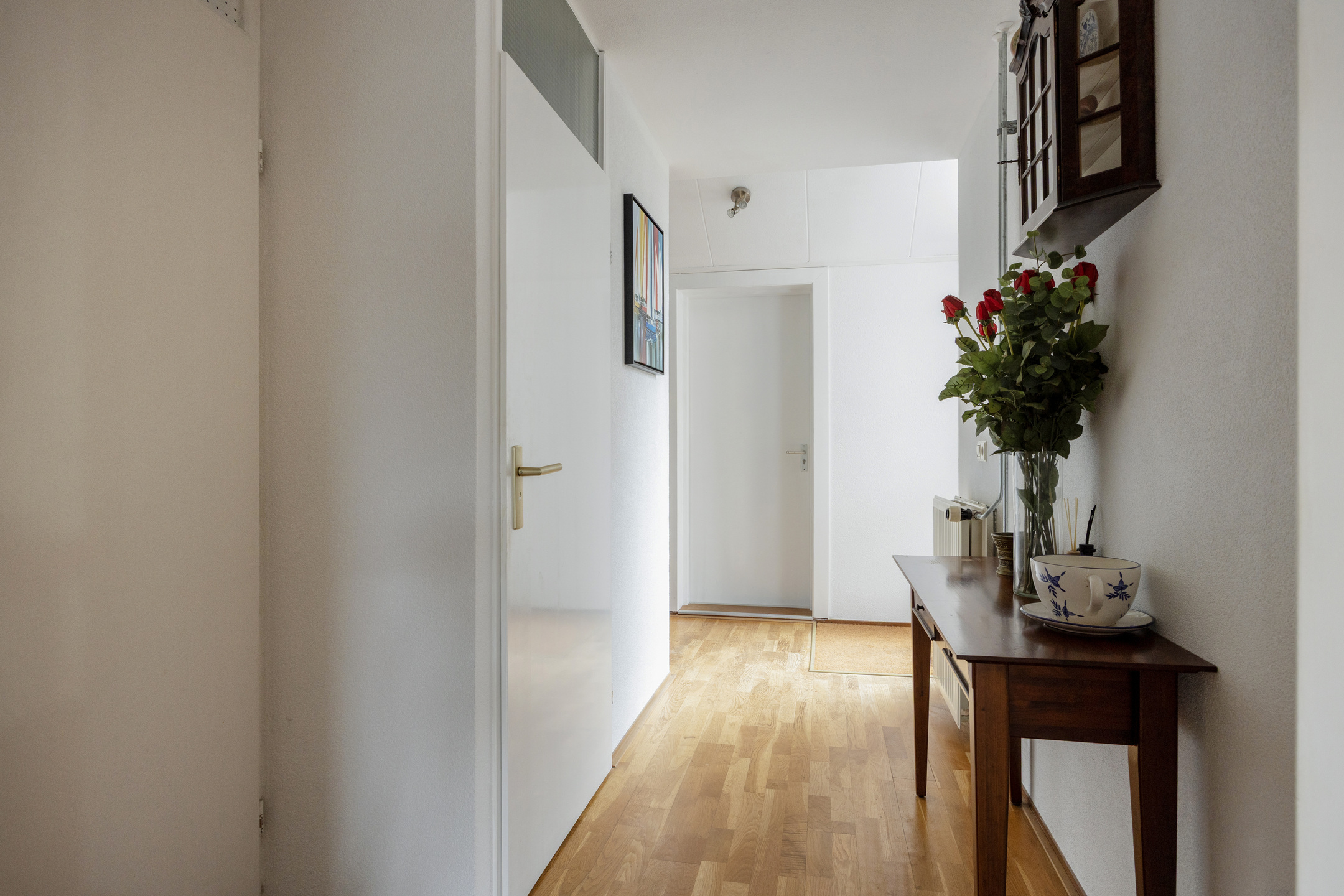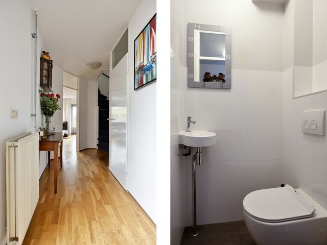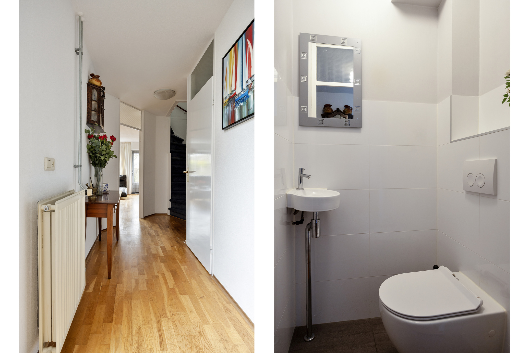 Hal met houten vloer die toegang biedt tot de garage, de deels betegelde toiletruimte met toilet en fonteintje, de meterkast, de woonkamer met open keuken en de trapopgang naar de eerste verdieping.