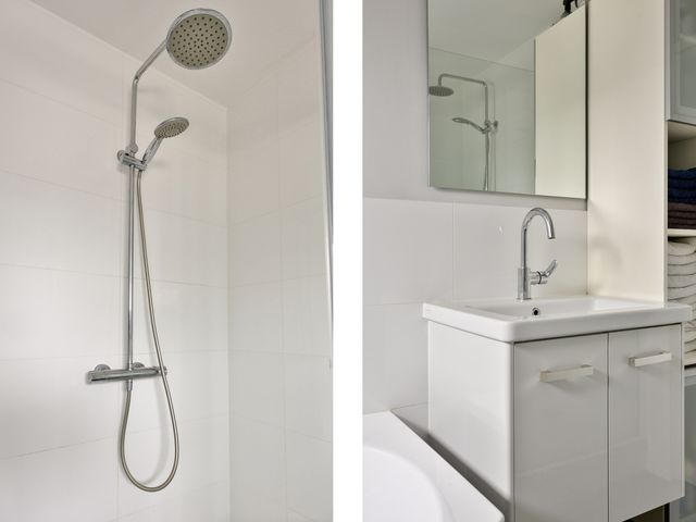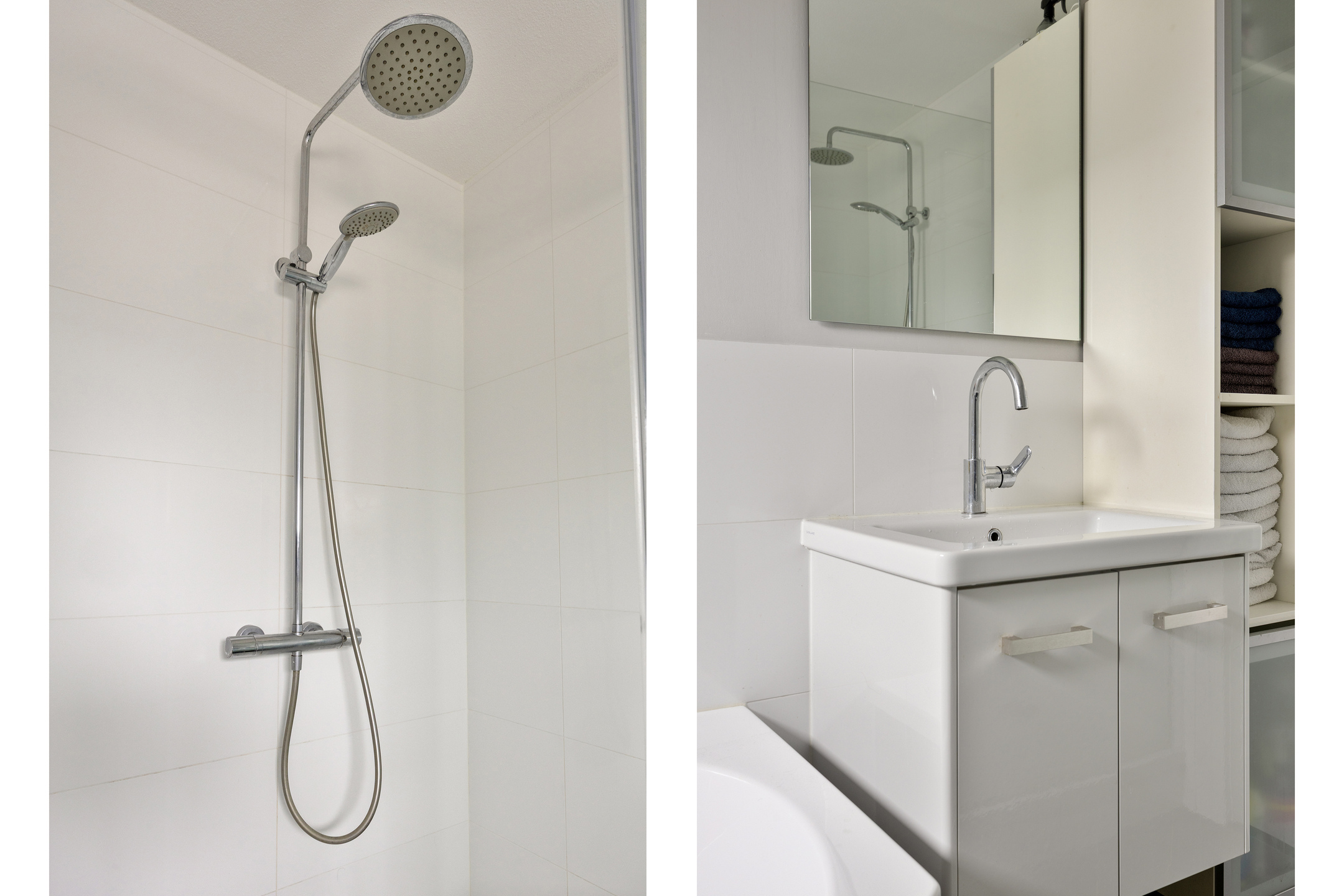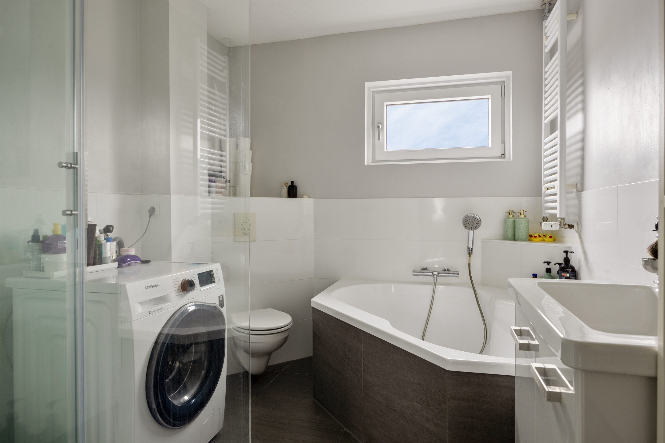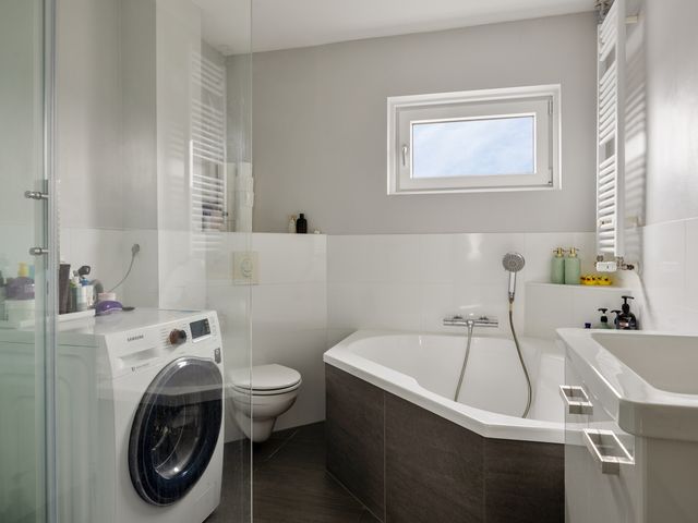 De moderne badkamer is uitgerust met een ligbad, douche, toilet, wastafel en een aansluiting voor de wasmachine.